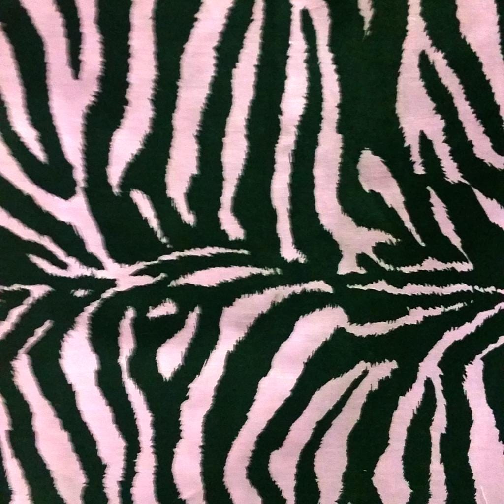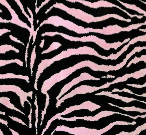This fabric features a bold pink and black zebra stripe pattern. It is a polycotton blend, composed of 50% cotton and 50% polyester, offering a balance of natural fiber comfort and synthetic durability. The fabric has a width of 58 inches and exhibits no stretch, making it suitable for applications where a stable, non-yielding material is desired. Its smooth finish highlights the crisp lines of the zebra print.