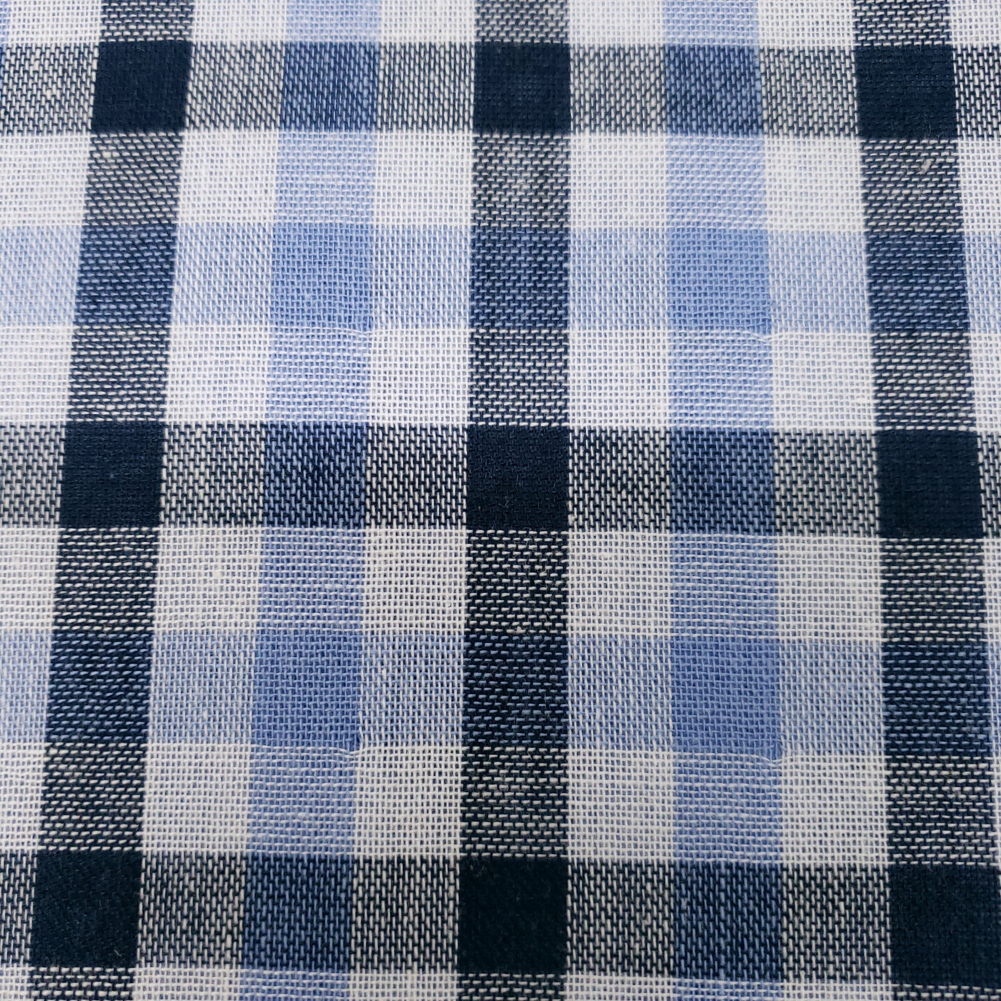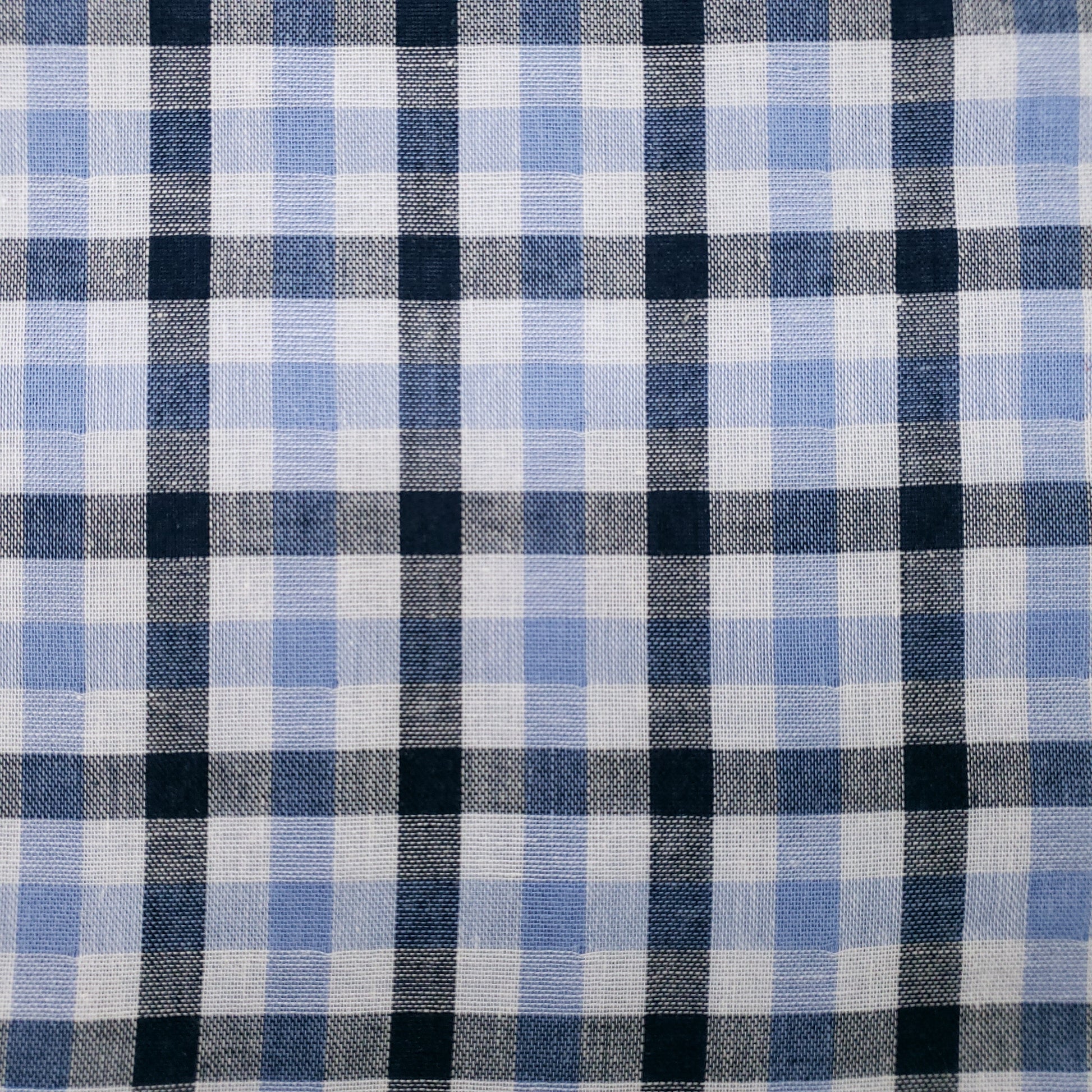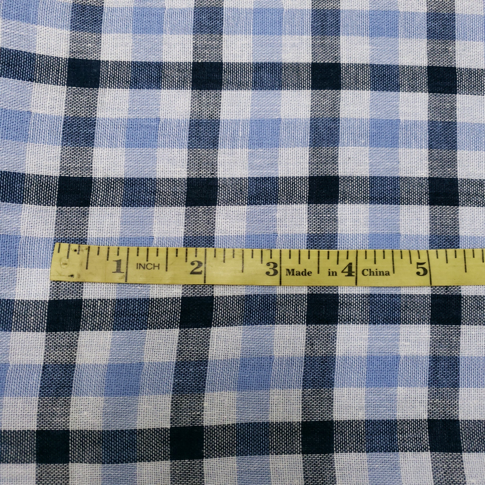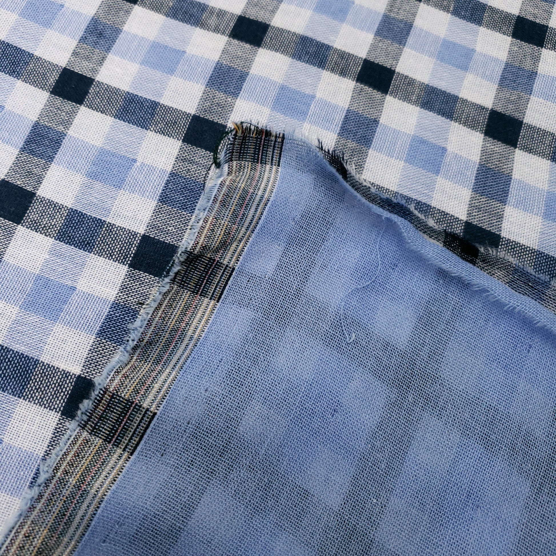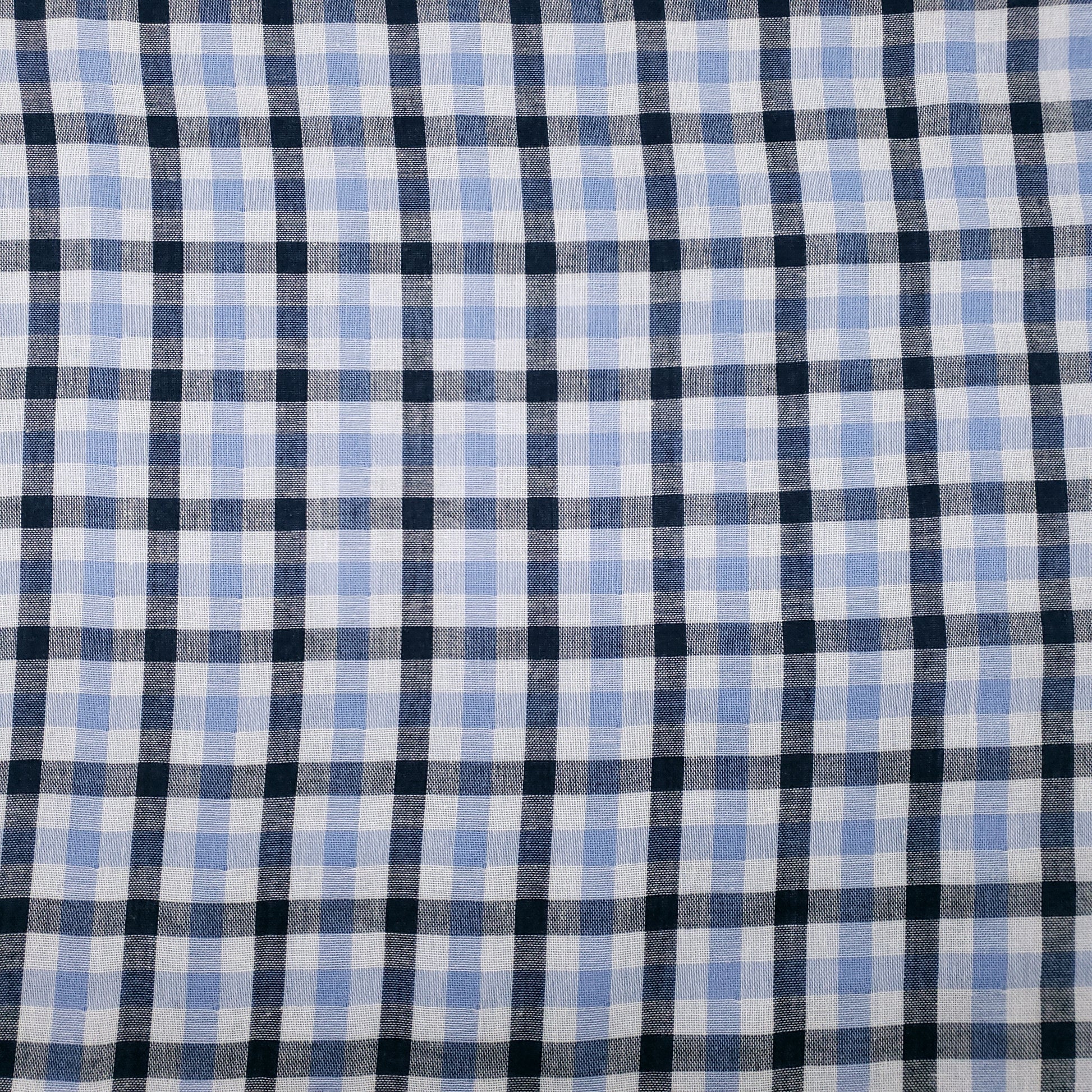This pre-lined cotton fabric features a gingham style check in white navy and light blue. The front facing side portrays a gingham check pattern in blue, navy blue and white. This fabric features a back lining. The back lining is a solid color light blue. The lining is adhered with thin threads through.