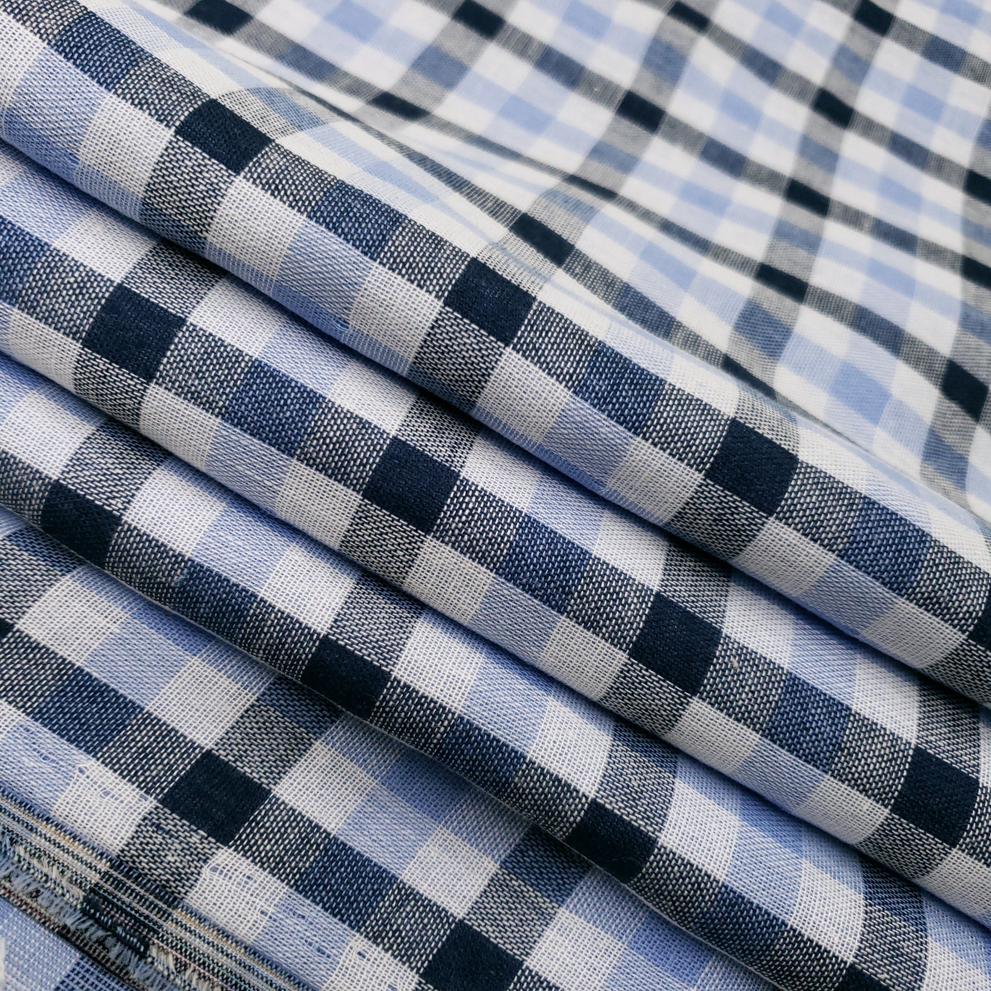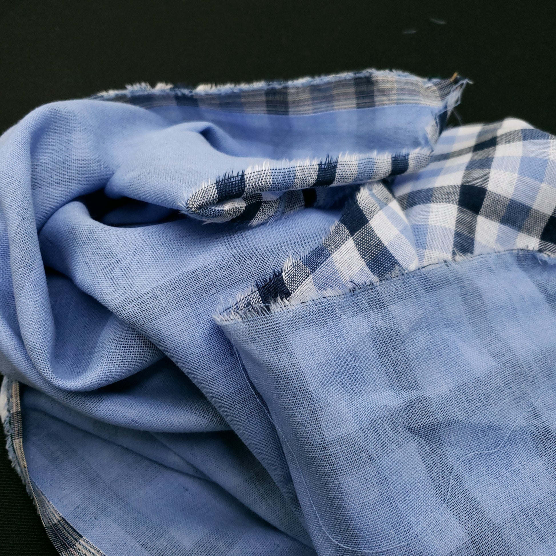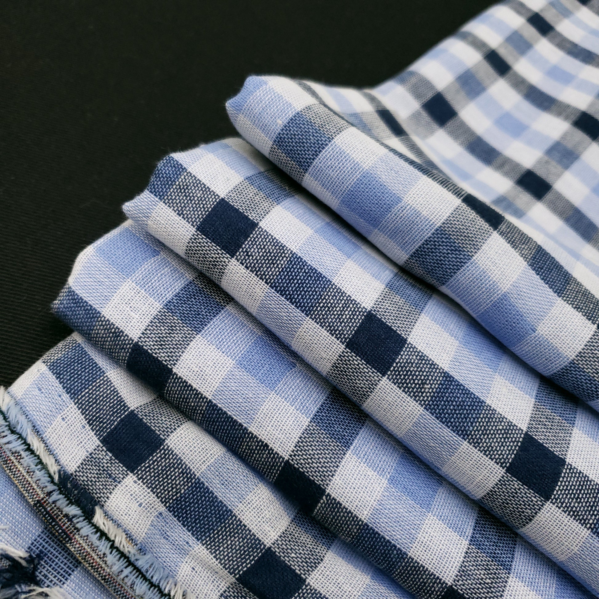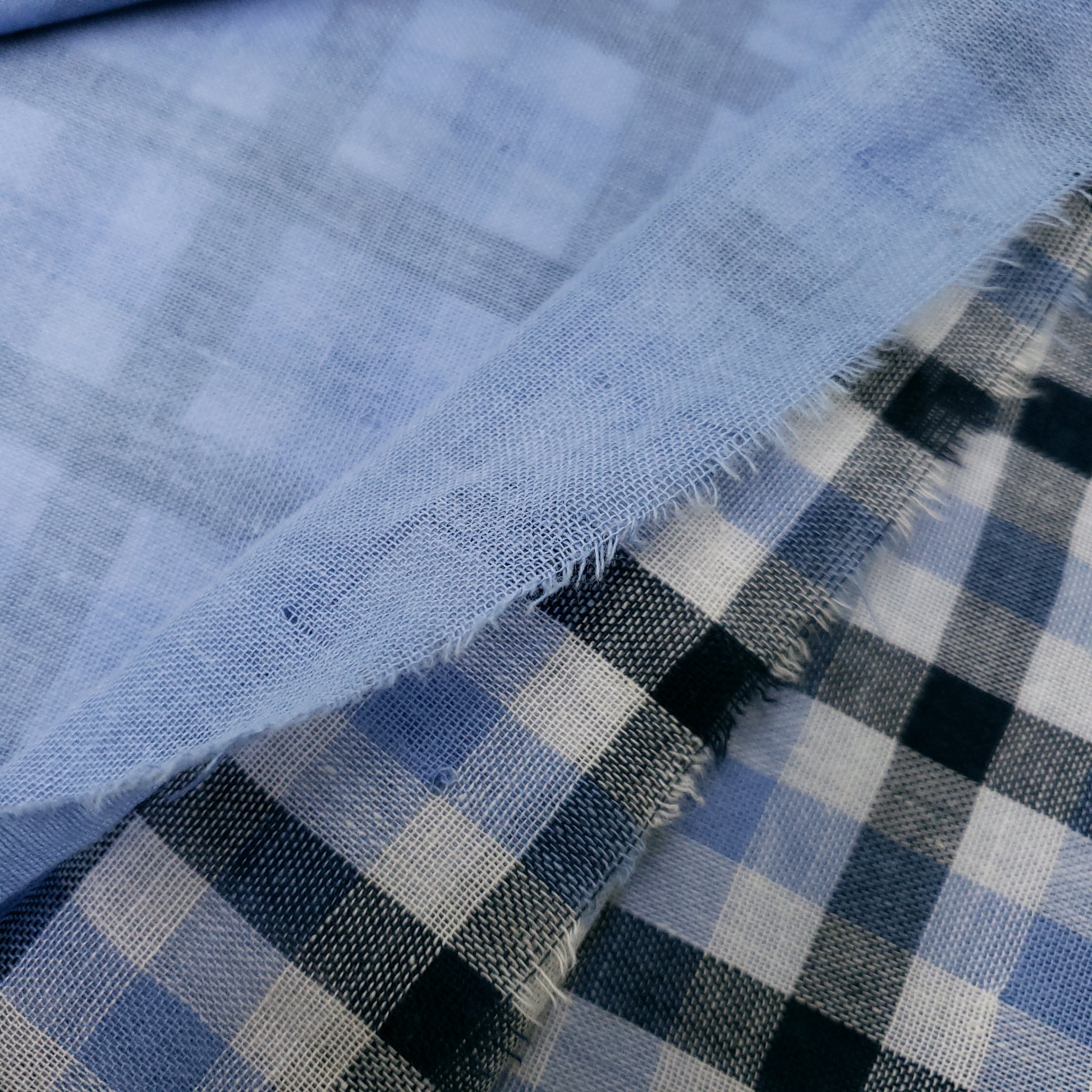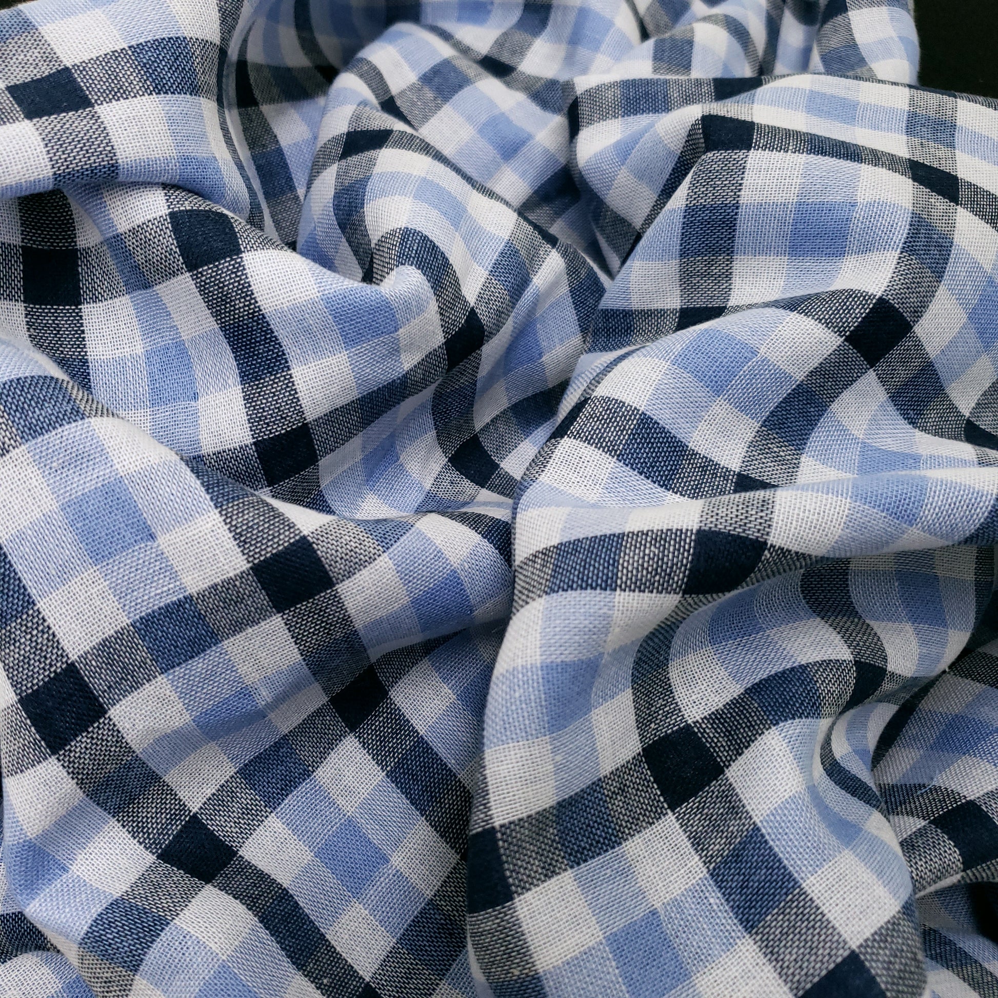 This pre-lined cotton fabric features a gingham style check in white navy and light blue. The front facing side portrays a gingham check pattern in blue, navy blue and white. This fabric features a back lining. The back lining is a solid color light blue. The lining is adhered with thin threads through.