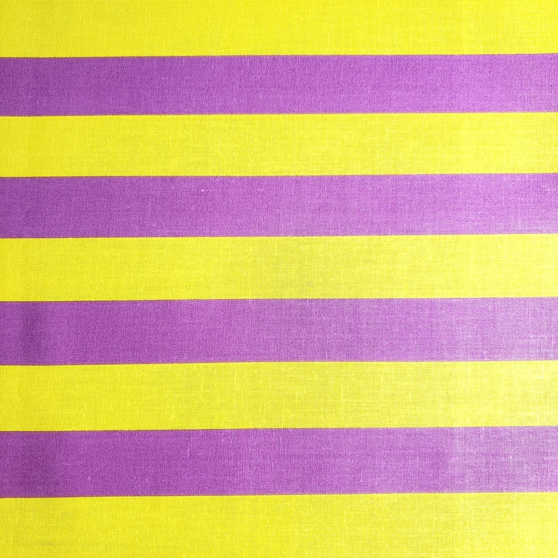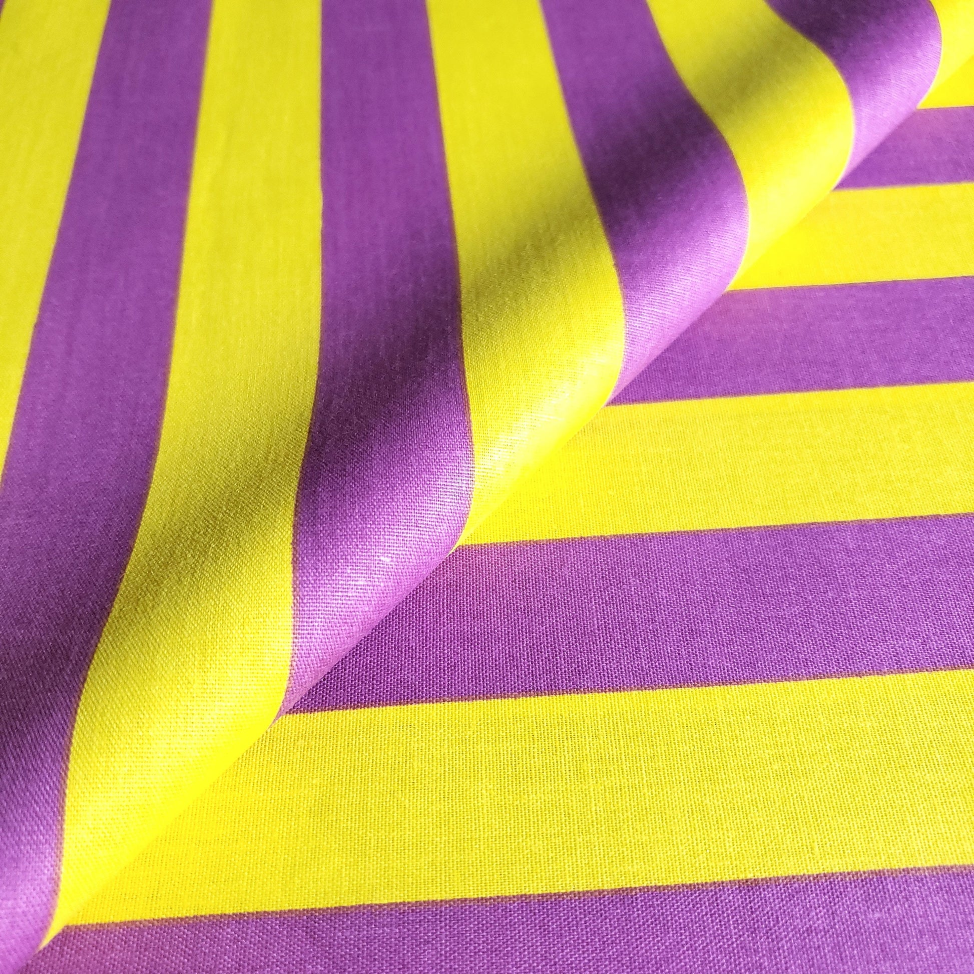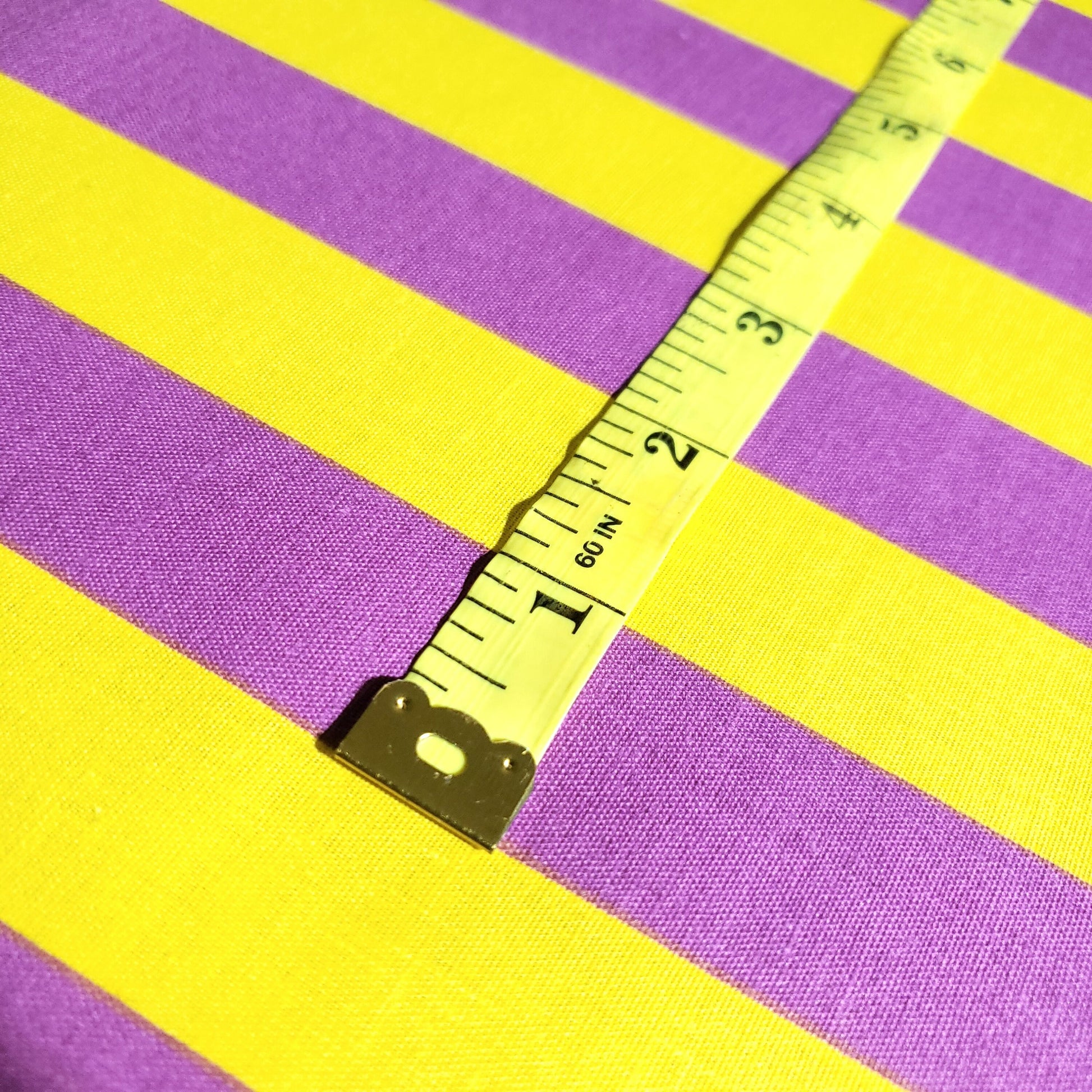 This fabric showcases one-inch stripes in purple and yellow running along its length. Made from a lightweight cotton blend, it offers excellent breathability and a smooth drape, making it ideal for a variety of sewing applications.