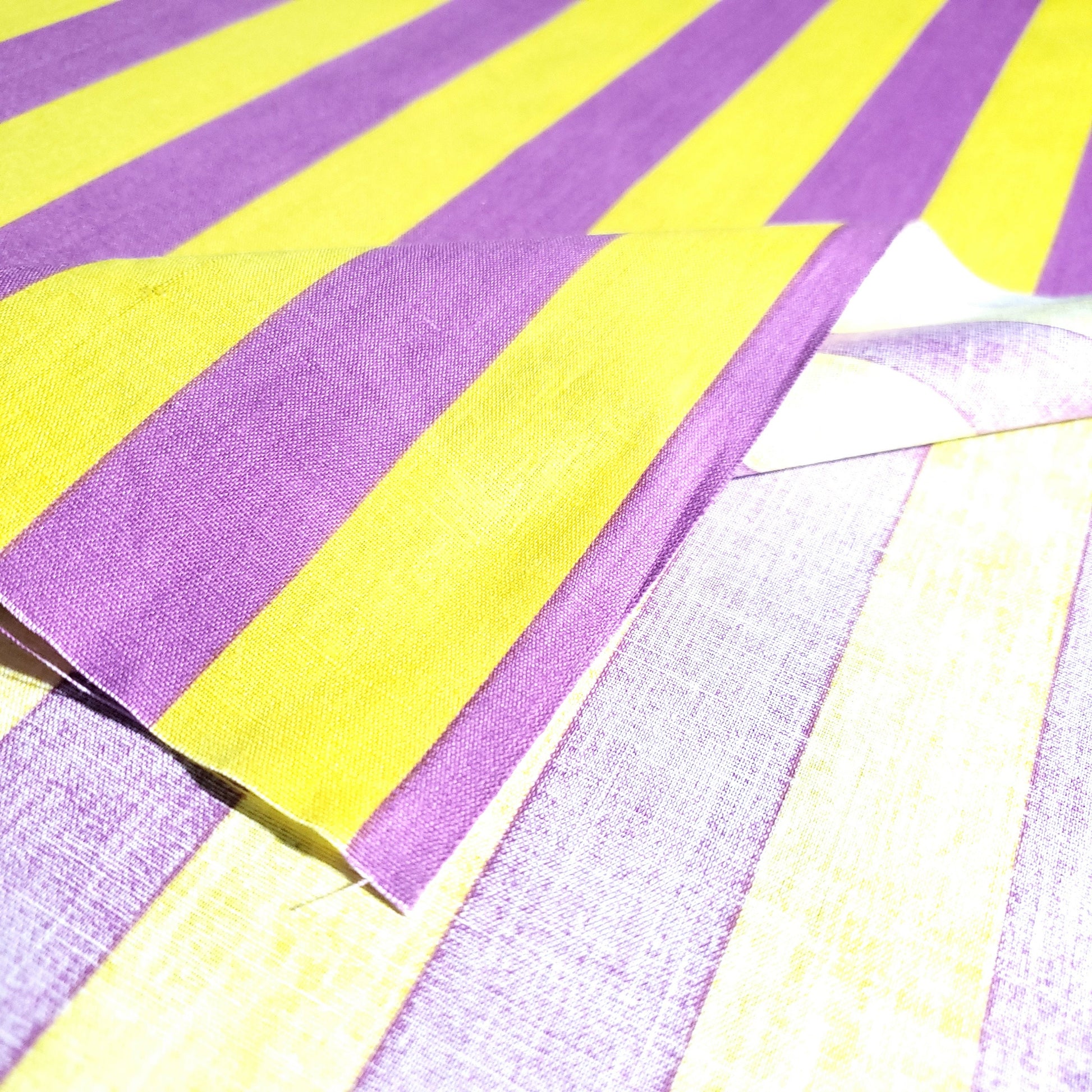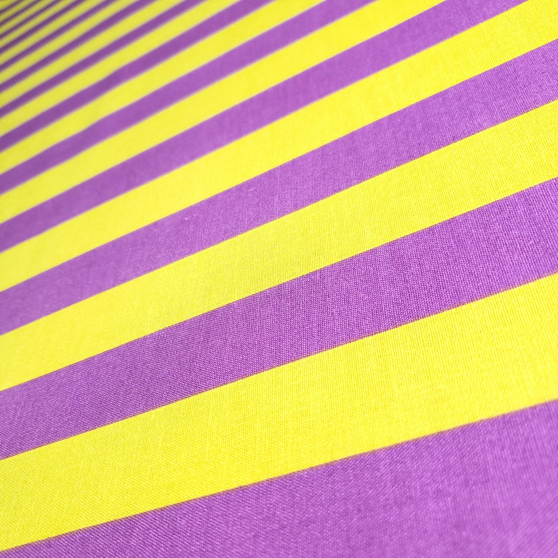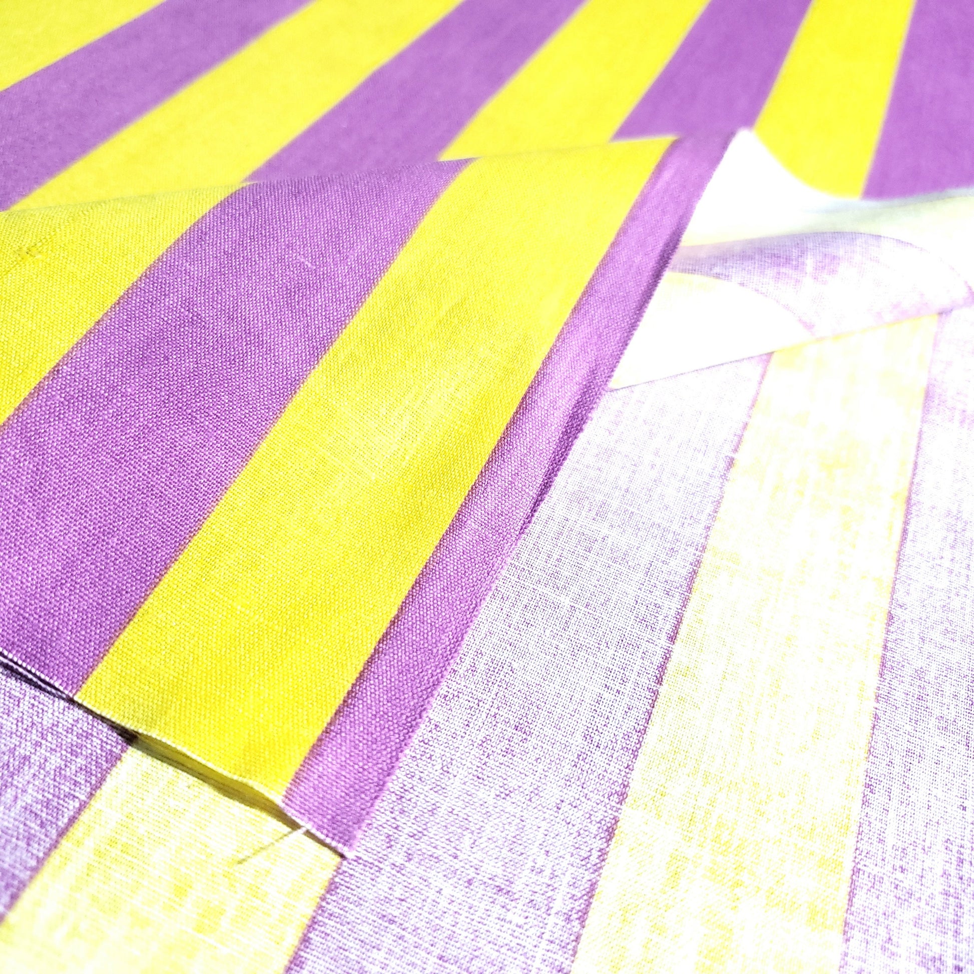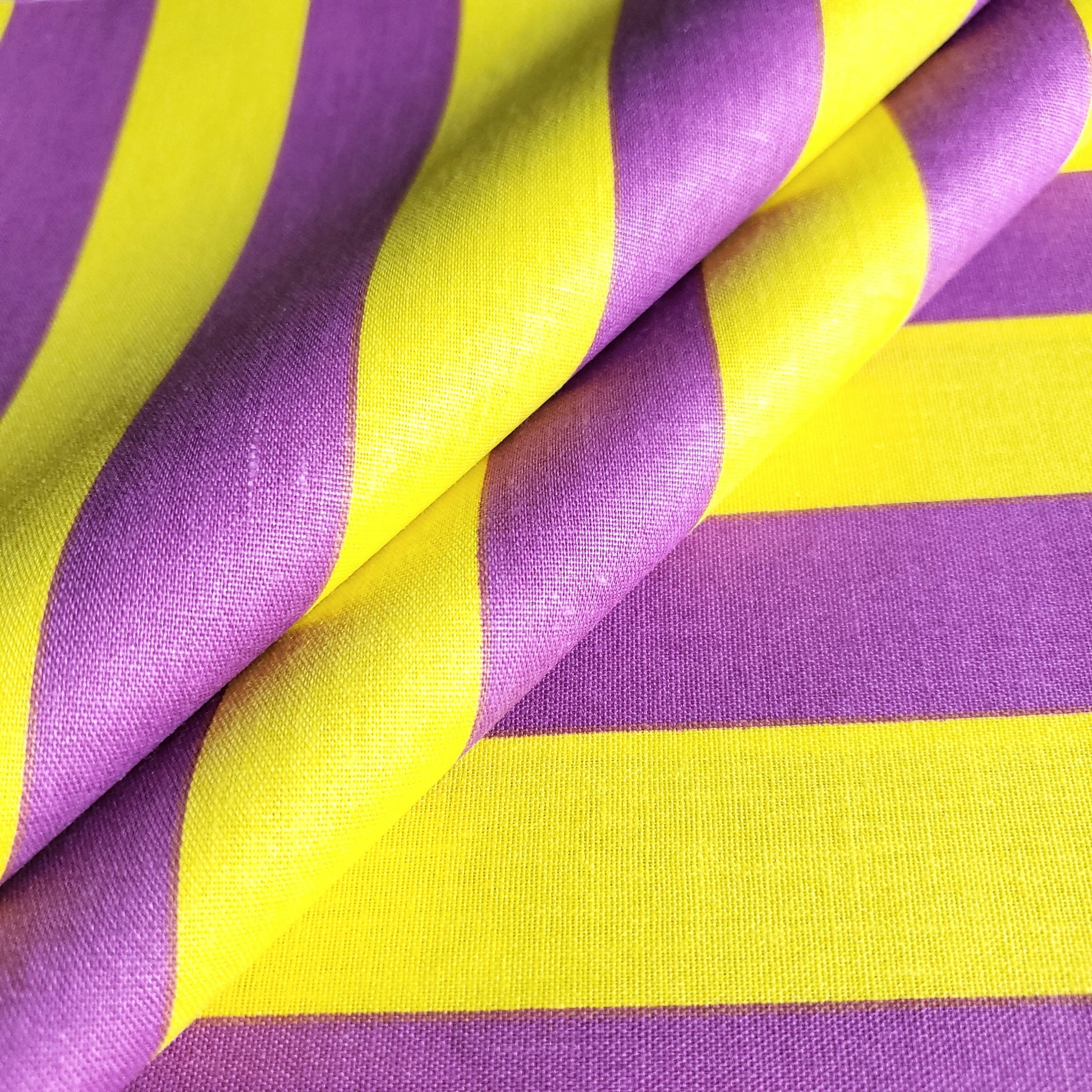 This fabric showcases one-inch stripes in purple and yellow running along its length. Made from a lightweight cotton blend, it offers excellent breathability and a smooth drape, making it ideal for a variety of sewing applications.
