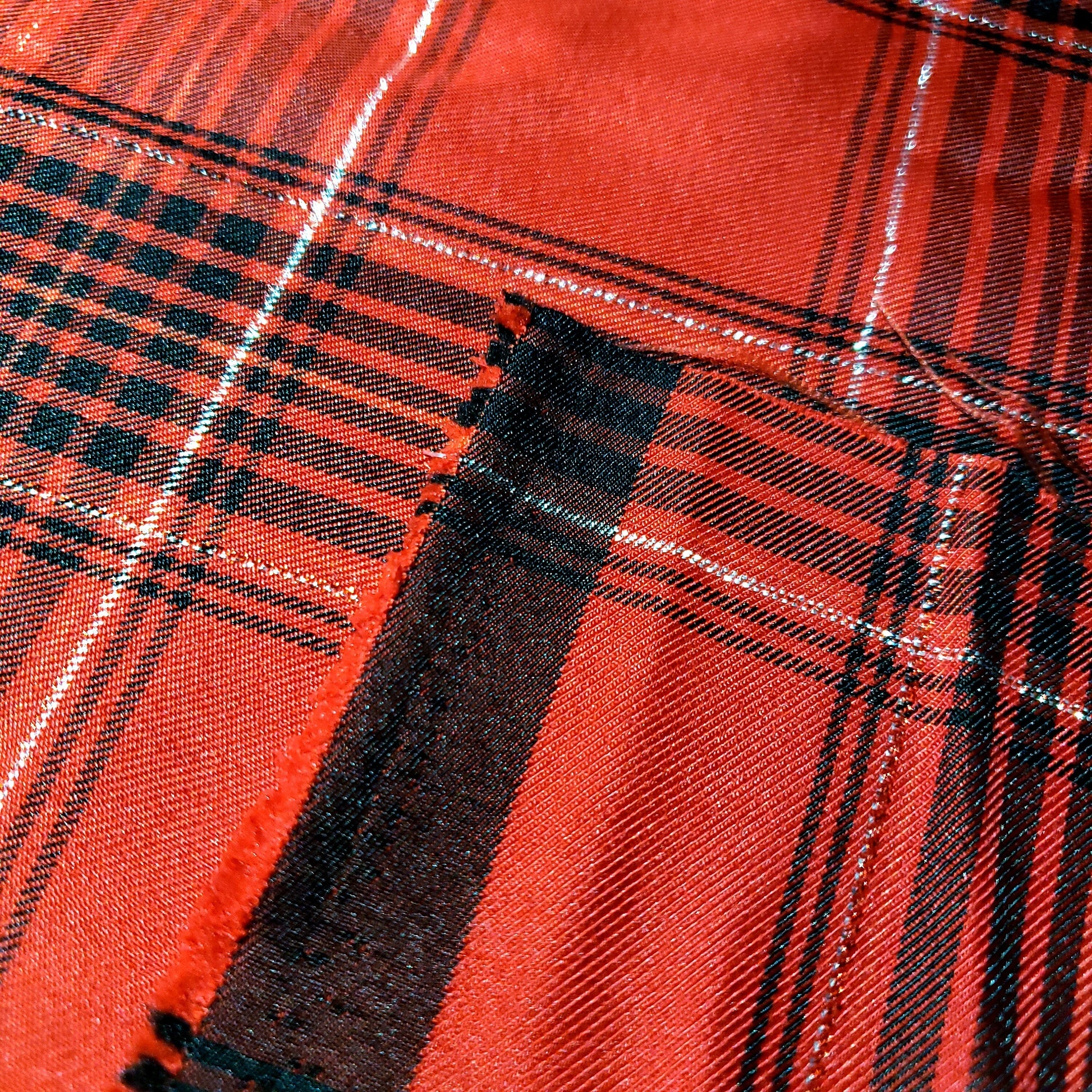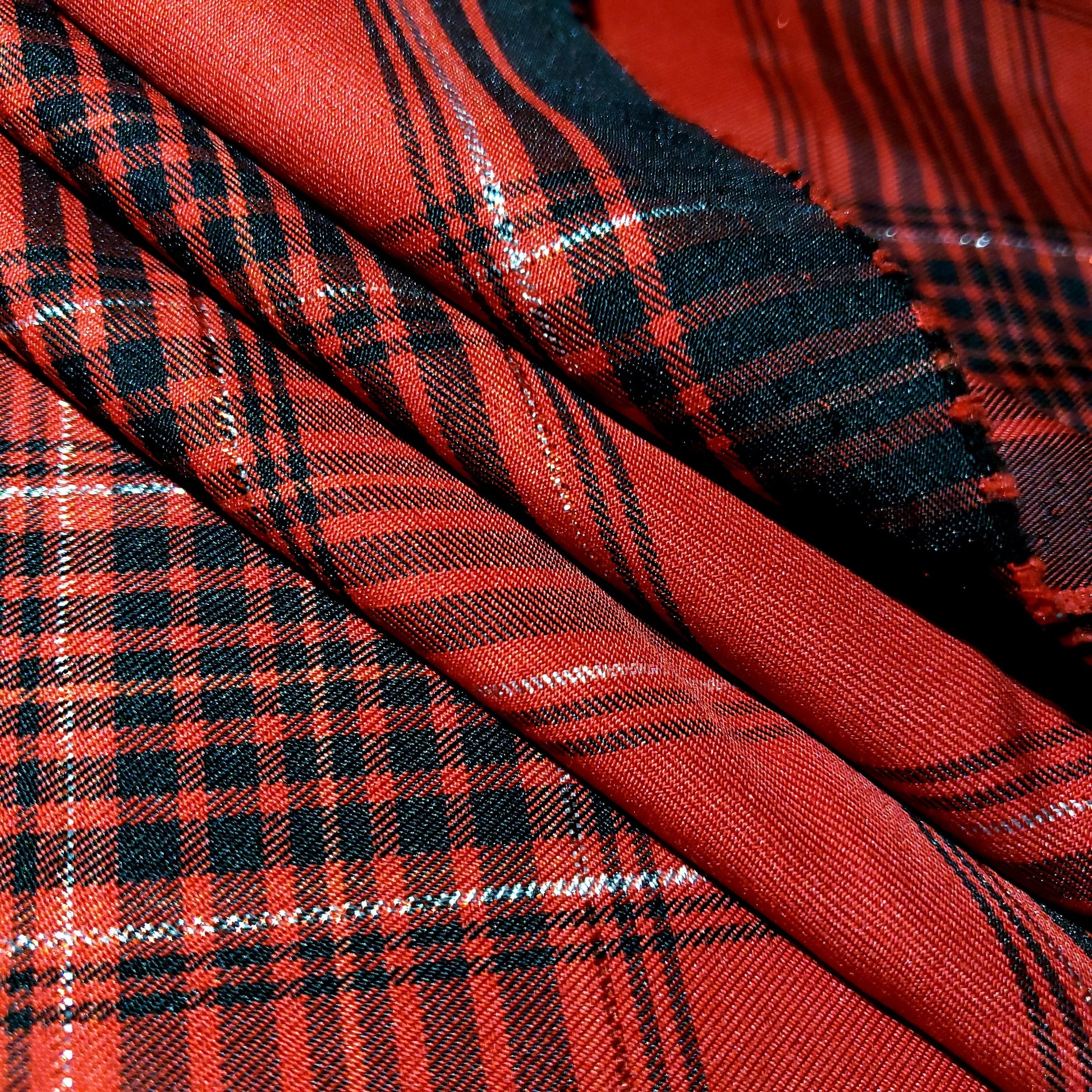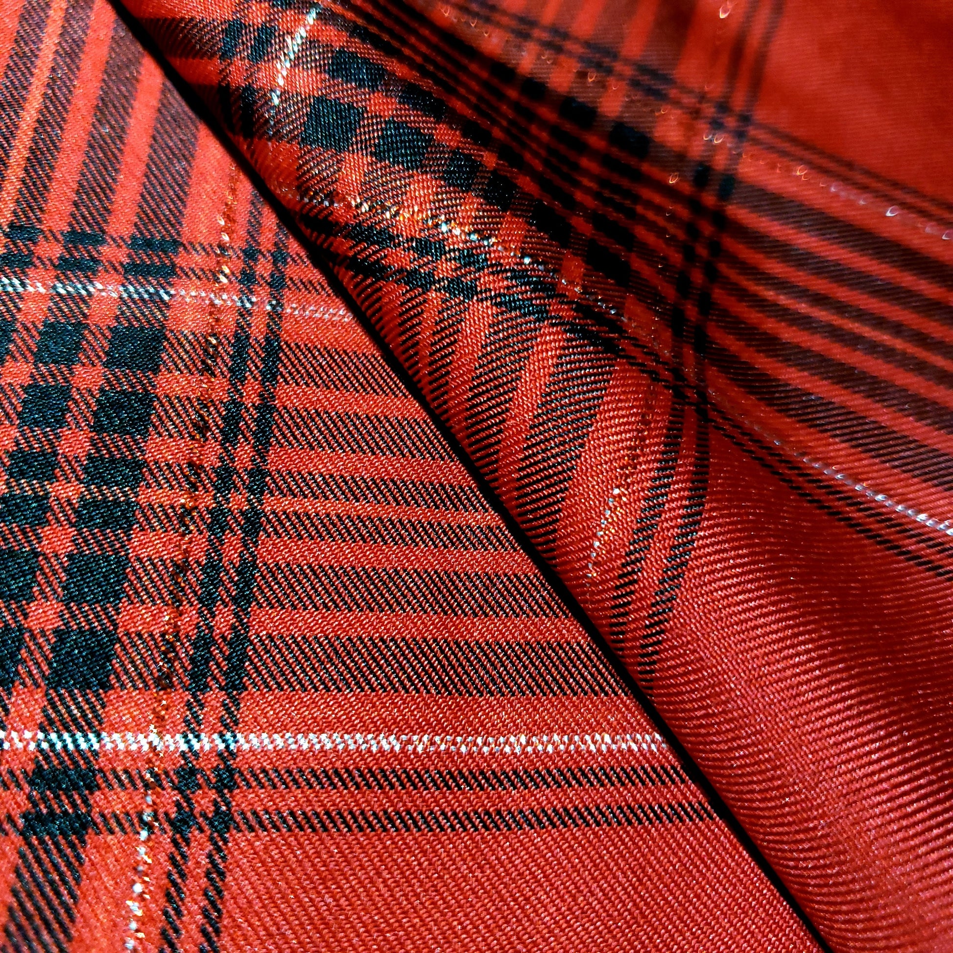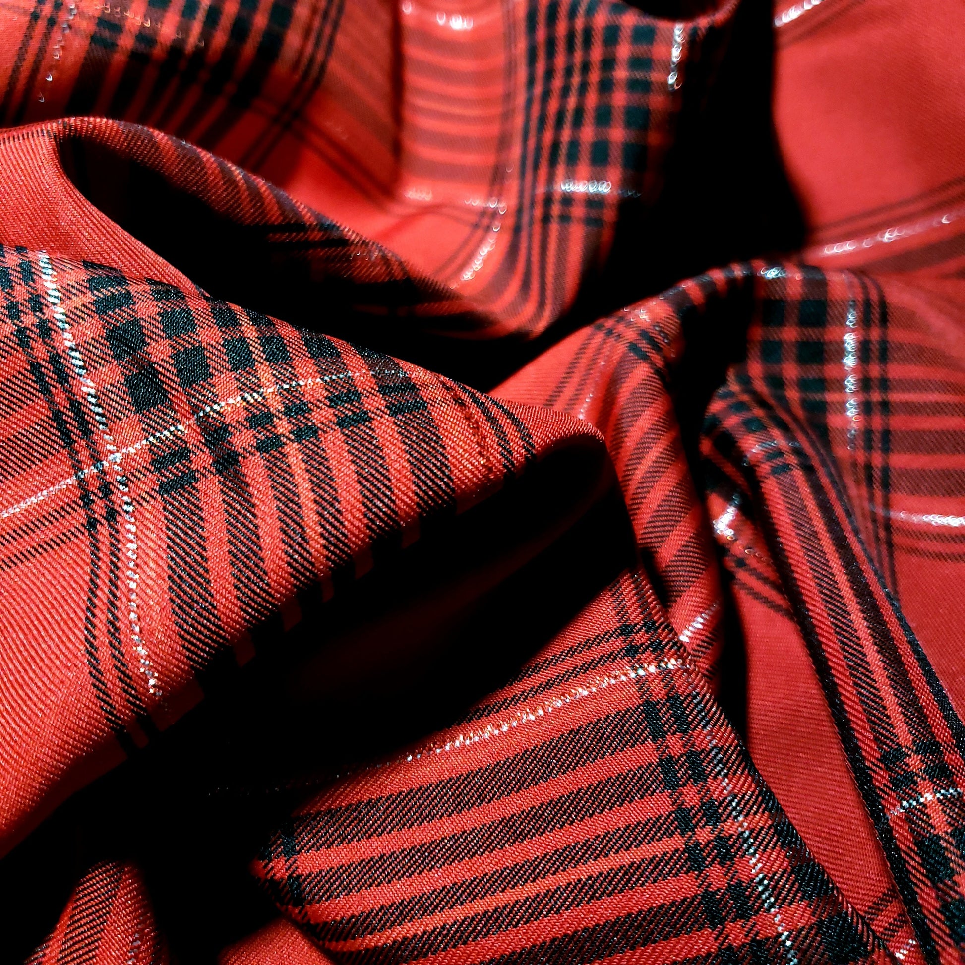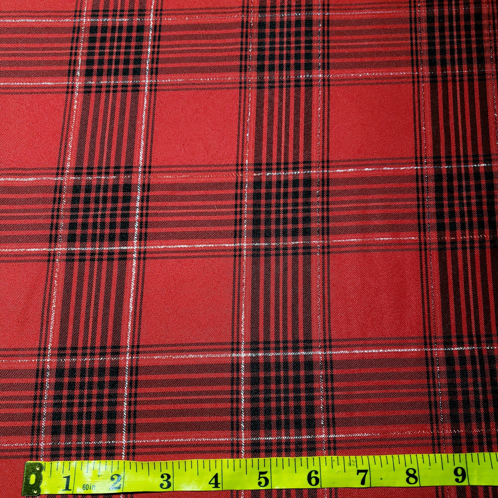 This unique poplin fabric features a holiday inspired design in red black and metallic silver. It has a light weigh with a very good drape. Perfect for holiday decor. Fashion apparel. Holiday inspired crafts. Home decor and more.