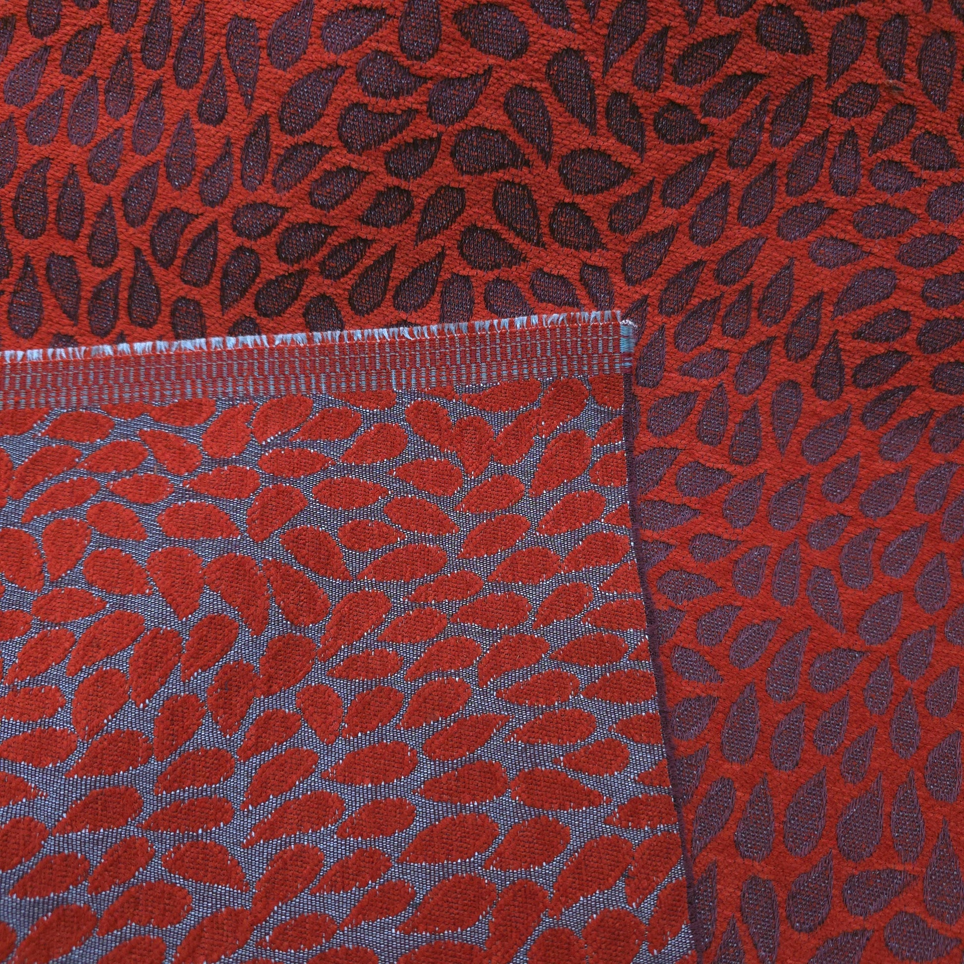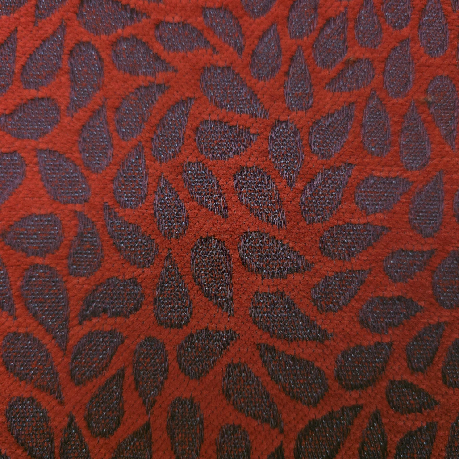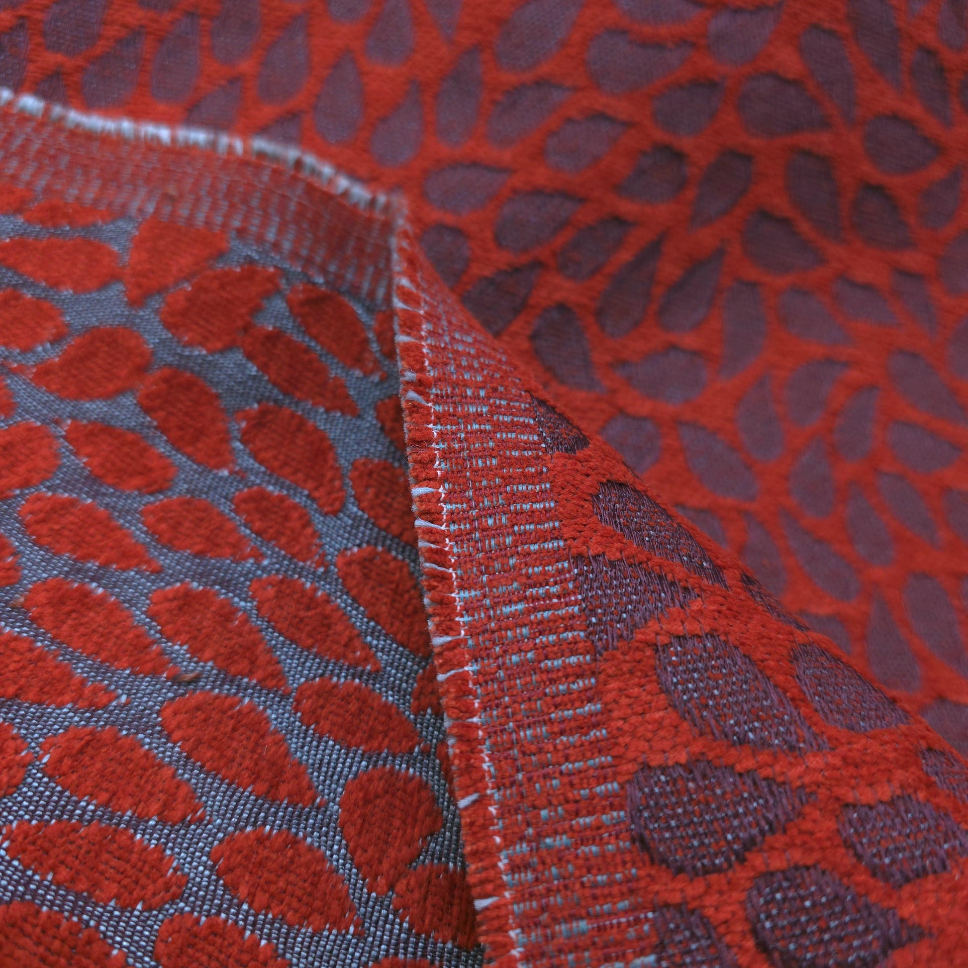 This is a reversible, woven chenille upholstery fabric. The design features a repeating, abstract pattern of leaf or teardrop shapes. The fabric offers two distinct looks. One side features a plush, red chenille background with the leaf shapes rendered in a finely woven, blue-gray thread. The reverse side inverts this arrangement, presenting textured red chenille leaf shapes on the blue-gray woven background. The fabrics photographs as bluer than the appearance in person. It is closer to a steel gray with a blue tinge. Samples are available to test color. The red is a rich, saturated color. The contrasting color is a mix of blue and gray threads that results in a heathered, blue-gray or slate-like appearance. The material is a medium to heavy weight, providing a durable and substantial feel suitable for a variety of applications. Its woven jacquard construction creates the integrated, reversible pattern and contributes to its durability.