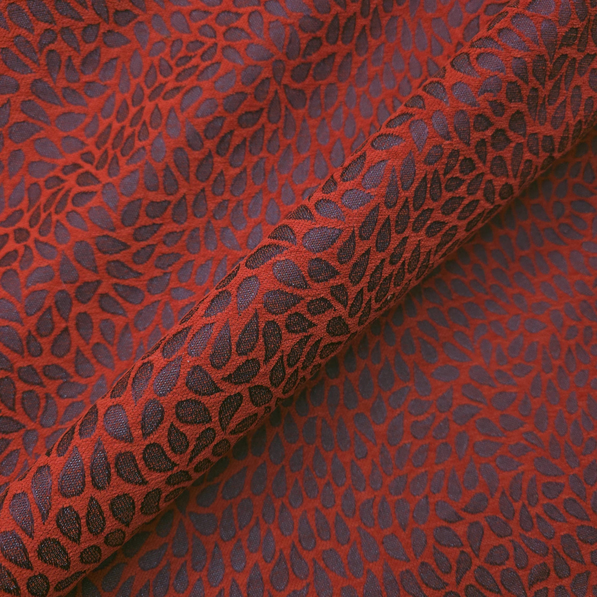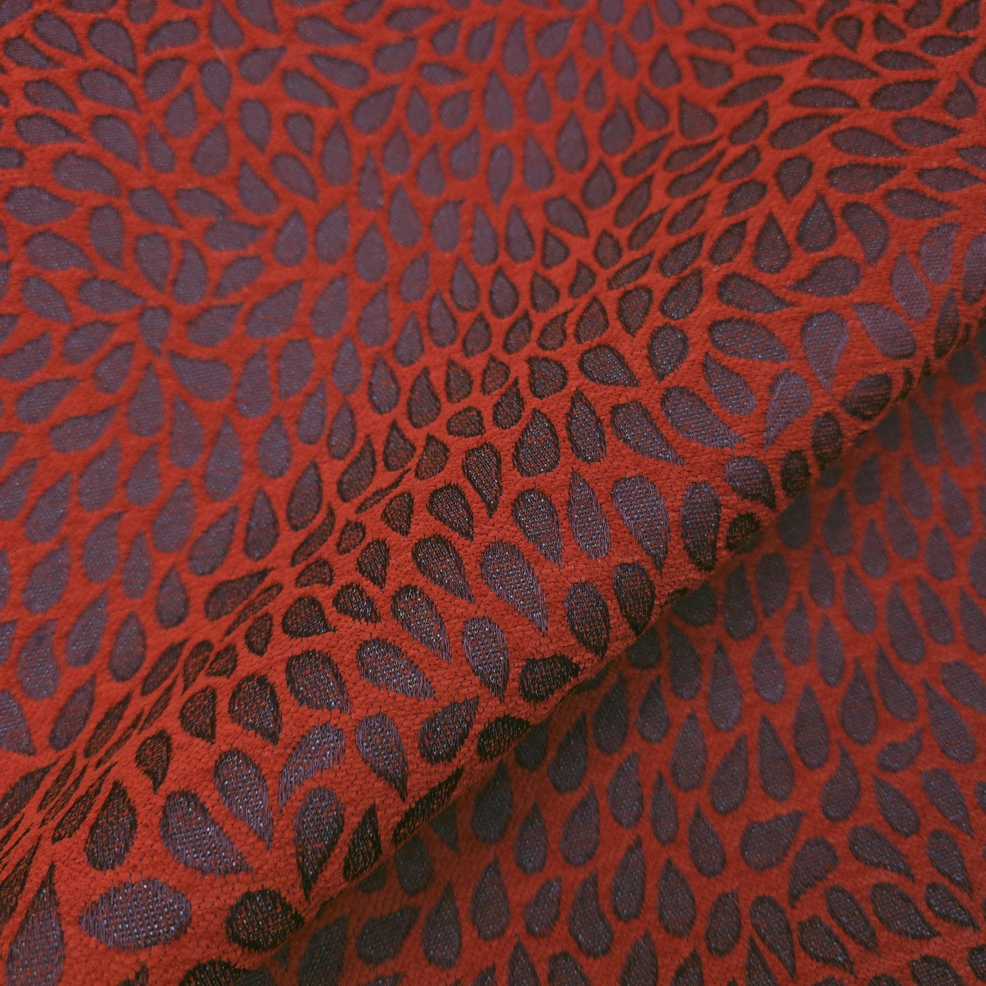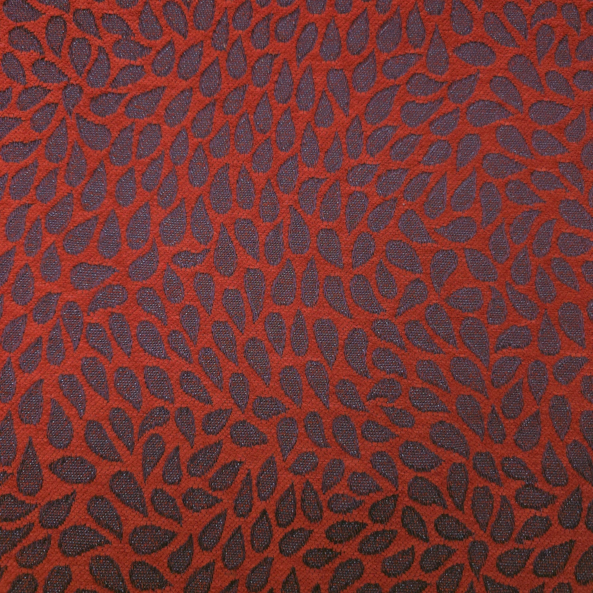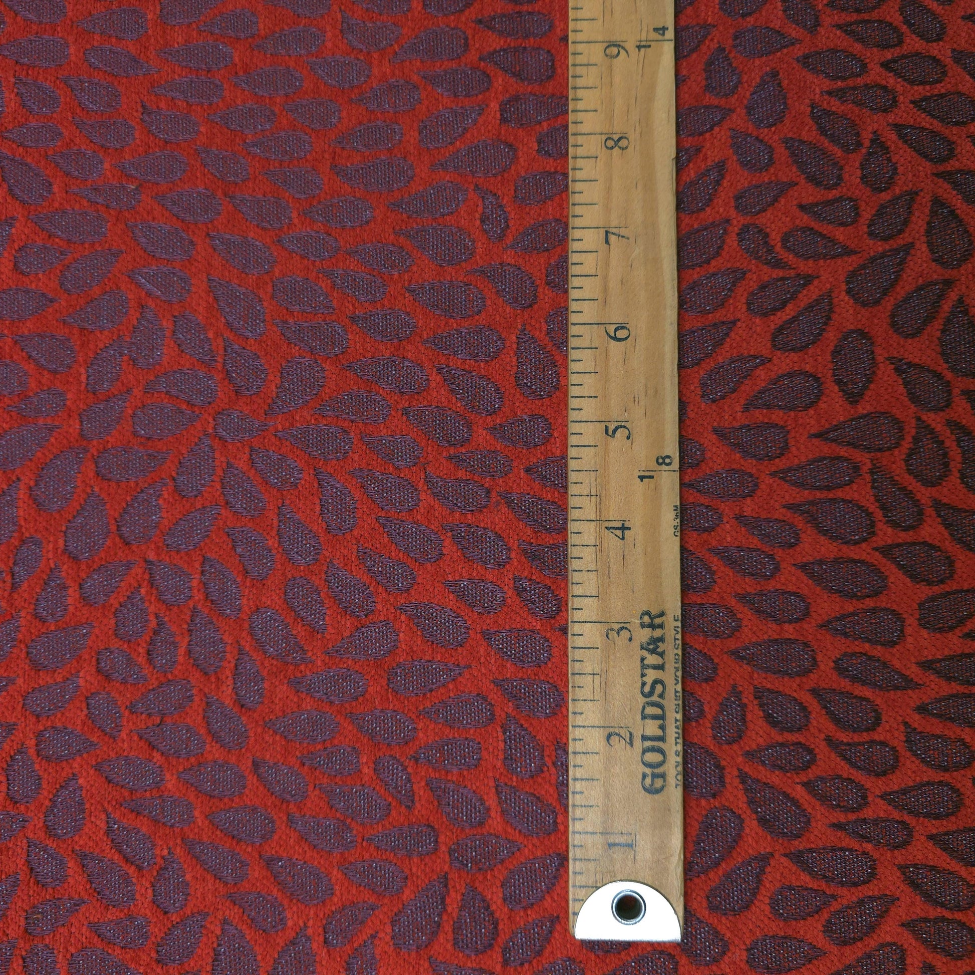 This is a reversible, woven chenille upholstery fabric. The design features a repeating, abstract pattern of leaf or teardrop shapes. The fabric offers two distinct looks. One side features a plush, red chenille background with the leaf shapes rendered in a finely woven, blue-gray thread. The reverse side inverts this arrangement, presenting textured red chenille leaf shapes on the blue-gray woven background. The fabrics photographs as bluer than the appearance in person. It is closer to a steel gray with a blue tinge. Samples are available to test color. The red is a rich, saturated color. The contrasting color is a mix of blue and gray threads that results in a heathered, blue-gray or slate-like appearance. The material is a medium to heavy weight, providing a durable and substantial feel suitable for a variety of applications. Its woven jacquard construction creates the integrated, reversible pattern and contributes to its durability.