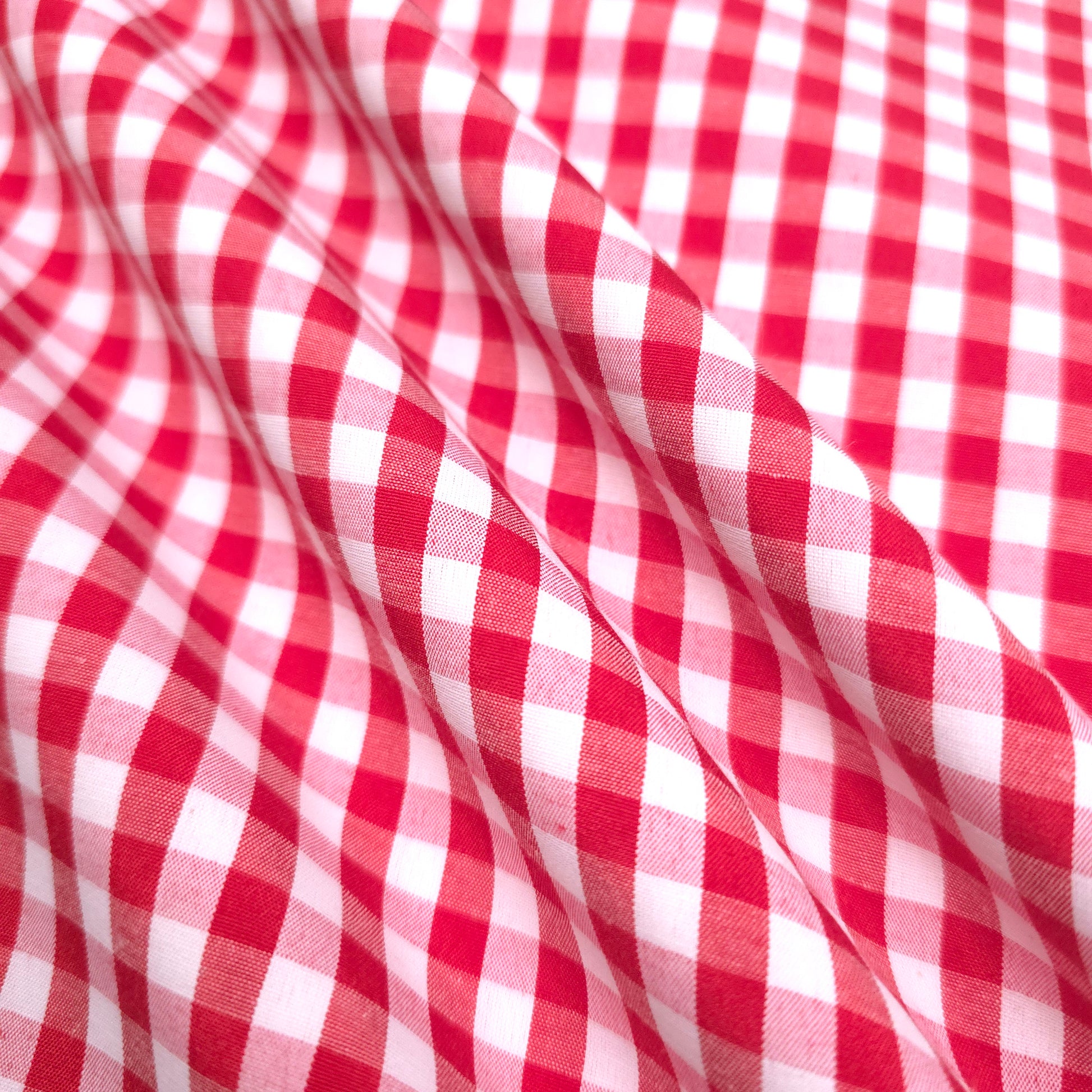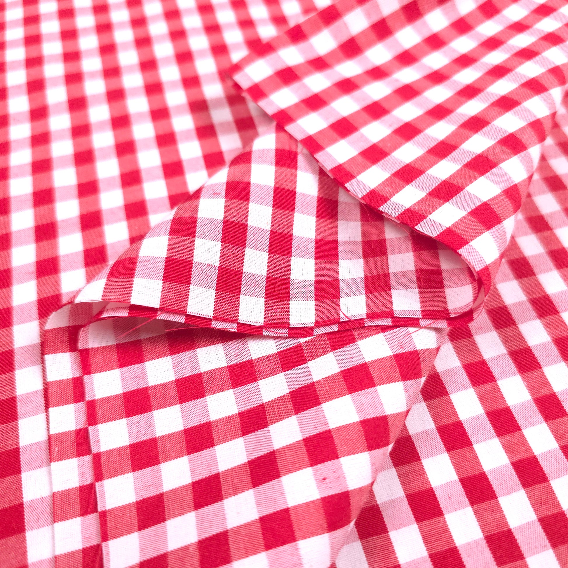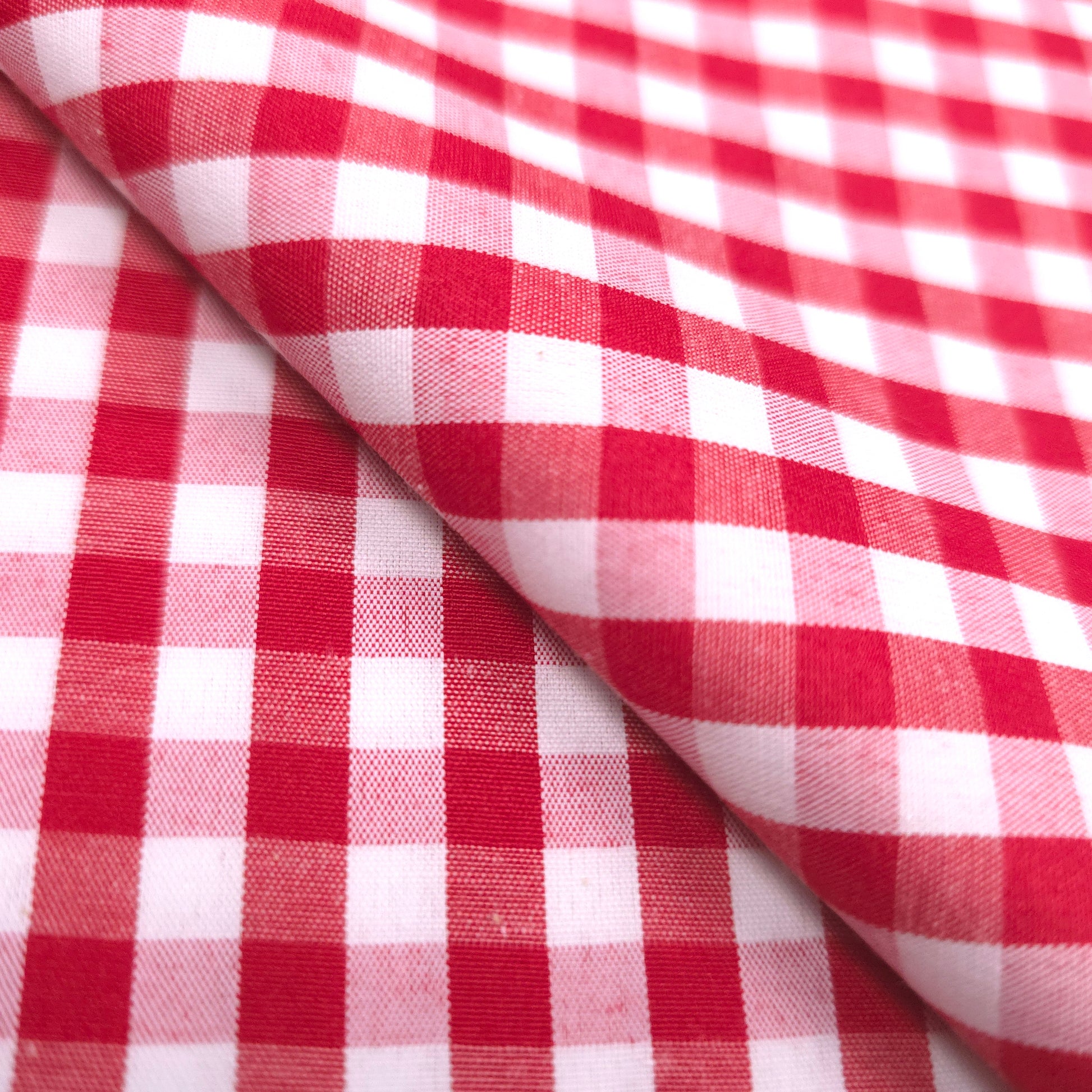 This fabric features a classic 1/4 inch red and white gingham pattern. Crafted from a durable 80/20 poly-cotton blend, this material offers the benefits of both fibers: the crispness and wrinkle-resistance of polyester with the soft, breathable touch of cotton. Its versatile light-to-medium weight and smooth finish are perfectly suited for a wide range of projects, from iconic picnic tablecloths and retro kitchen decor to charming apparel and holiday crafts. This no-stretch fabric is 58 inches wide and sold by the yard for all your creative needs.