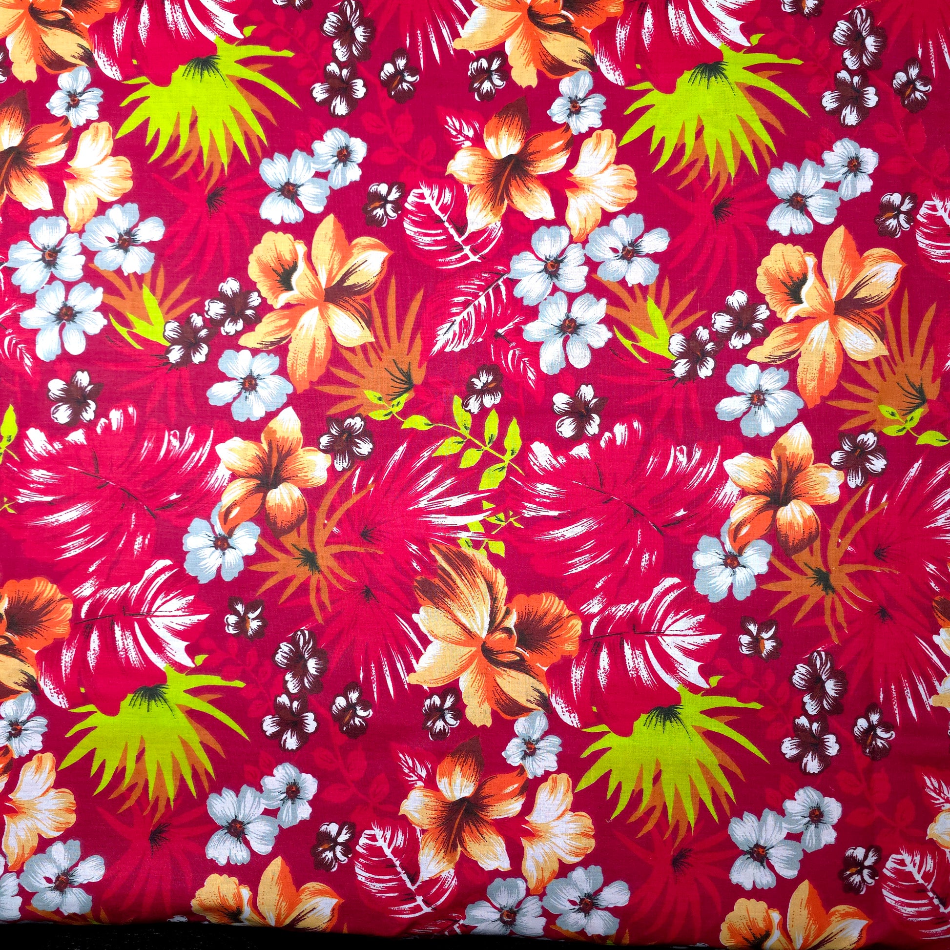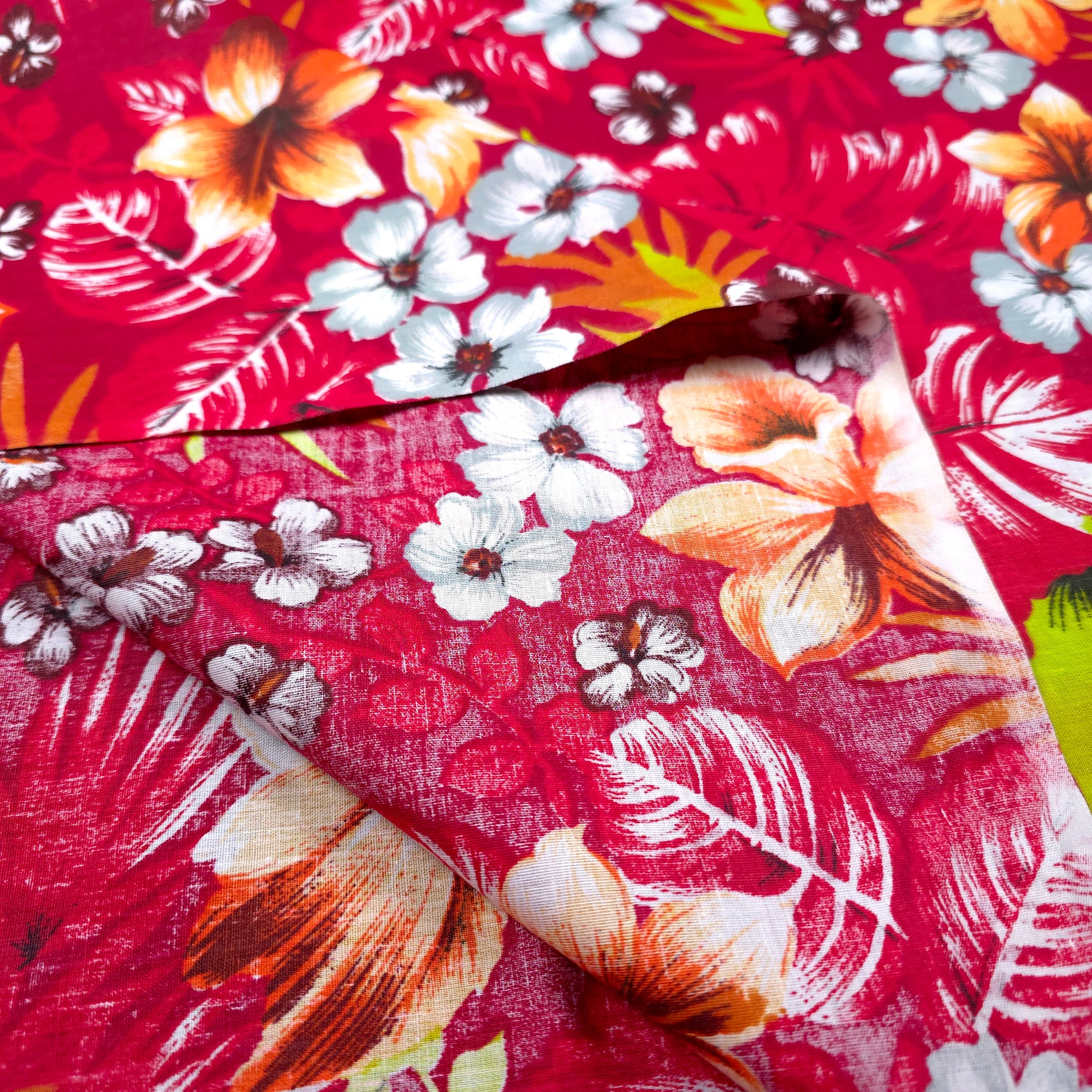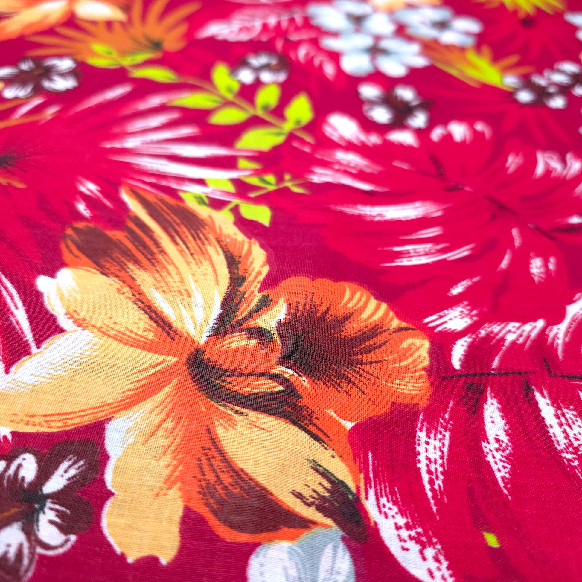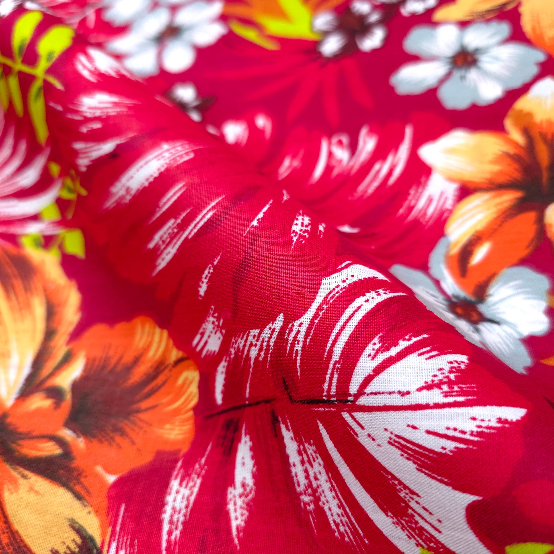 This fabric showcases a vibrant assortment of tropical Hawaiian flowers and leaves. Dominated by red, the design is enhanced with complementary shades of lime green, white, and orange. It measures 58 inches in width.
