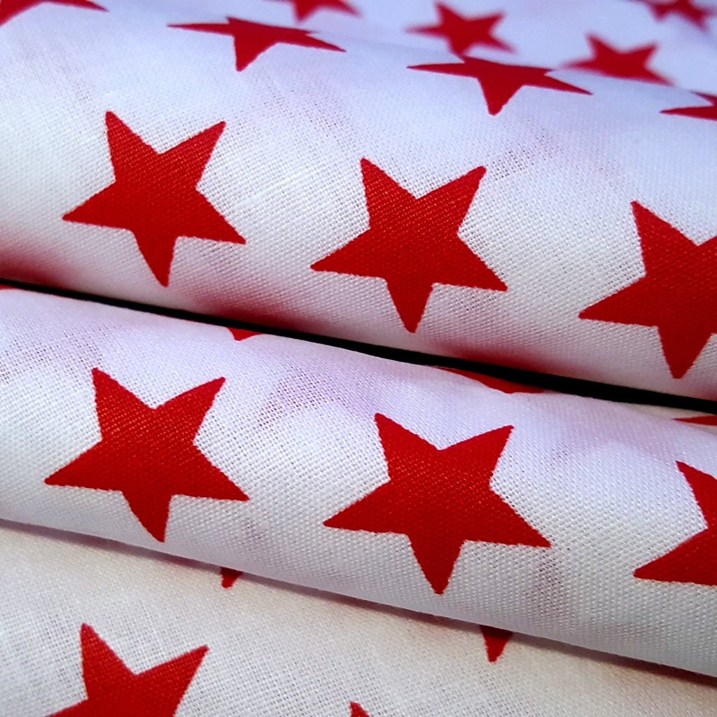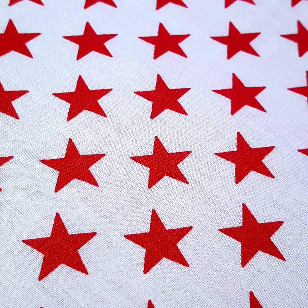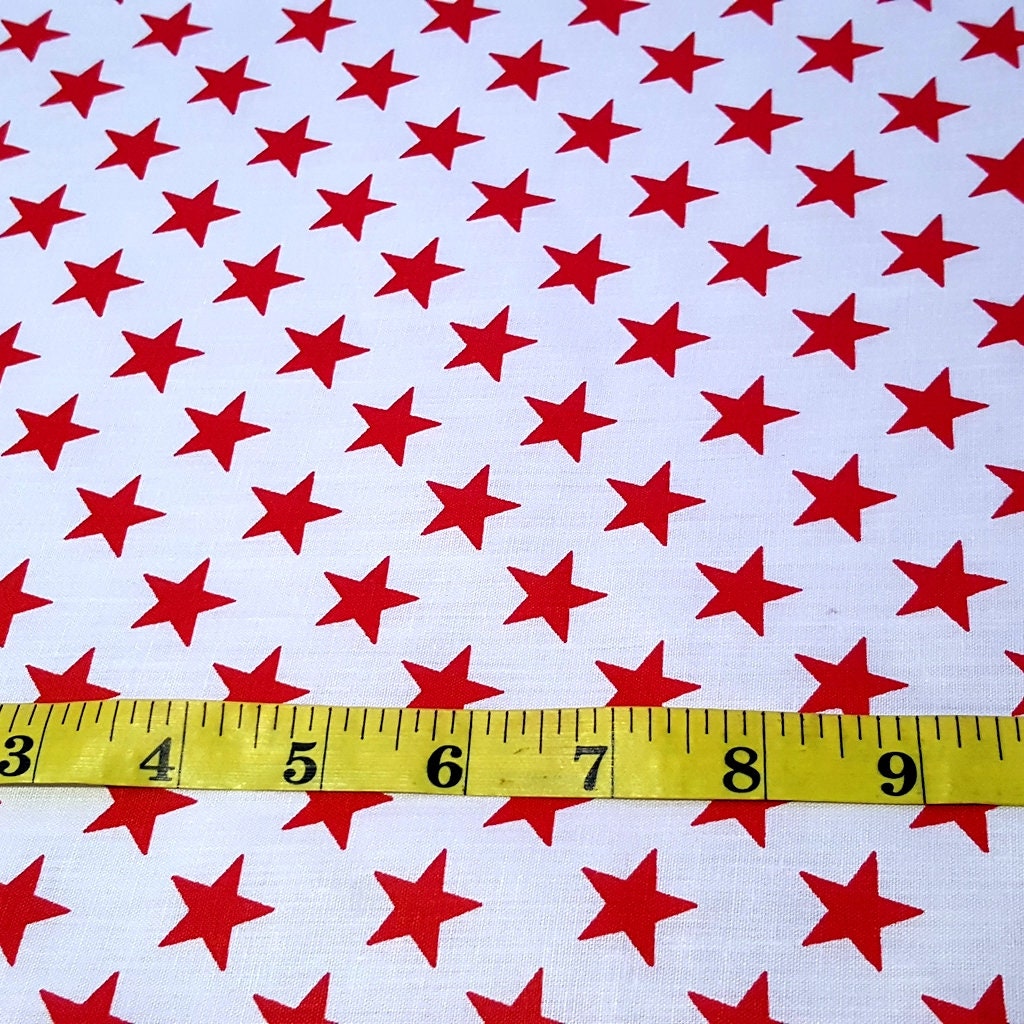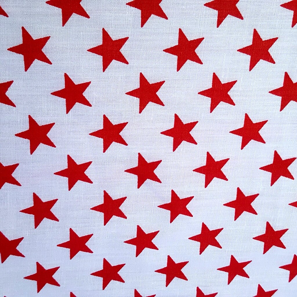 This fabric features an array of uniformly place red stars on a solid white background. Each star is about 1/2" wide. This is a light weight cotton blend fabric with a good drape and breathable nature.