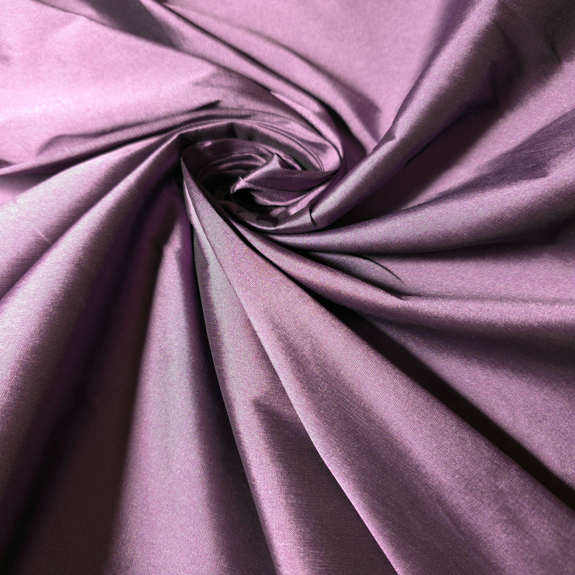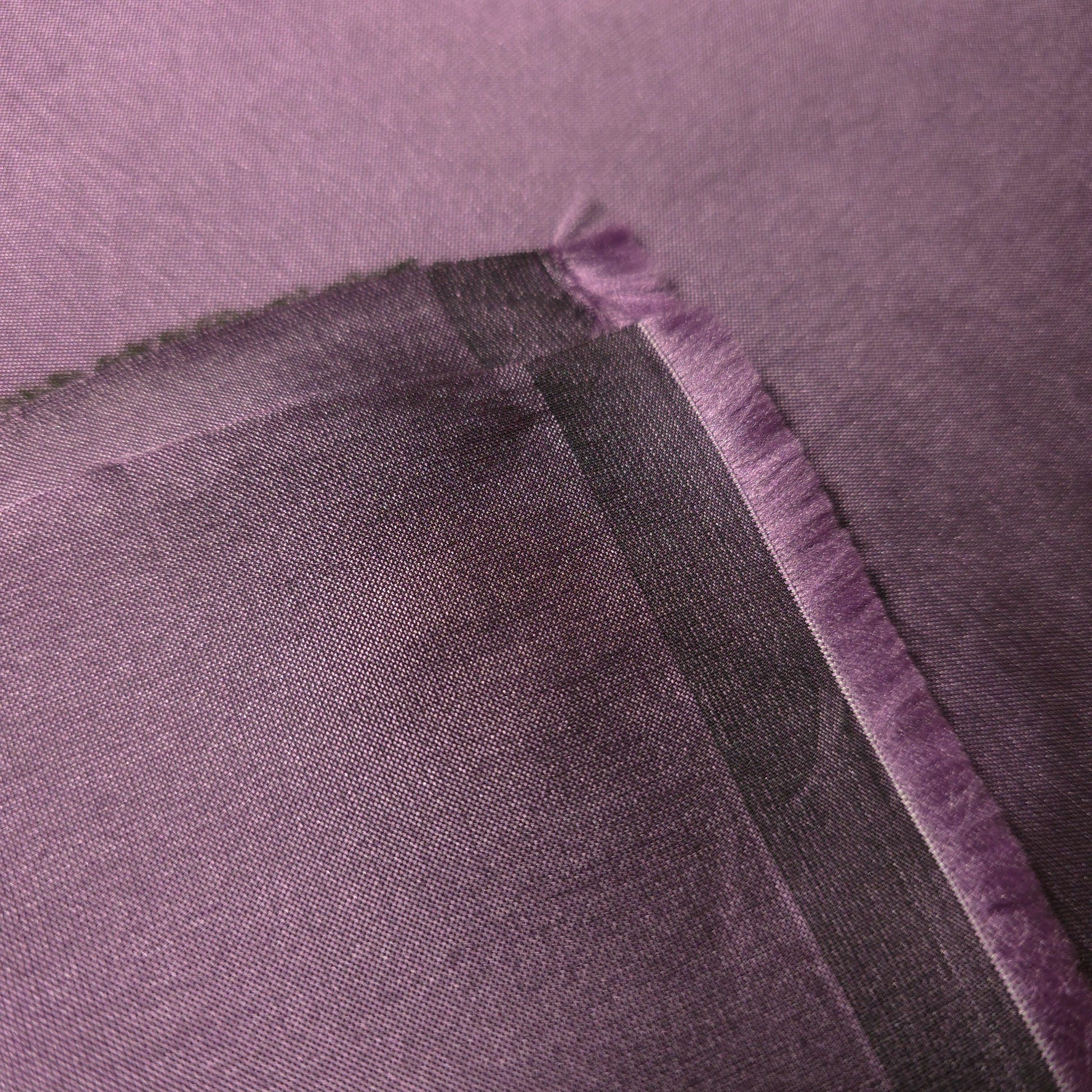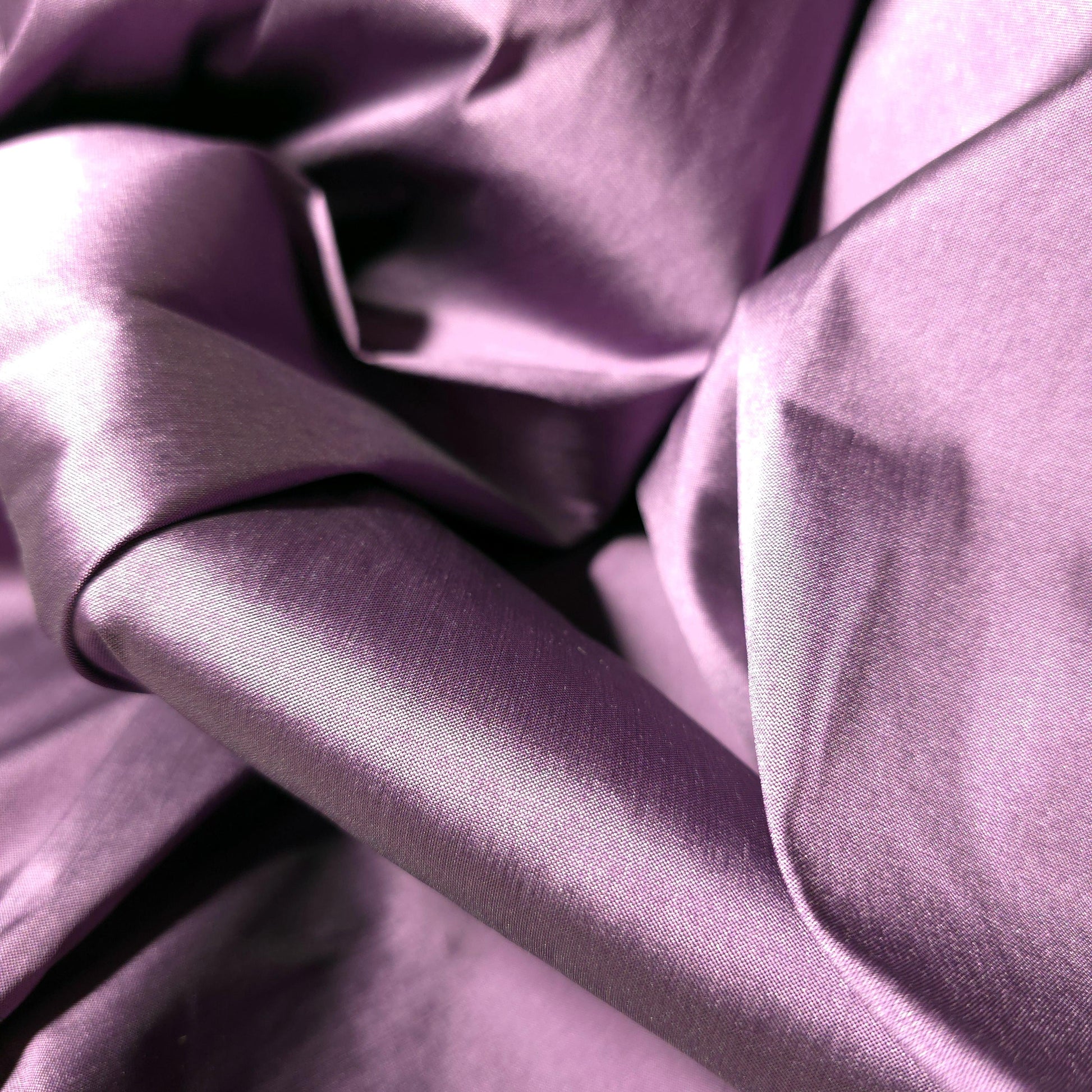 This fabric transcends typical polyester taffeta by replicating the texture and sheen of machine-woven silk taffeta. Lightweight and crisp, it tends to billow rather than drape, lending an elegant dimension to garments and projects. Presented in a deep antique purple, it features a subtle black thread woven through, creating a bold, mildly iridescent effect with dark undertones that enhance its visual depth. Measuring 58" wide with no stretch and weighing 5 oz per yard, this versatile fabric is ideal for high-end fashion, linings, home décor, millinery, event decoration, and more.