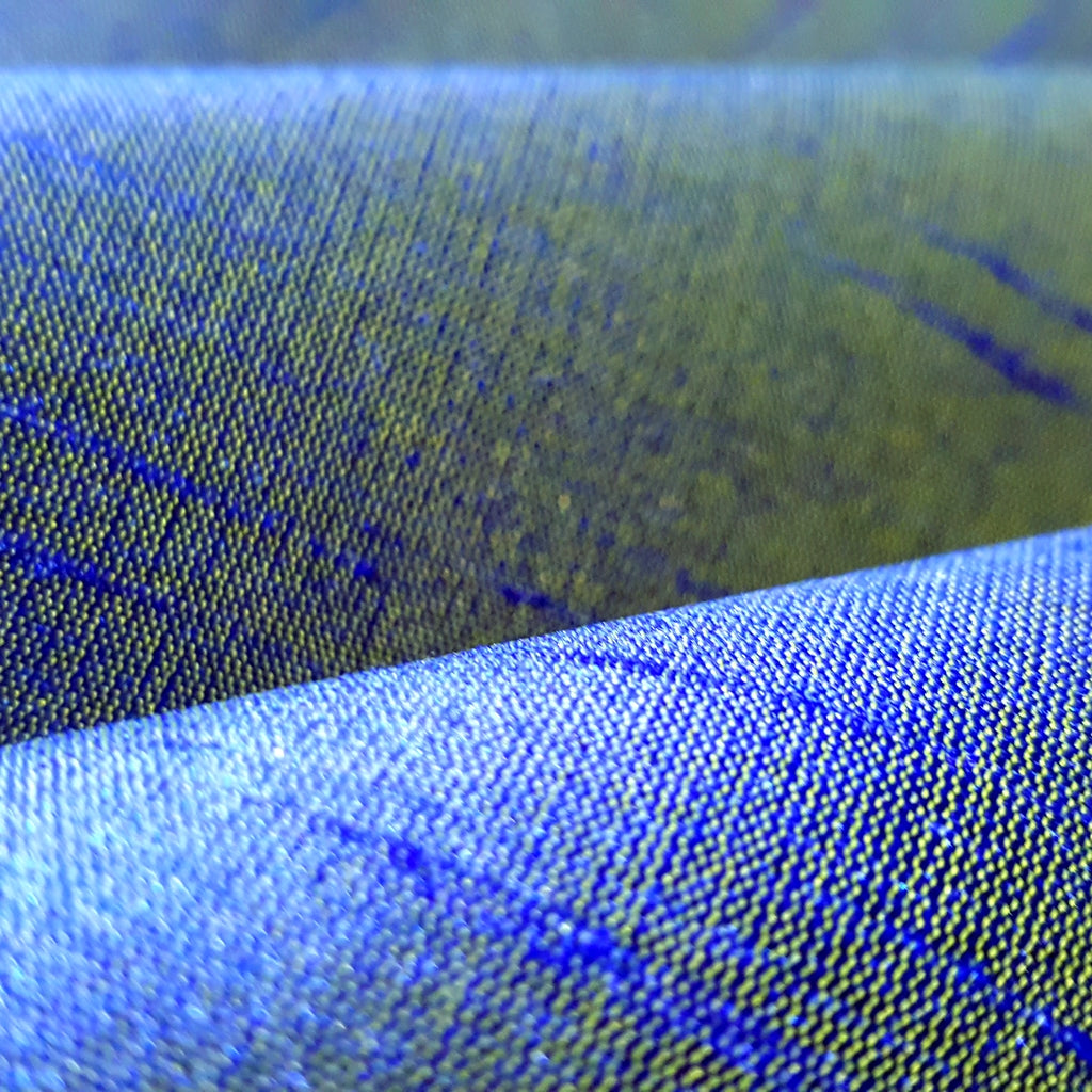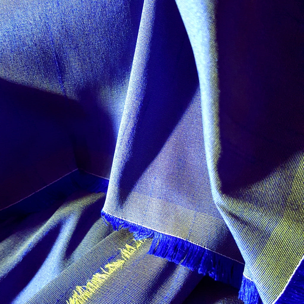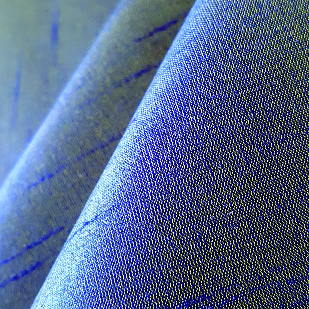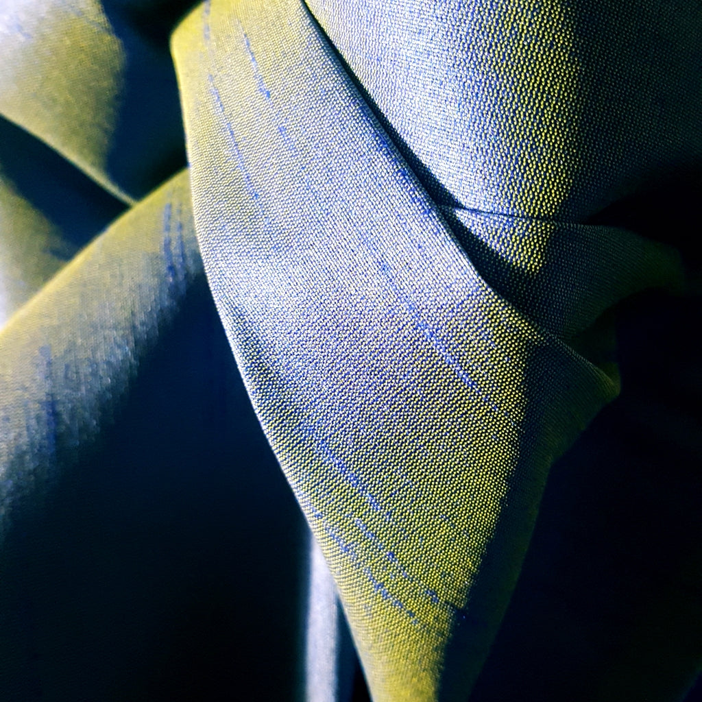 Dupioni fabric is a plain-woven fabric. Using a fine yard on the warp and an uneven yarn on the weft. This creates visual and textural raised thin stripes in the fabric. The thread used here has a subtle sheen to it. giving it a subtle color refracting iridescence.