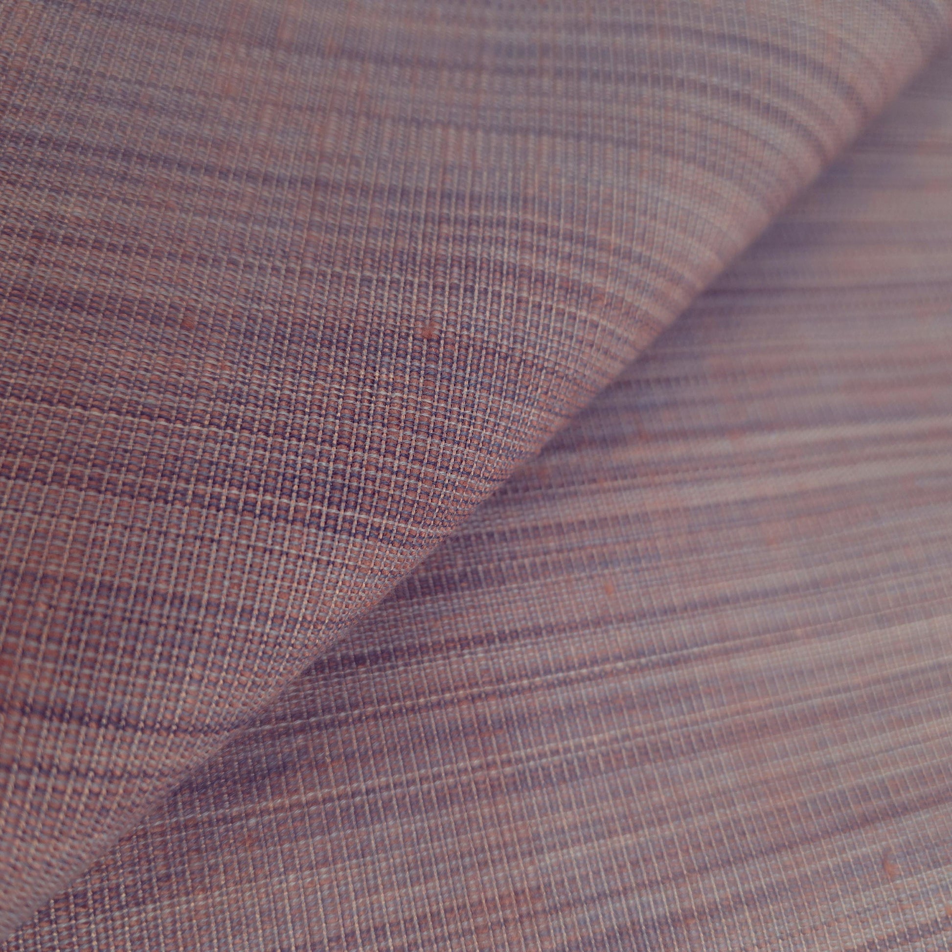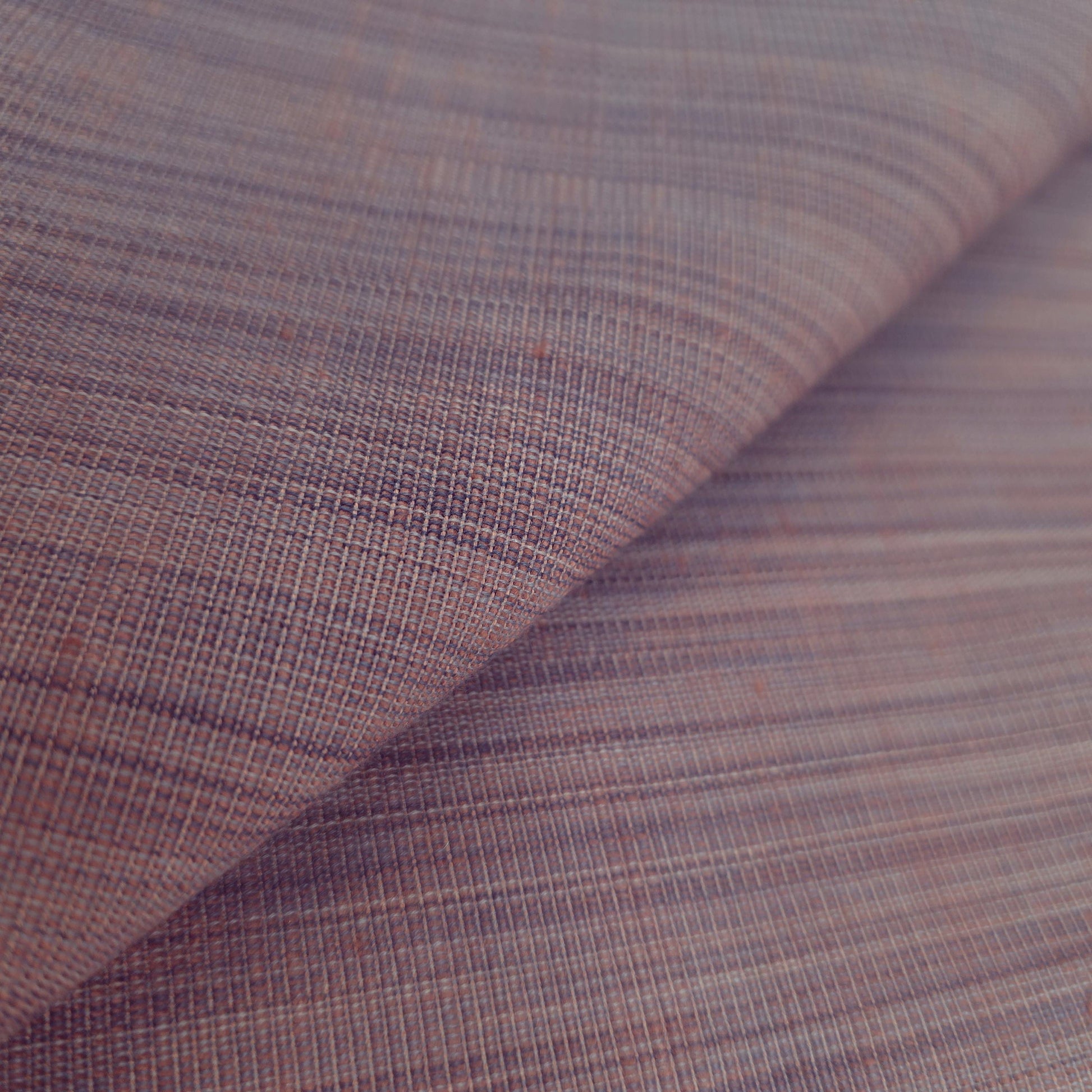 This is a heavy upholstery fabric with a rustic slub weave, characterized by irregular, textured yarns that create subtle variations in thickness and a natural, organic look. The fabric displays a blended coloration, appearing as a mix of muted reddish-brown or terracotta tones interwoven with lilac and bluish-grey threads, giving it a mottled or heathery effect. The overall color can be described as a light marbled purple.