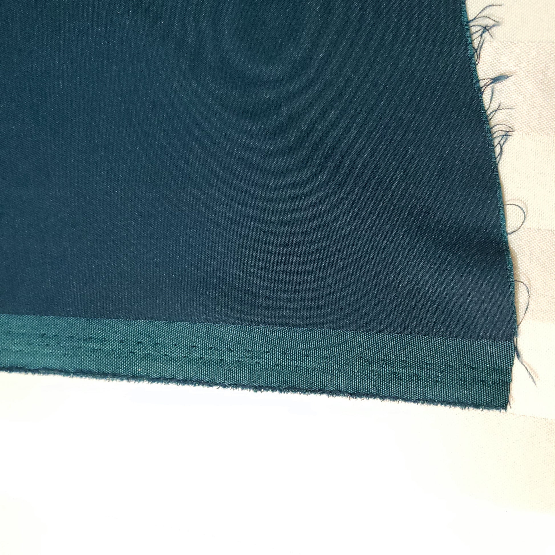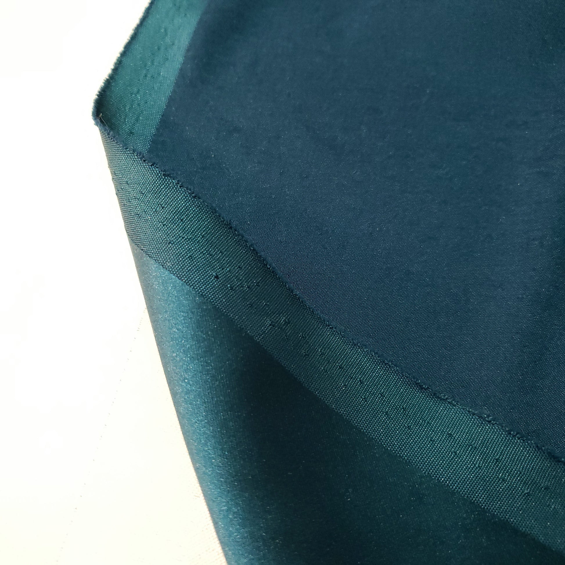 This medium weight stretch satin features a beautiful, supple hand and an excellent, fluid drape. Its surface has a sophisticated, low-luster finish, providing a subtle sheen rather than a high-gloss shine. The fabric is a deep green-teal color and is cool to the touch. With its added stretch, this material offers comfort and is ideal for garments that require movement and a close fit.