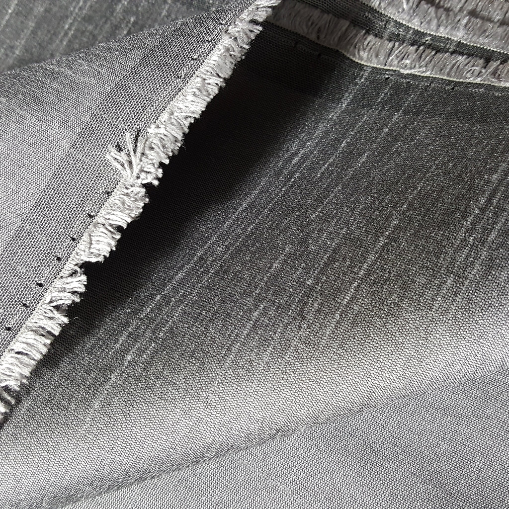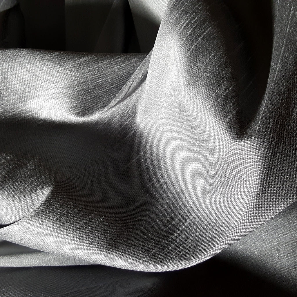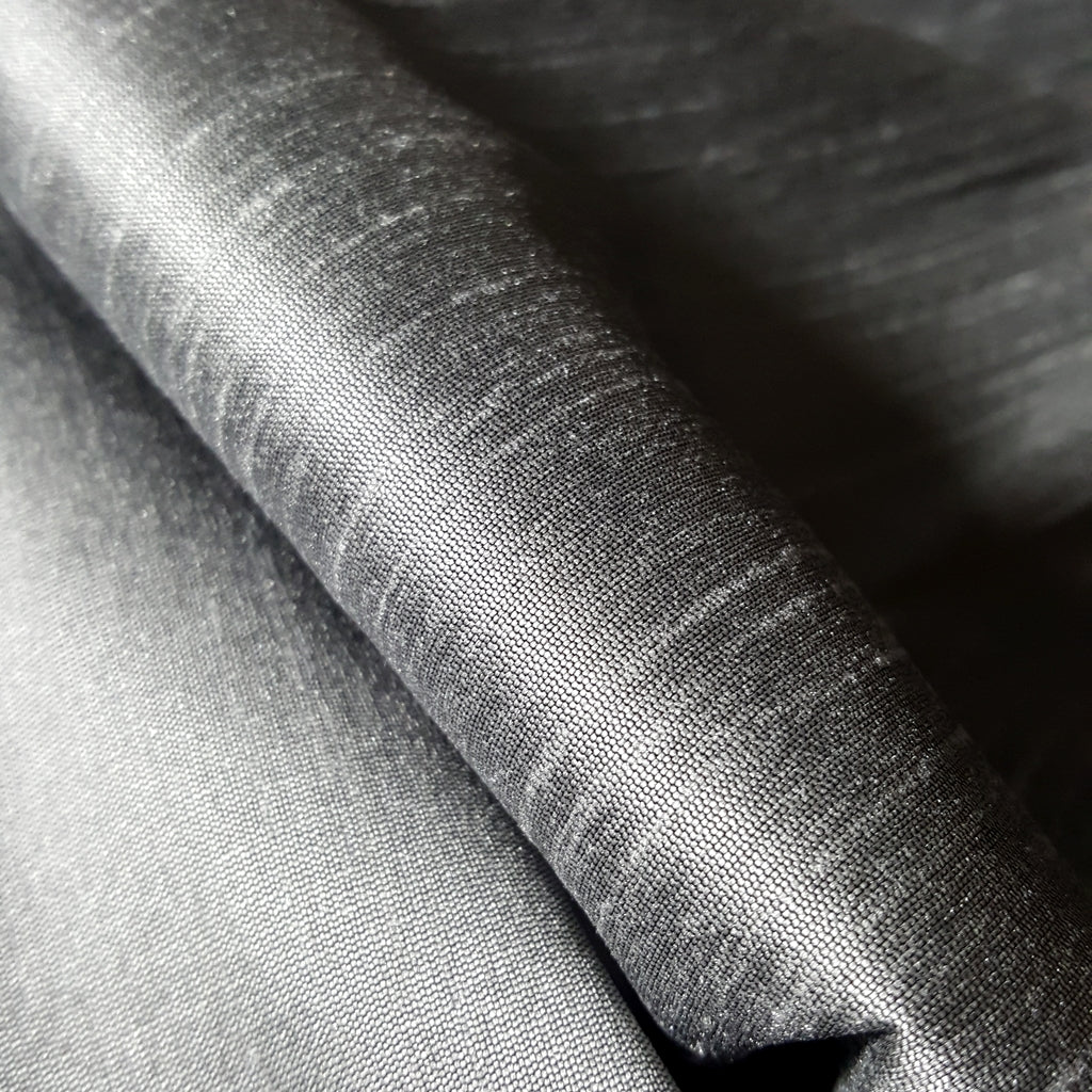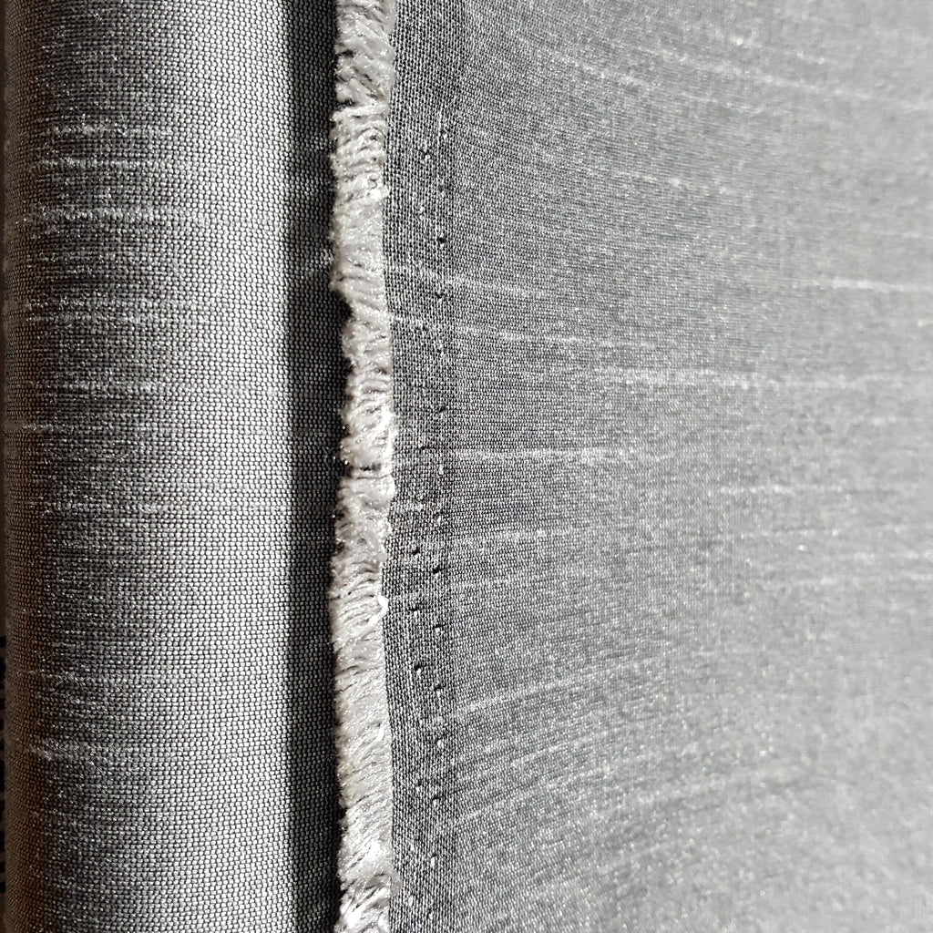 Dupioni fabric is a plain-woven fabric. Using a fine yard on the warp and an uneven yarn on the weft. This creates visual and textural raised thin stripes in the fabric. The thread used here has a subtle sheen to it. giving it a subtle color refracting iridescence.