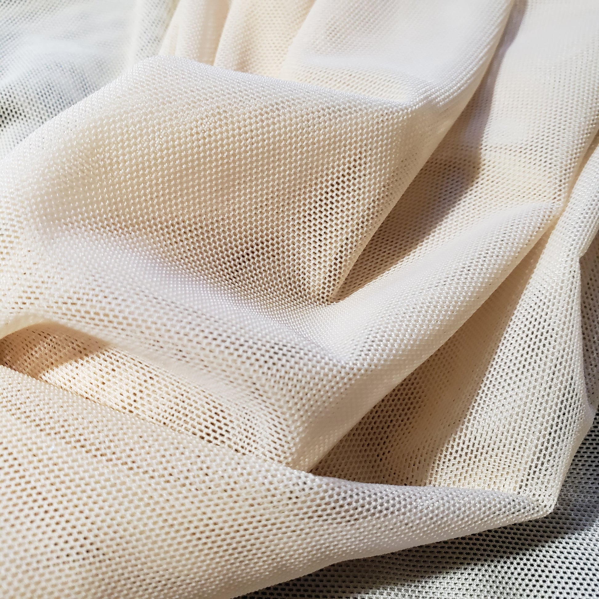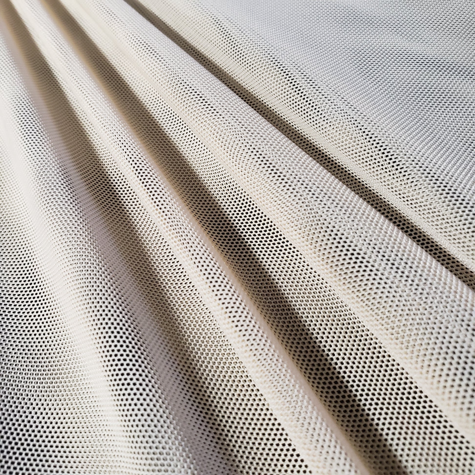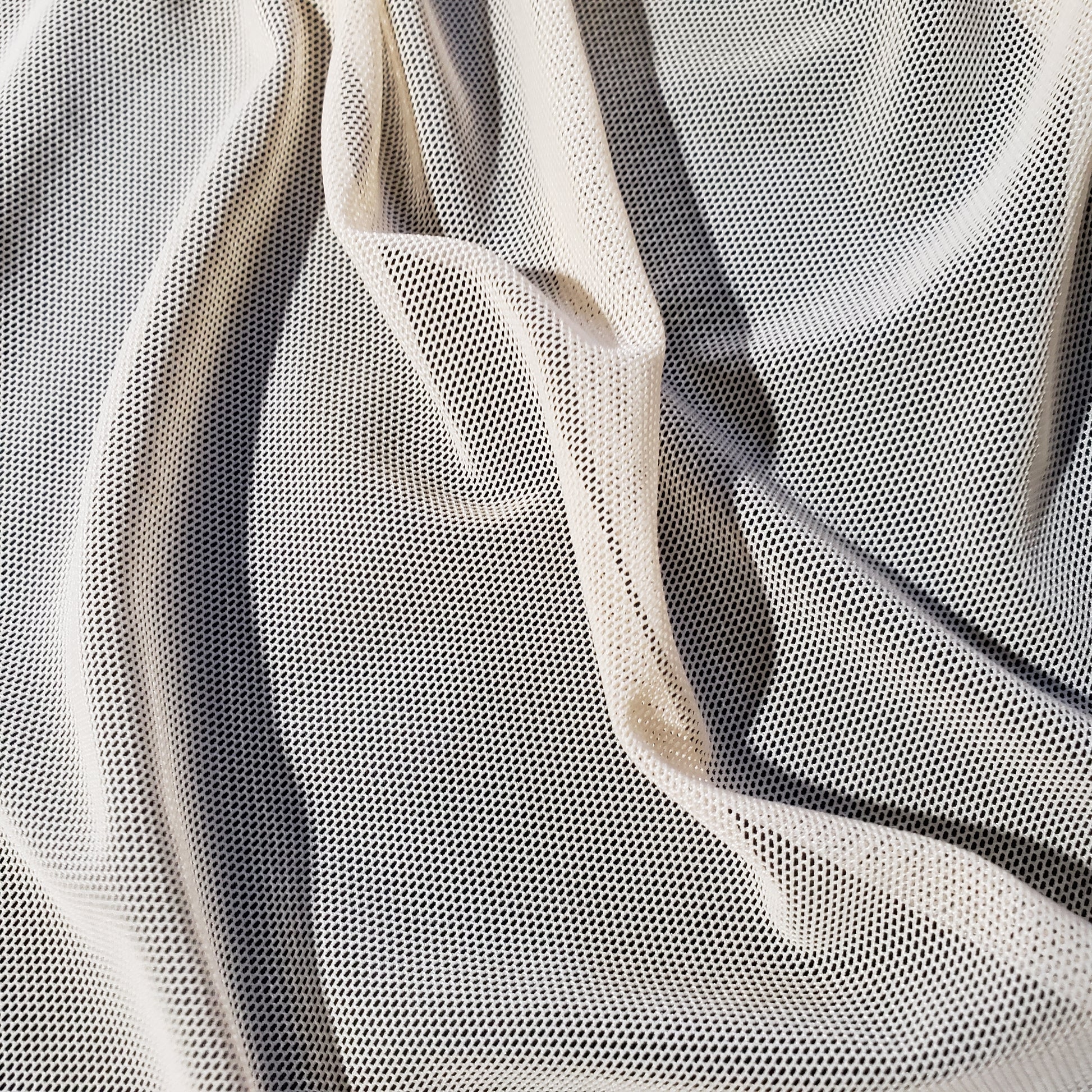 This power mesh is a lightweight, sheer net fabric with a high-performance 4-way stretch. It is engineered with a finely-gauged knit construction, creating a pattern of uniform, small perforations that provide excellent breathability. The blend of fibers allows for significant stretch and recovery along both the lengthwise and crosswise grain. Its fluid, liquid-like drape ensures that it hangs and moves gracefully without adding bulk. The fabric is transparent, making it a functional material for supportive linings, inserts, and illusion effects in garment construction.