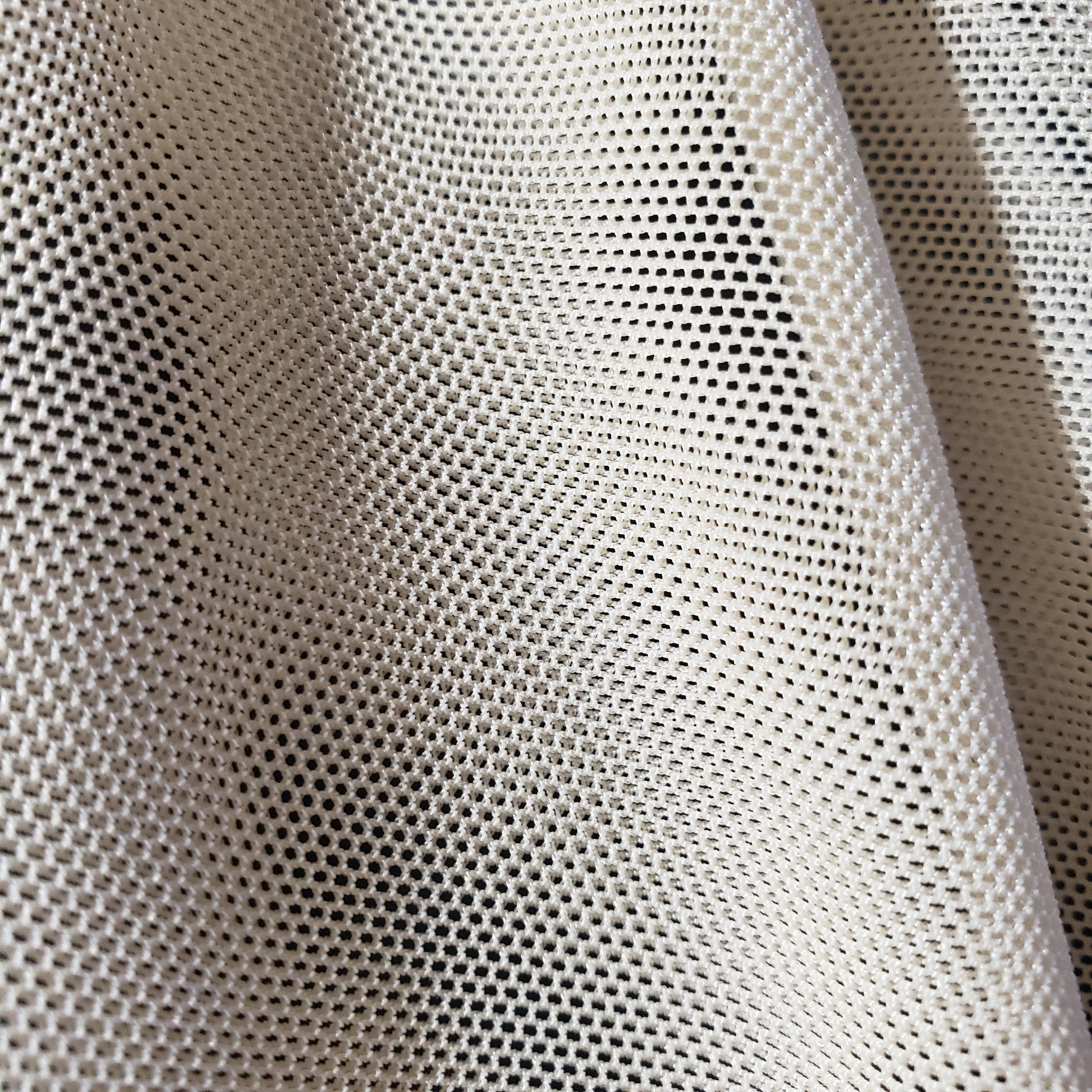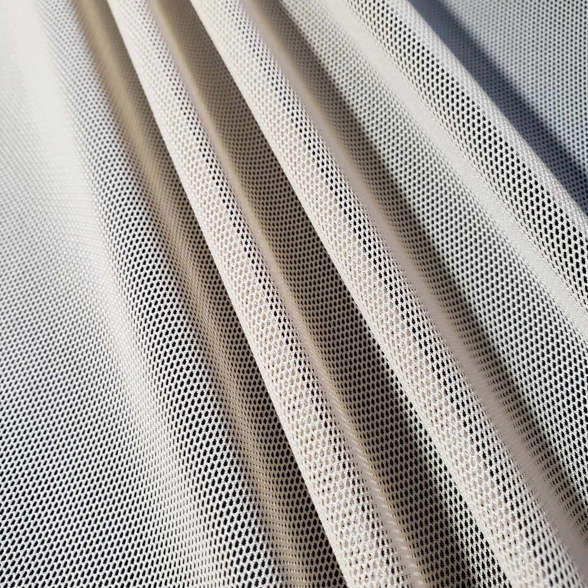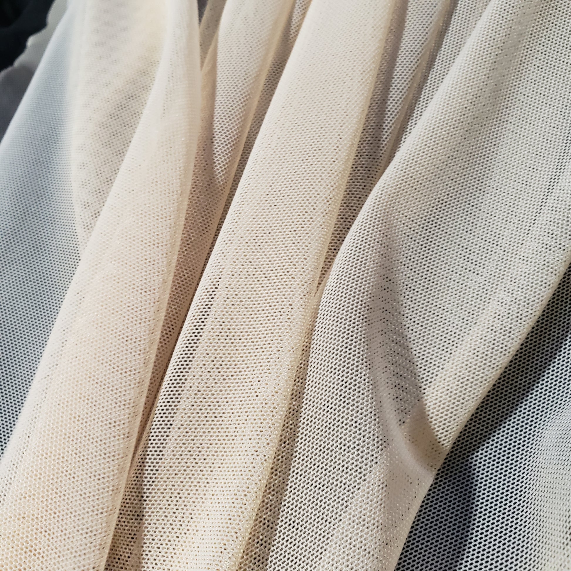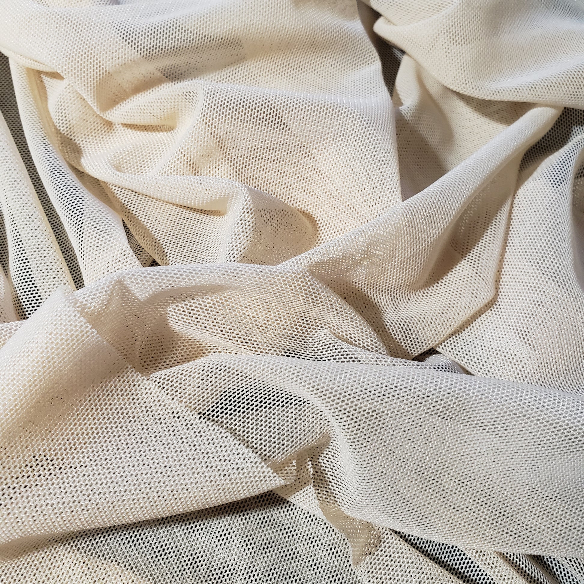 This power mesh is a lightweight, sheer net fabric with a high-performance 4-way stretch. It is engineered with a finely-gauged knit construction, creating a pattern of uniform, small perforations that provide excellent breathability. The blend of fibers allows for significant stretch and recovery along both the lengthwise and crosswise grain. Its fluid, liquid-like drape ensures that it hangs and moves gracefully without adding bulk. The fabric is transparent, making it a functional material for supportive linings, inserts, and illusion effects in garment construction.