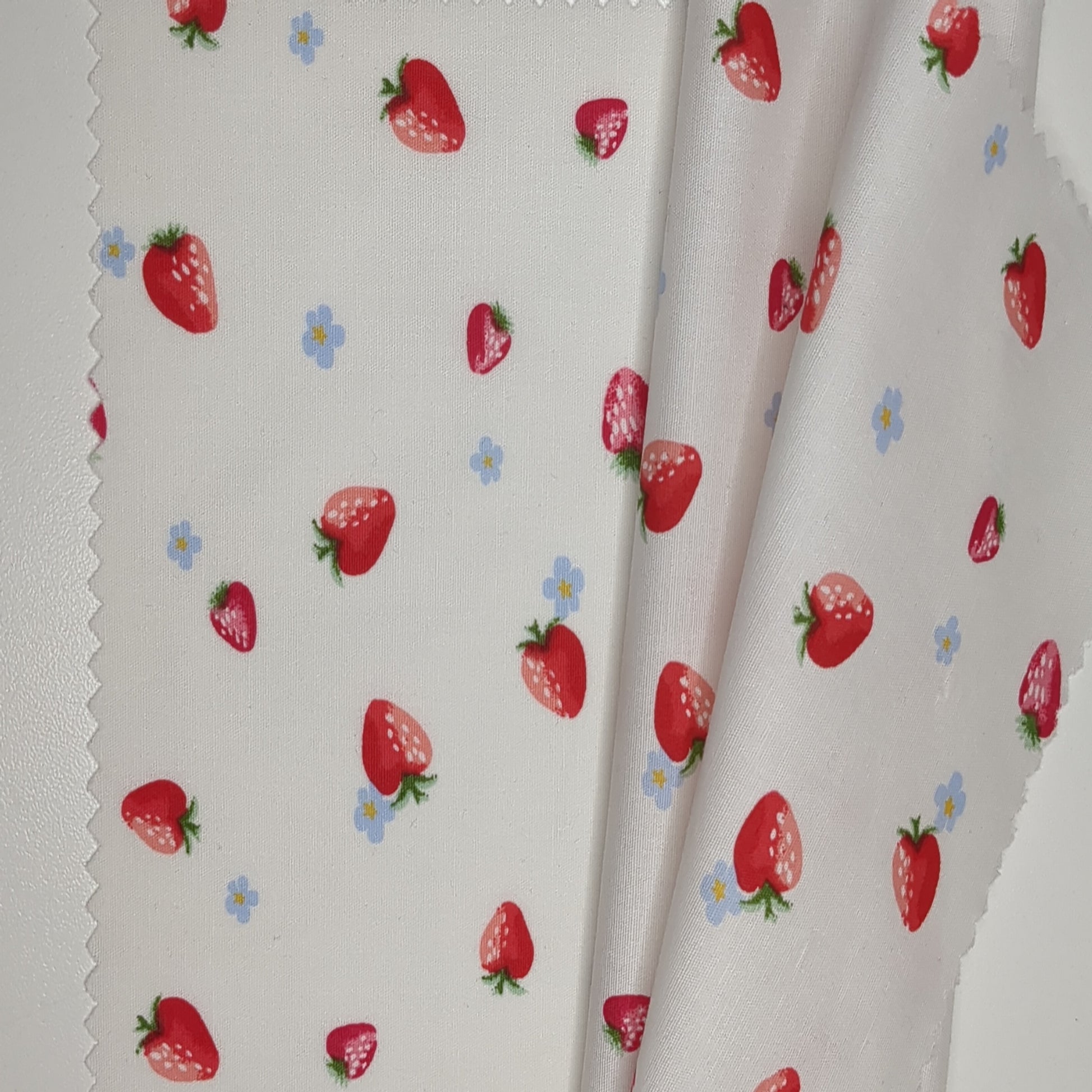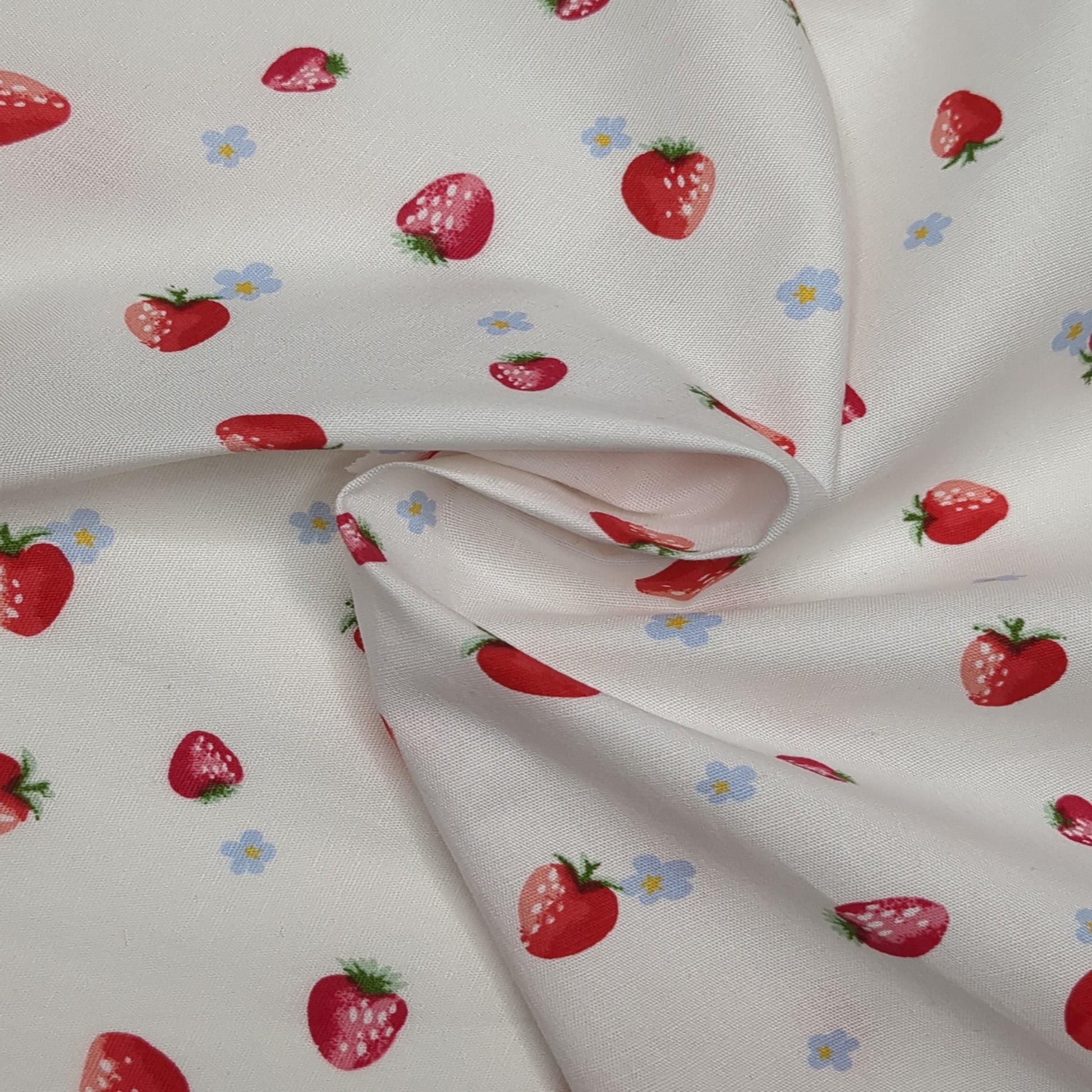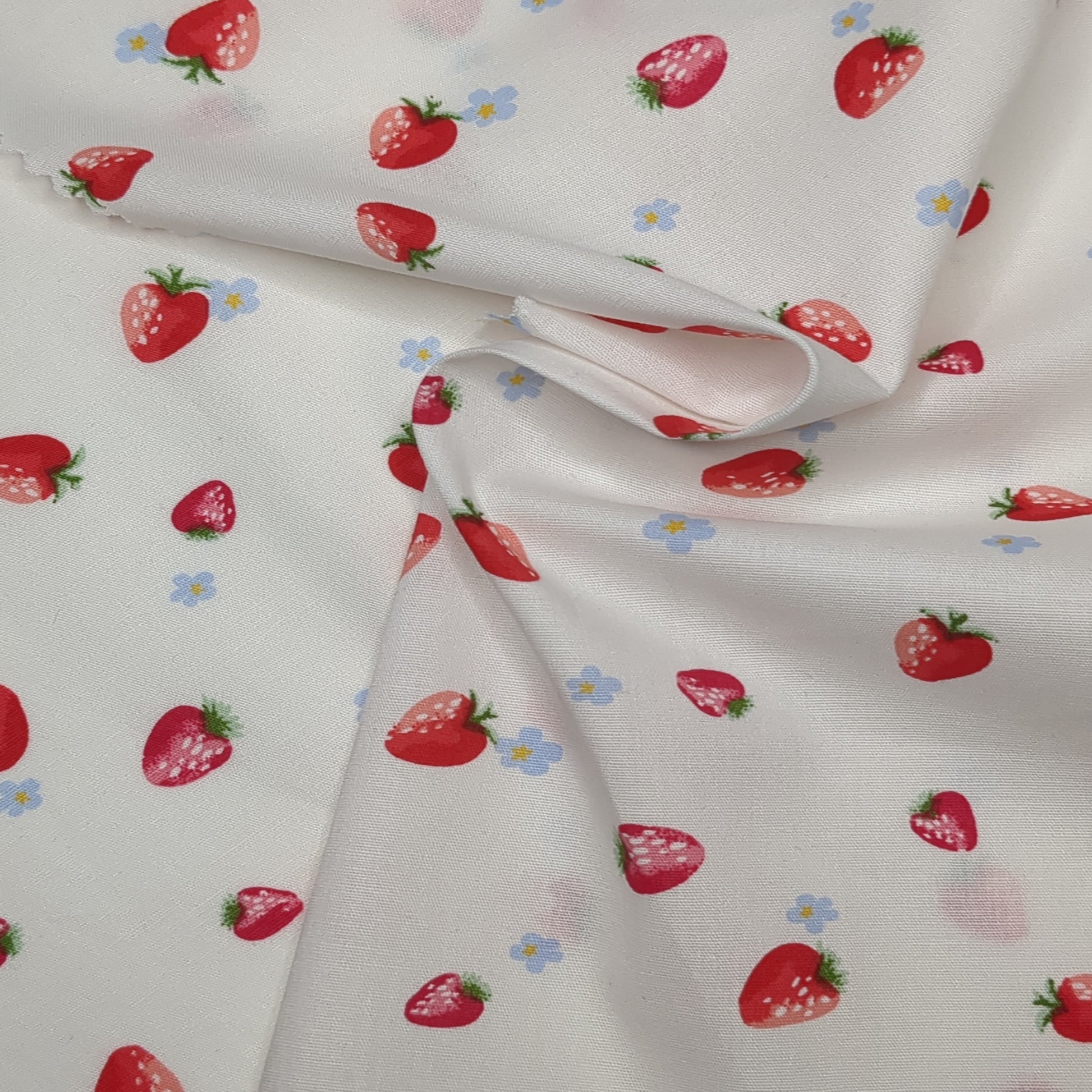 This fabric features a charming and sweet pattern of small red strawberries and tiny blue flowers scattered across a crisp white background. Made from a stretch cotton poplin, this material combines the classic smooth hand of cotton with the comfort and flexibility of spandex, making it an ideal choice for structured yet comfortable apparel like dresses, blouses, and children's wear.