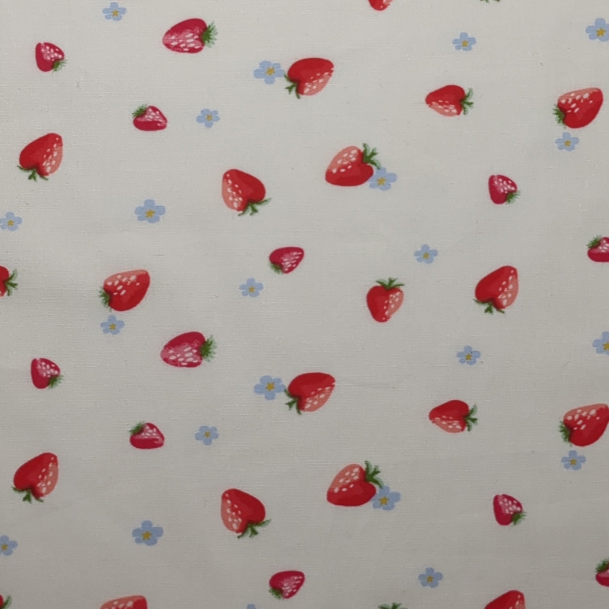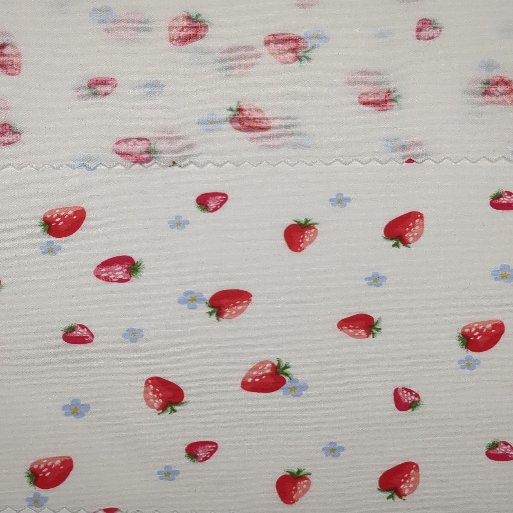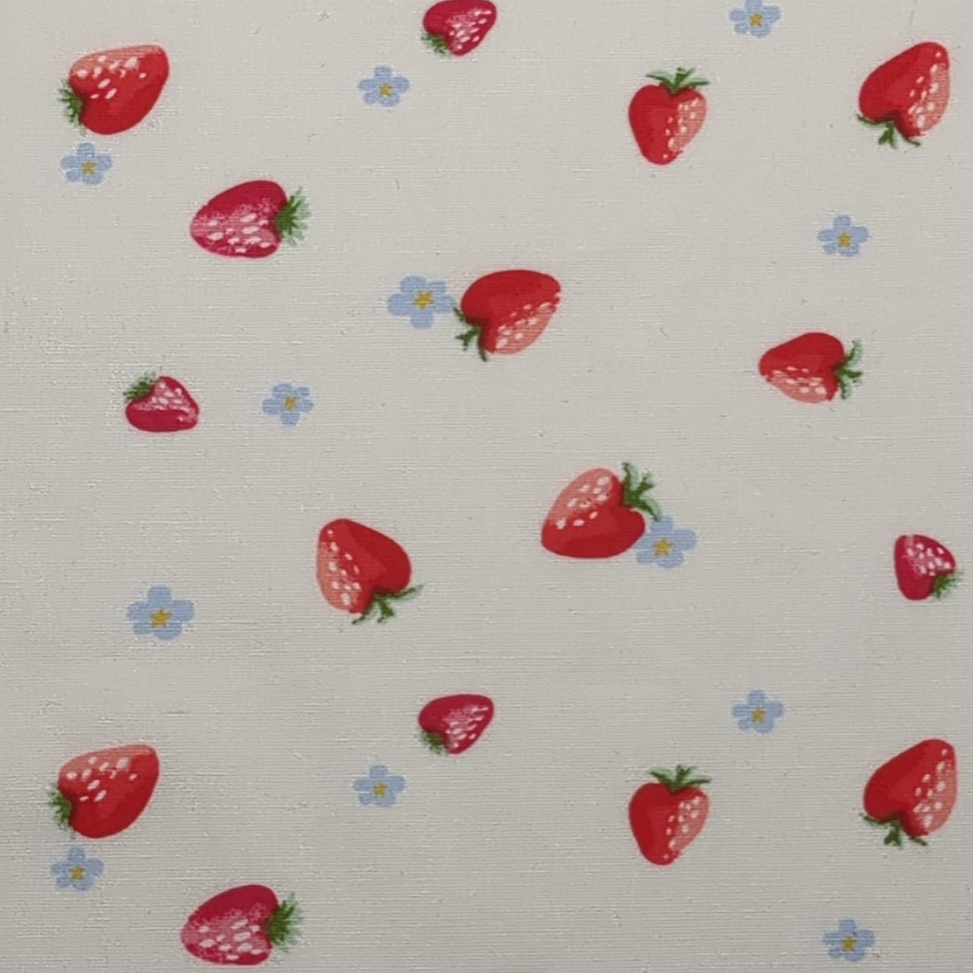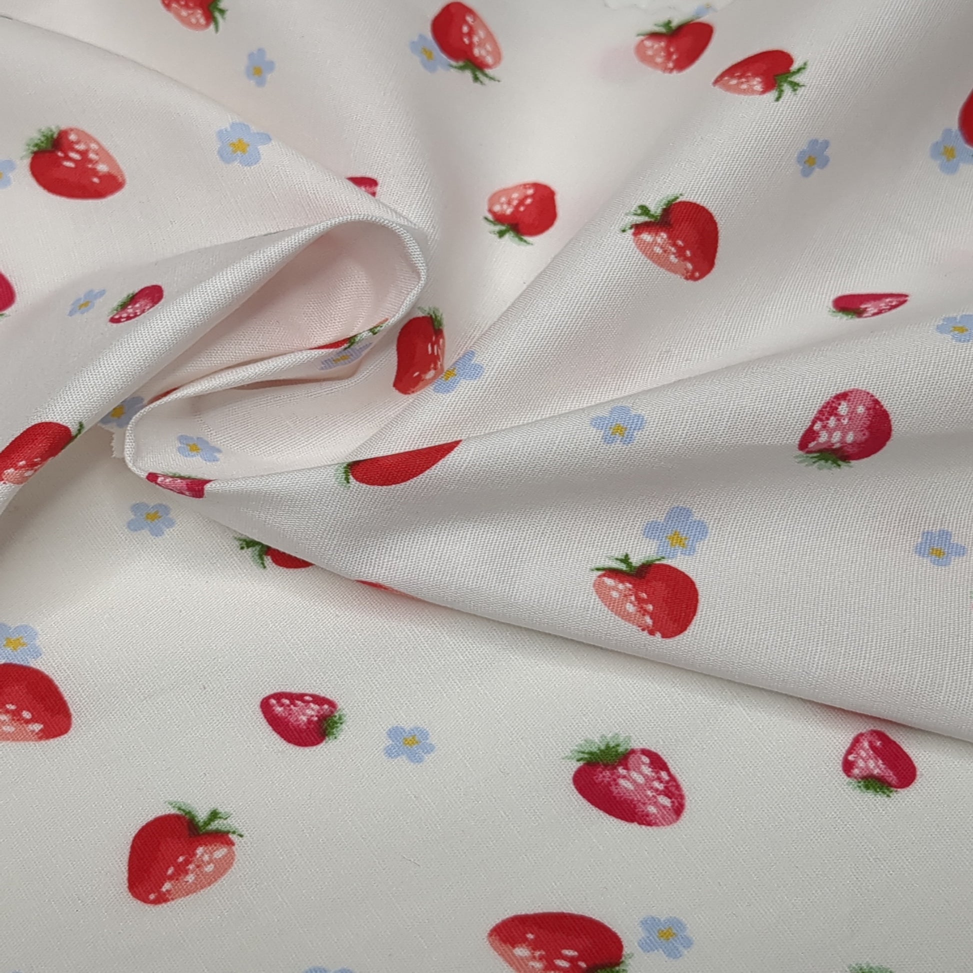 This fabric features a charming and sweet pattern of small red strawberries and tiny blue flowers scattered across a crisp white background. Made from a stretch cotton poplin, this material combines the classic smooth hand of cotton with the comfort and flexibility of spandex, making it an ideal choice for structured yet comfortable apparel like dresses, blouses, and children's wear.