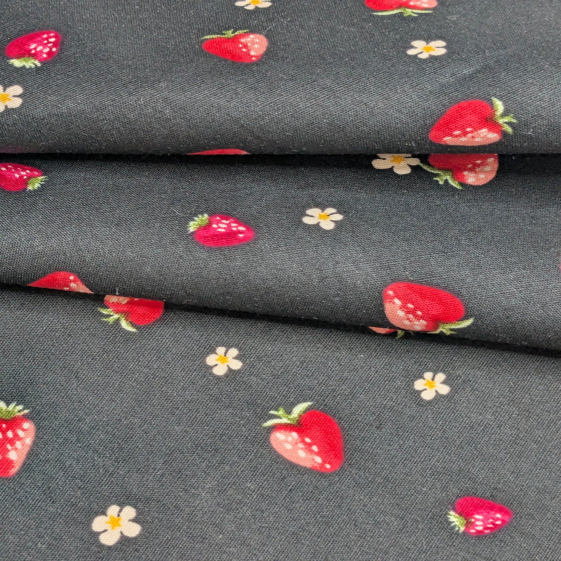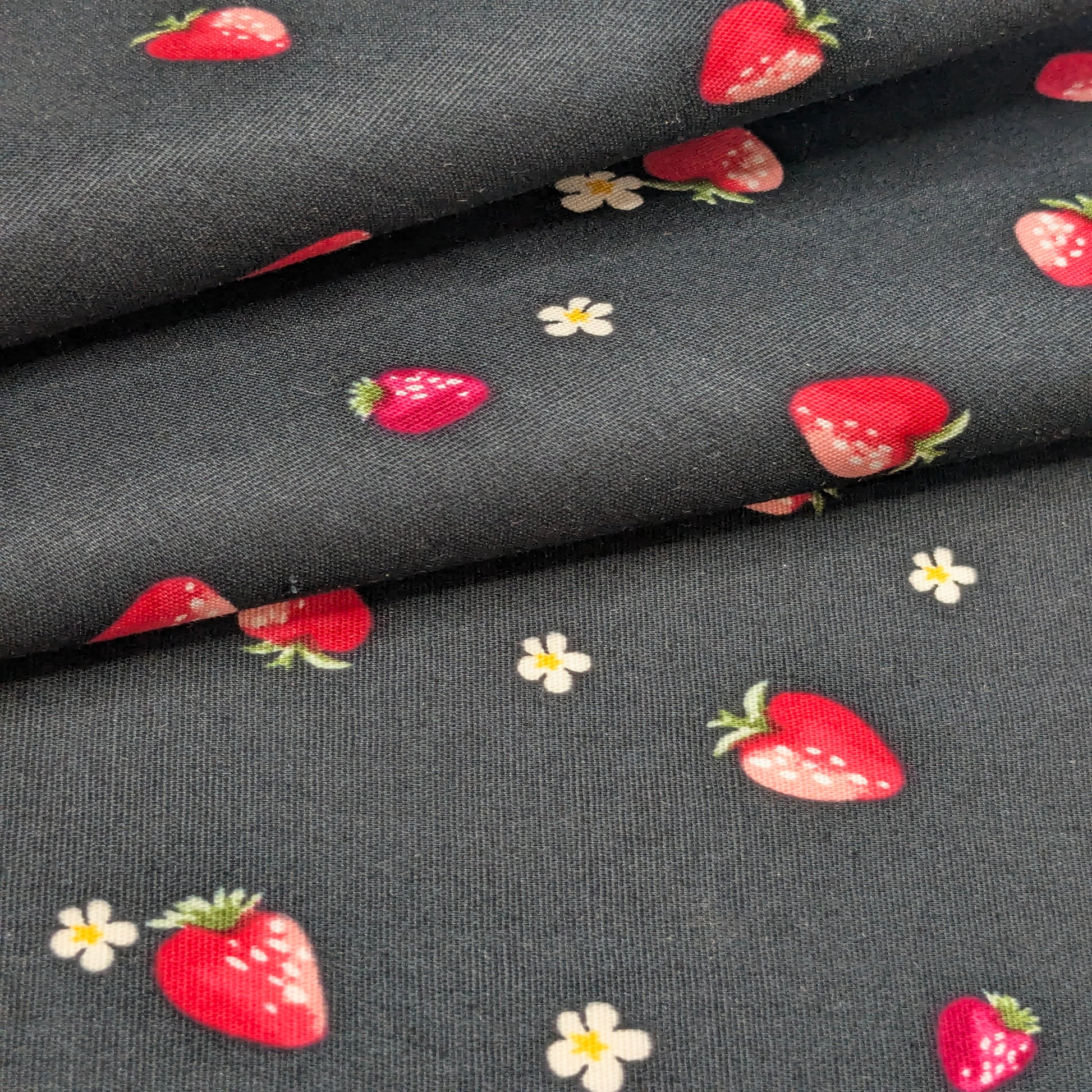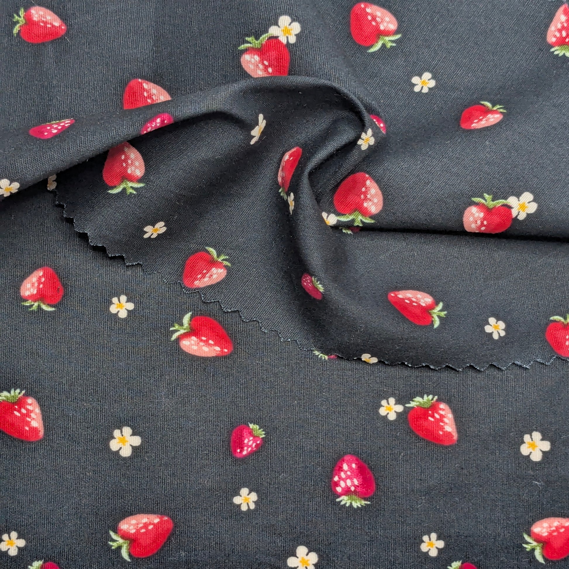 This fabric features a striking and sweet pattern of small red strawberries and tiny blue flowers scattered across a deep black background. Made from a stretch cotton poplin, this material combines the classic smooth hand of cotton with the comfort and flexibility of spandex, making it an ideal choice for structured yet comfortable apparel like dresses, blouses, and children's wear.