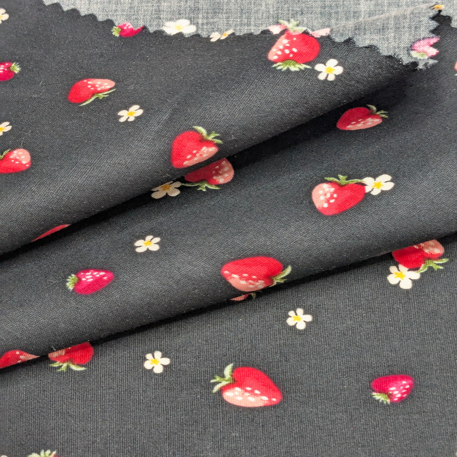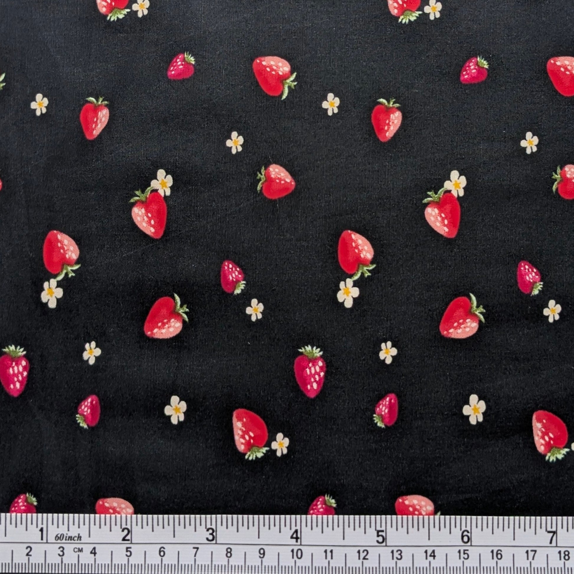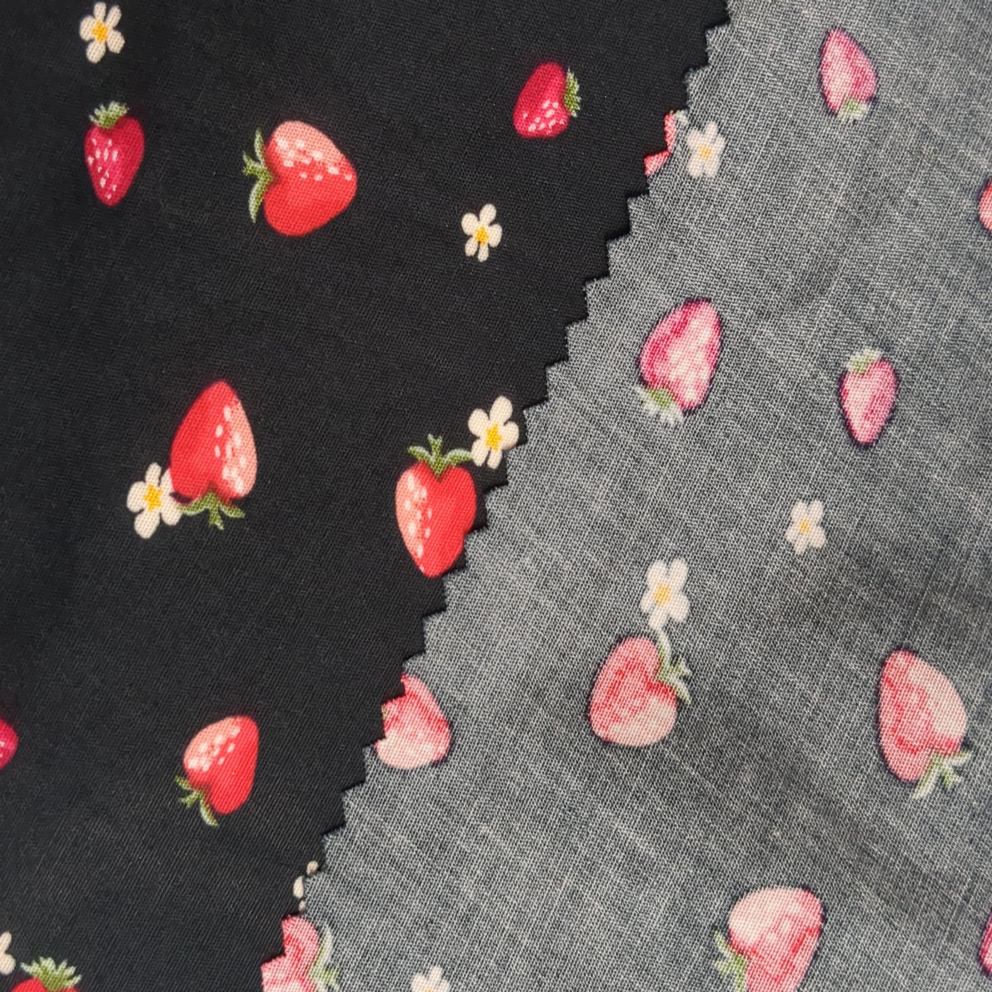 This fabric features a striking and sweet pattern of small red strawberries and tiny blue flowers scattered across a deep black background. Made from a stretch cotton poplin, this material combines the classic smooth hand of cotton with the comfort and flexibility of spandex, making it an ideal choice for structured yet comfortable apparel like dresses, blouses, and children's wear.