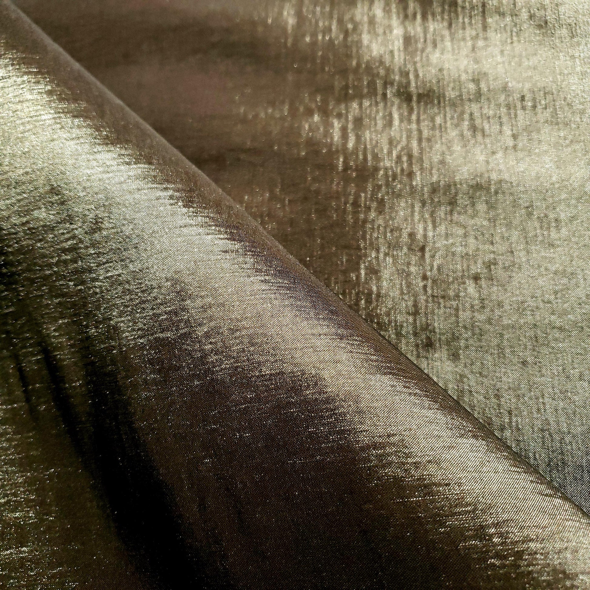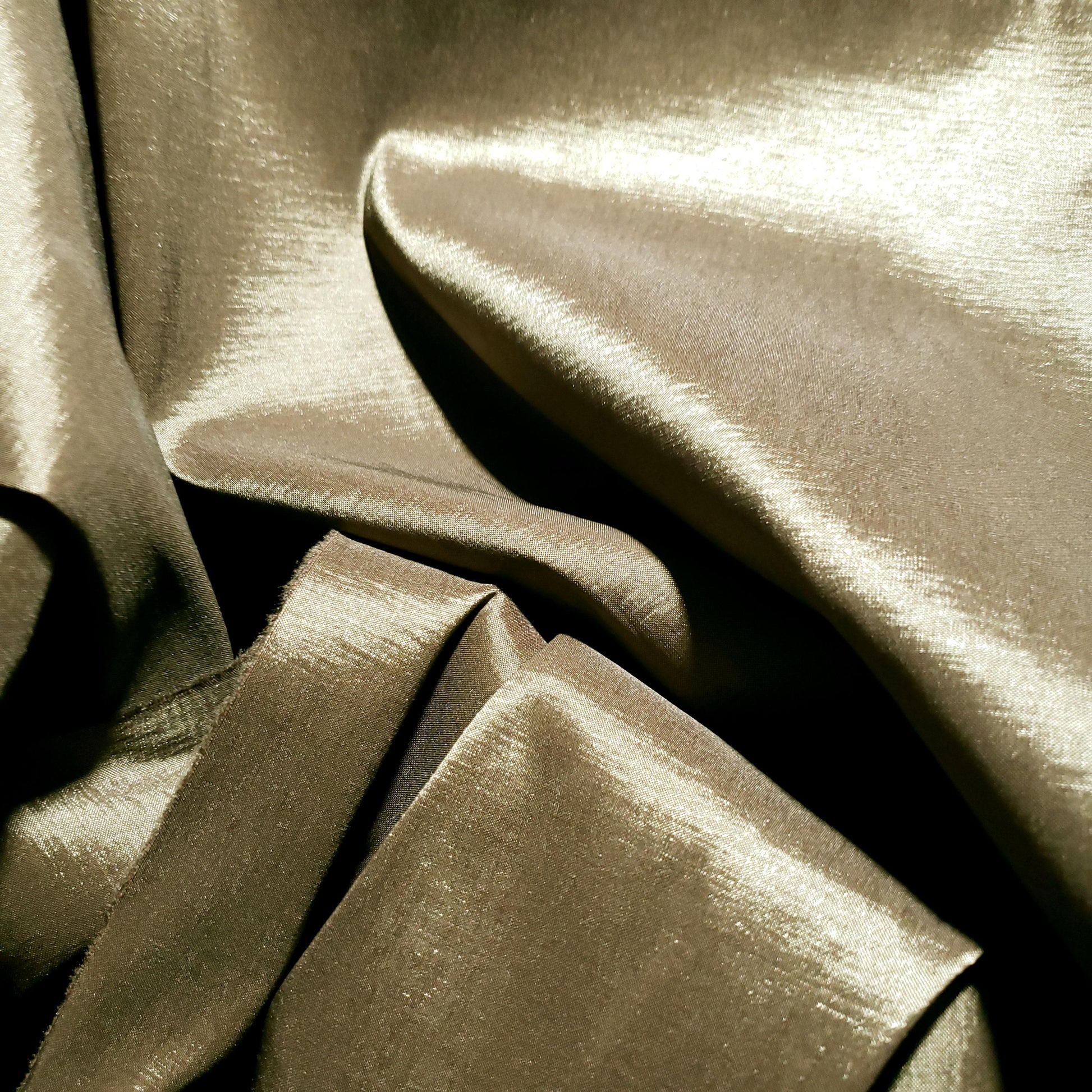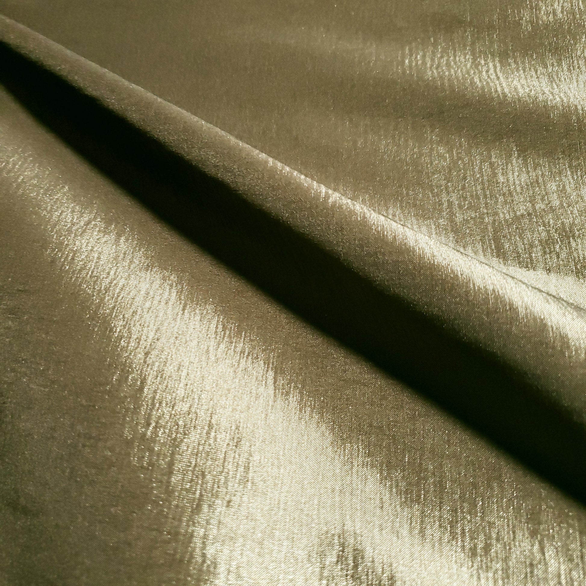 This beautiful medium weight taffeta is ideal for dresses and like garments. If features a two way stretch from cut edge to cut edge. It has a crisp stiff nature that billows when bunched. The dominant color is a pale taupe gold, this is shot with a gray thread. The result is a mocha taupe fabric with a mild gold iridescence under certain light. The surface has a semi metallic sheet to it. It is light and cool to the touch. The surface has a visible grain that refracts color and light when perceived from different directions. This adds a textural luster to this fabric