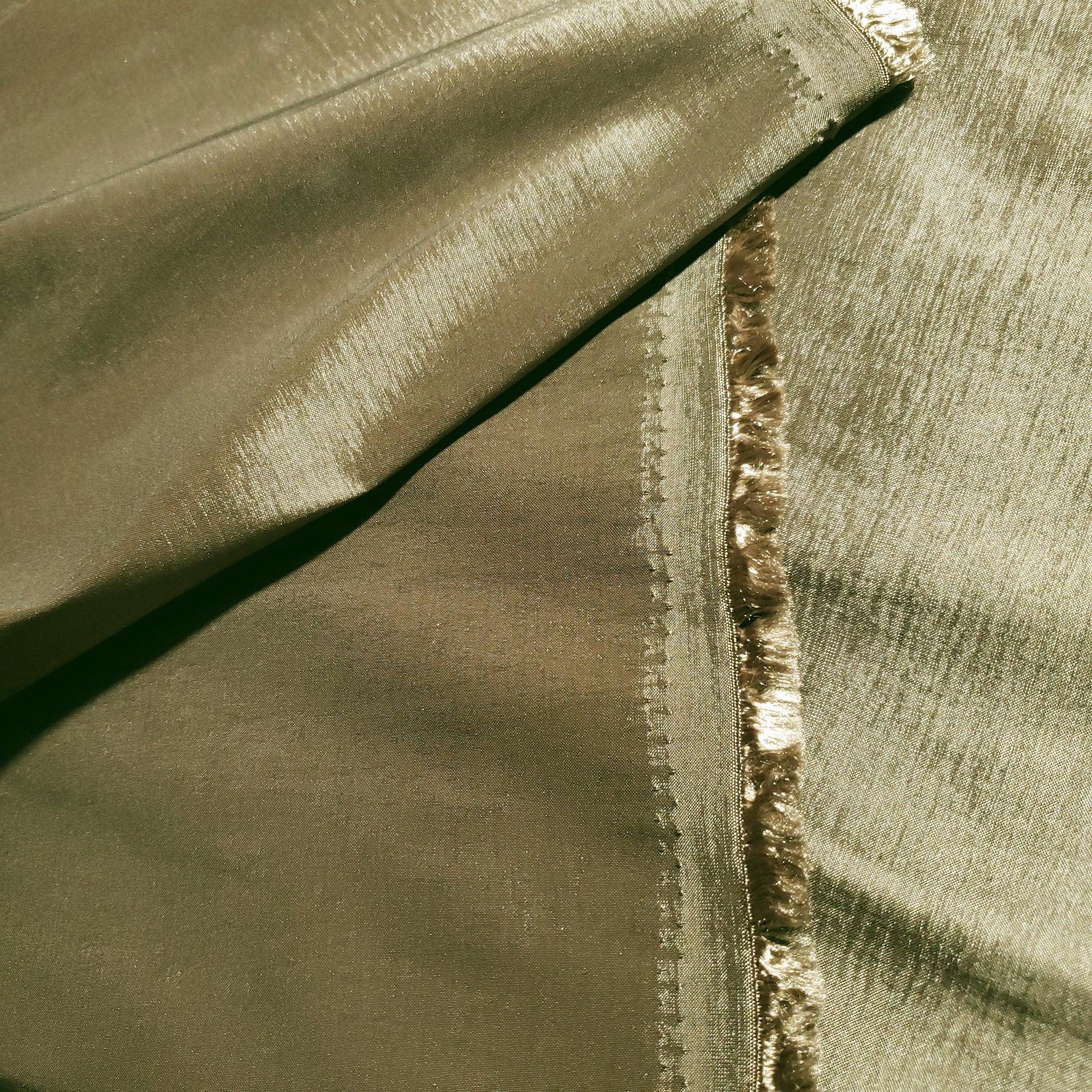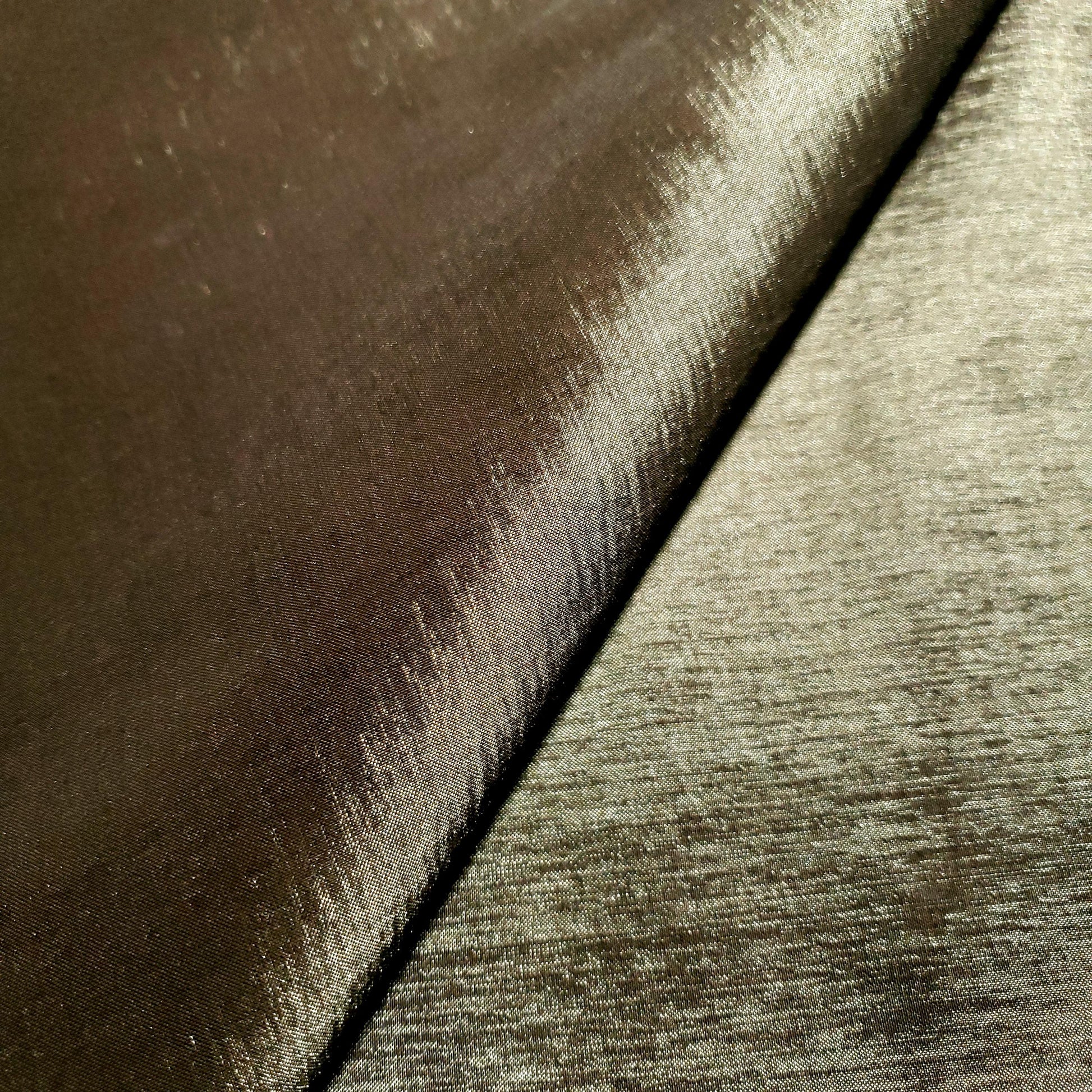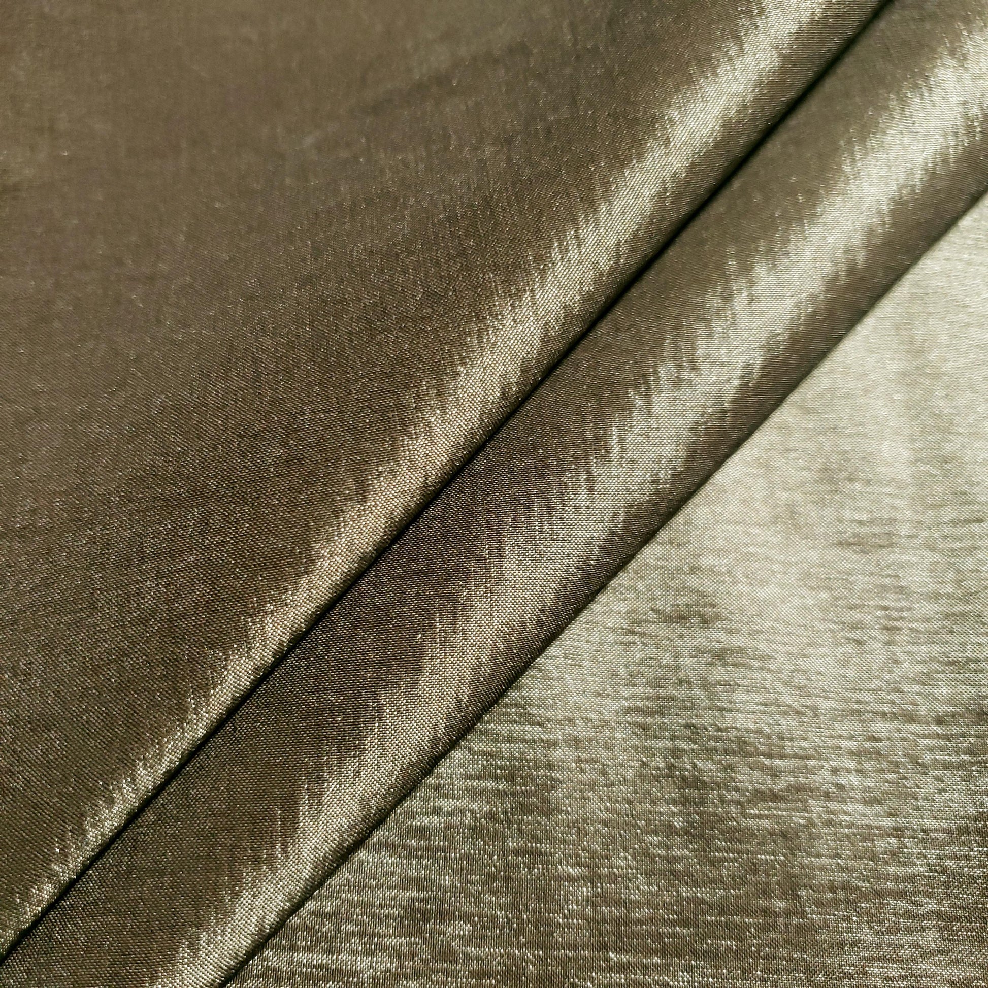 This beautiful medium weight taffeta is ideal for dresses and like garments. If features a two way stretch from cut edge to cut edge. It has a crisp stiff nature that billows when bunched. The dominant color is a pale taupe gold, this is shot with a gray thread. The result is a mocha taupe fabric with a mild gold iridescence under certain light. The surface has a semi metallic sheet to it. It is light and cool to the touch. The surface has a visible grain that refracts color and light when perceived from different directions. This adds a textural luster to this fabric