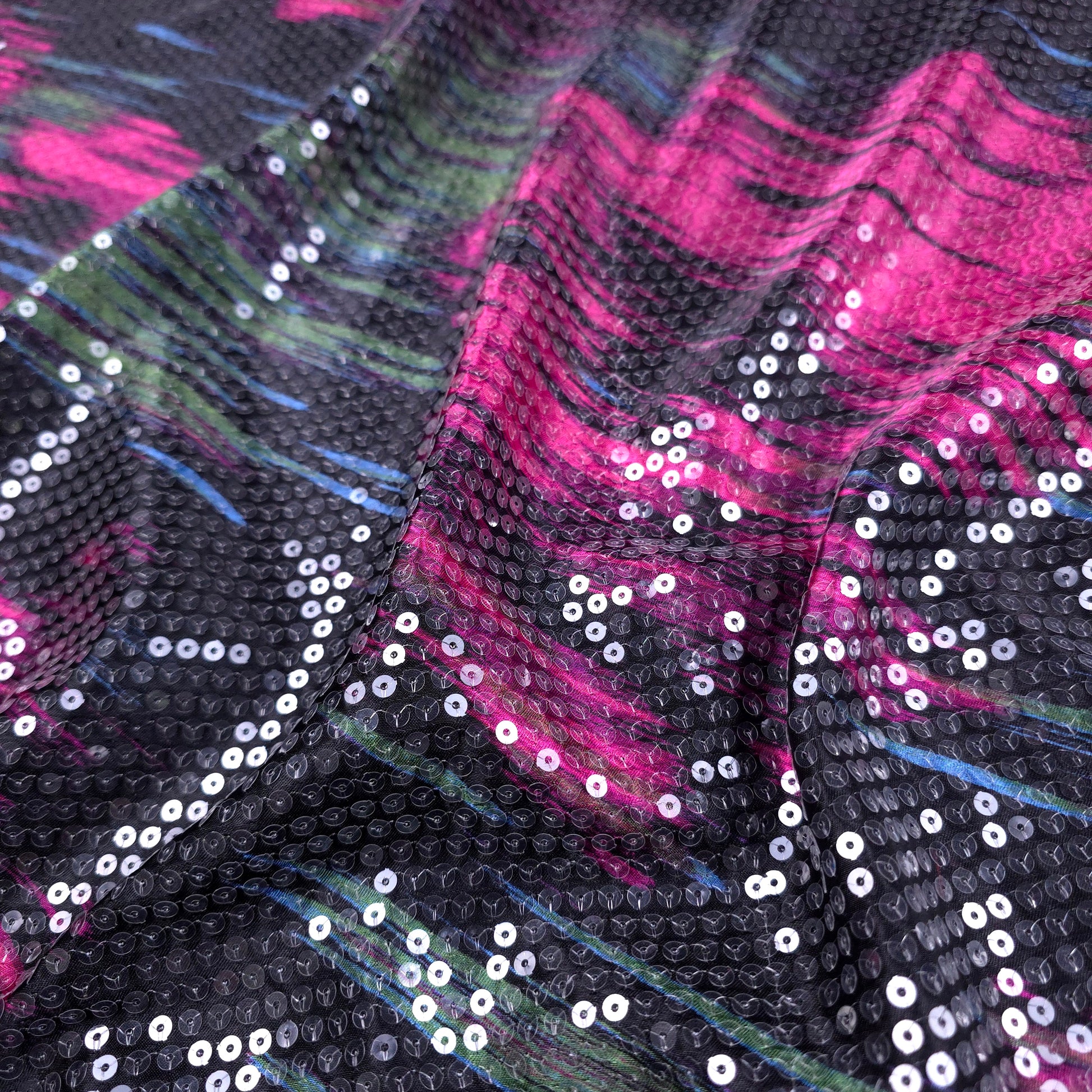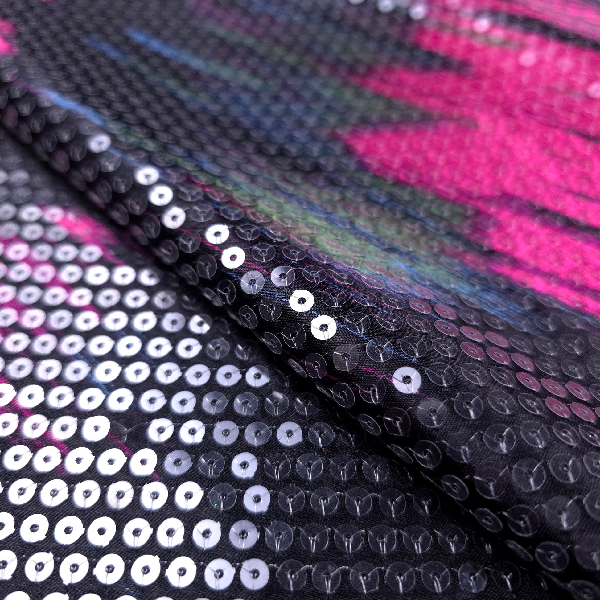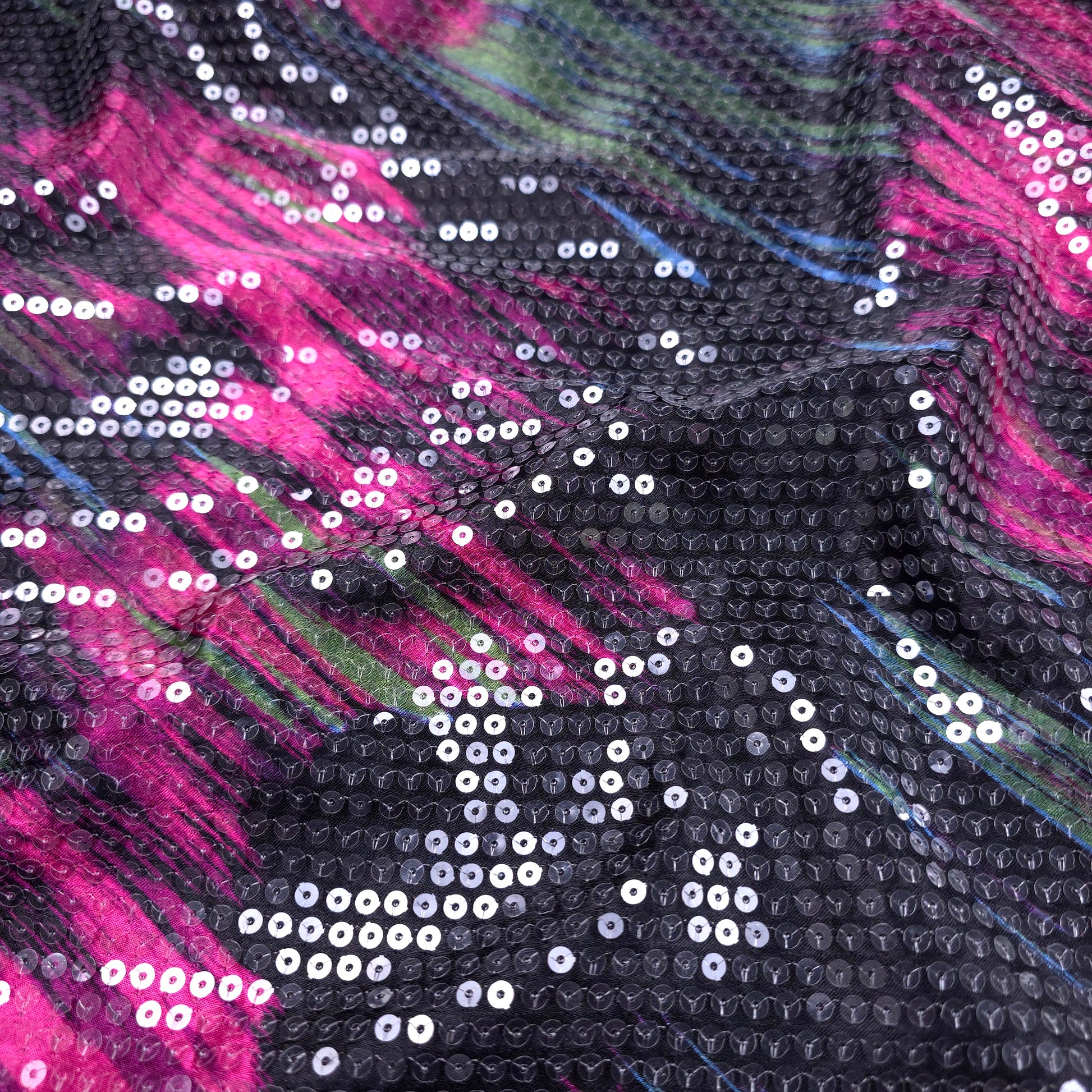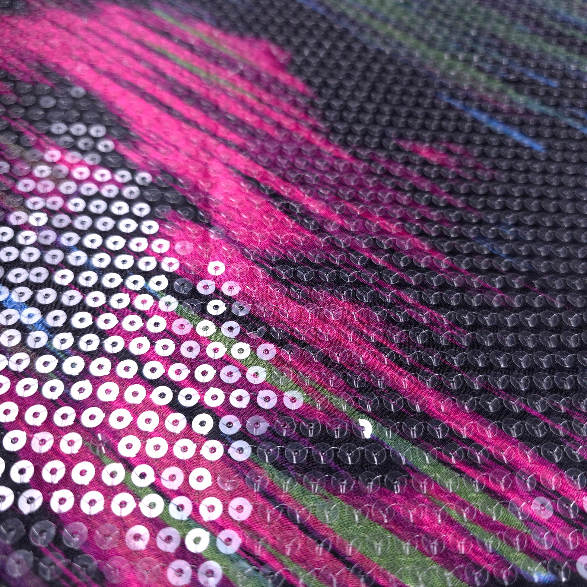 This unique fabric features thousands of clear sequins sewn onto a vibrant printed satin backing. The backing print evokes an 80s/90s pop motif, with abstract brushstrokes of turquoise blue, fuchsia pink, and yellow on a black background. A key detail is the construction: the clear sequins are sewn in square panel sections with a clear thread, and they overlap to create subtle, textured vertical stripes within the design. Please note the specific dimensions for your projects: the fabric has a total width of 56 inches, with the sequined area covering approximately 52 inches, leaving an exposed satin selvage on each side for easy handling. This no-stretch fabric is cut new from the roll and sold by the yard.