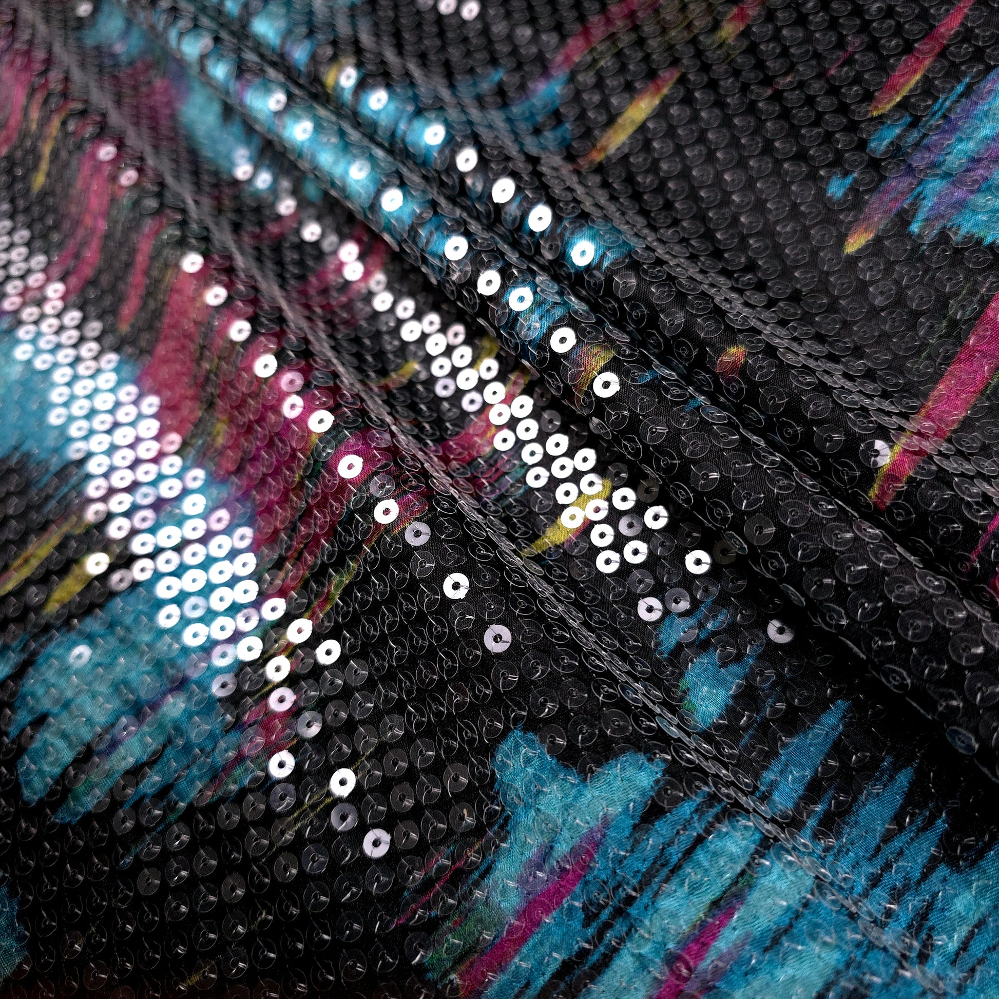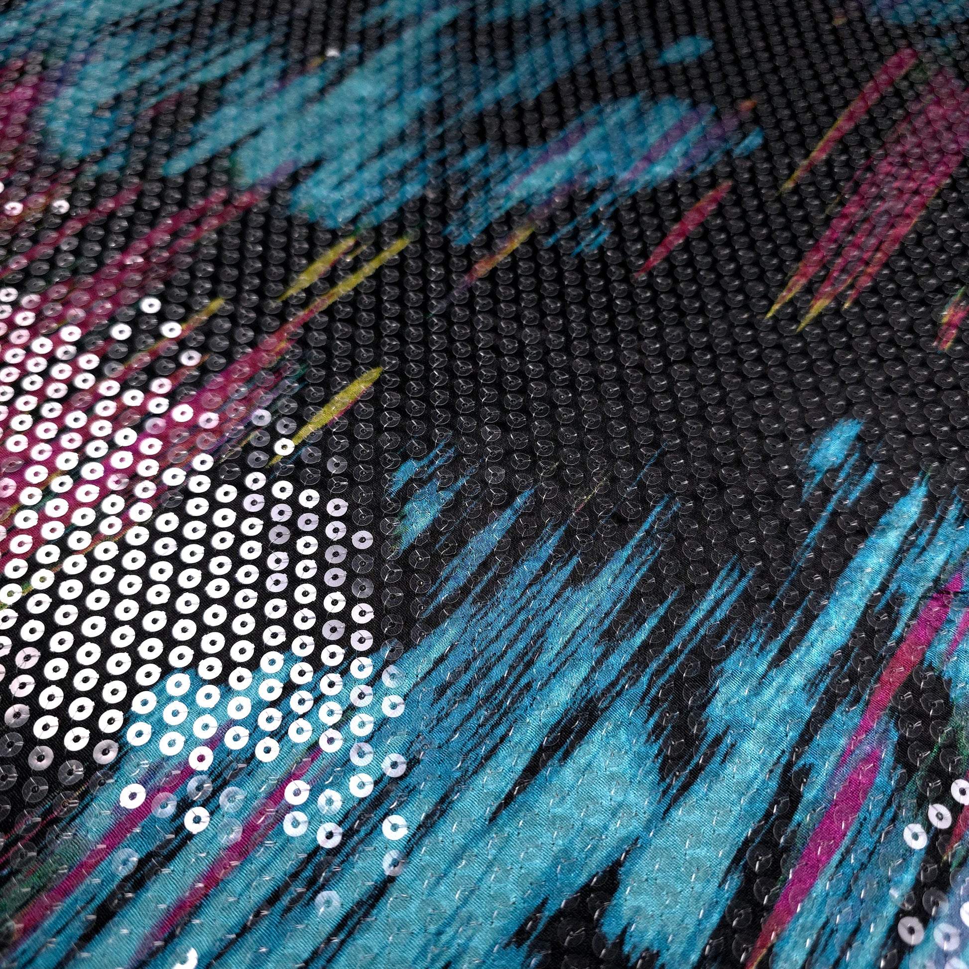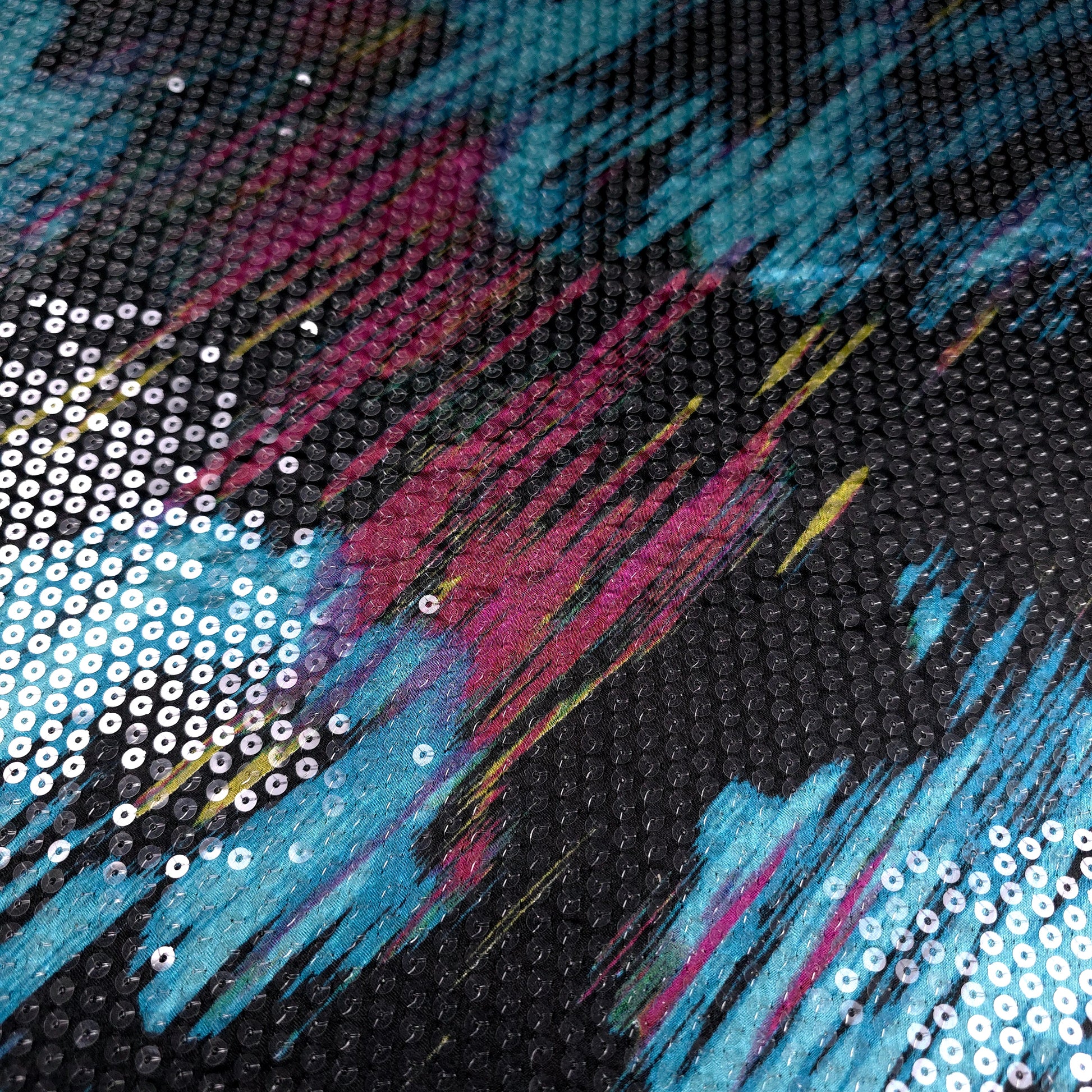 This unique fabric features thousands of clear sequins sewn onto a vibrant printed satin backing. The backing print evokes an 80s/90s pop motif, with abstract brushstrokes of turquoise blue, fuchsia pink, and yellow on a black background. A key detail is the construction: the clear sequins are sewn in square panel sections with a clear thread, and they overlap to create subtle, textured vertical stripes within the design. Please note the specific dimensions for your projects: the fabric has a total width of 56 inches, with the sequined area covering approximately 52 inches, leaving an exposed satin selvage on each side for easy handling. This no-stretch fabric is cut new from the roll and sold by the yard.