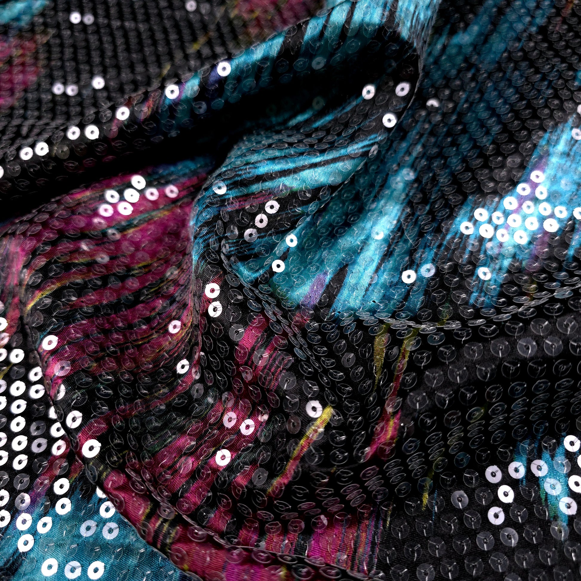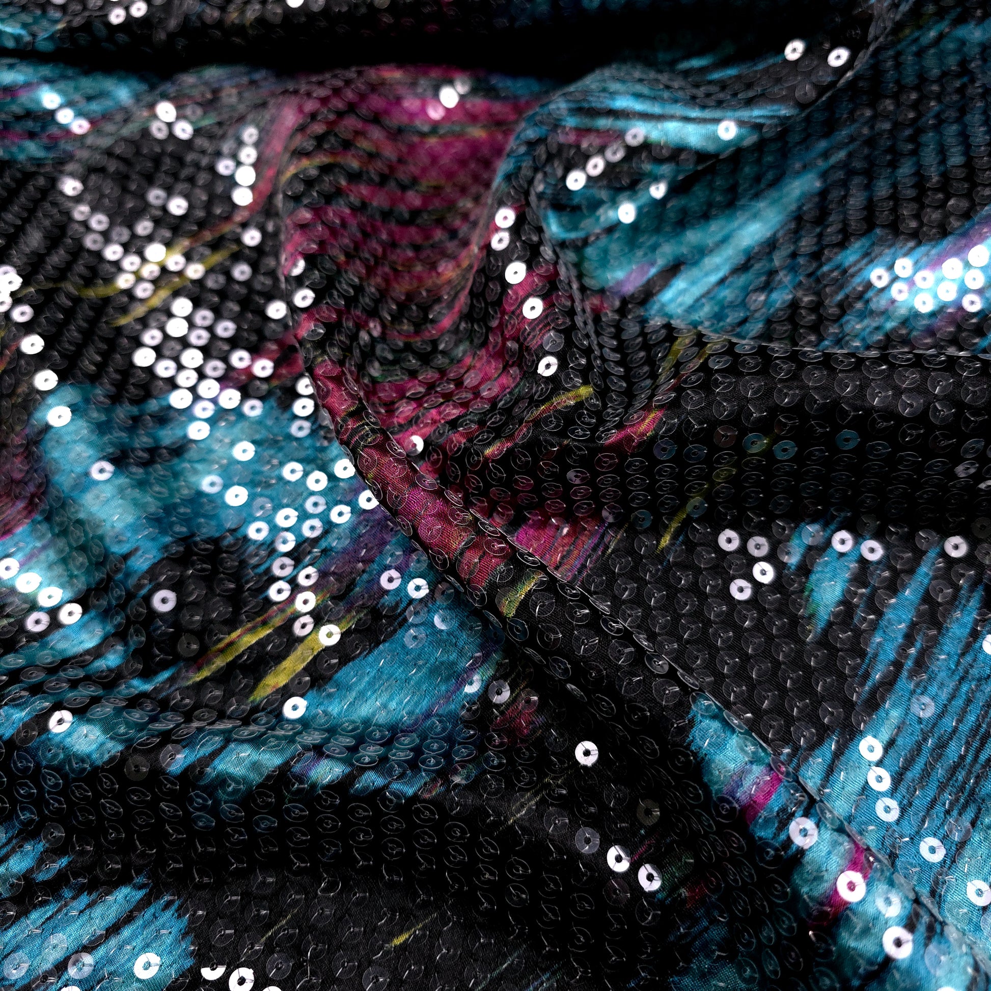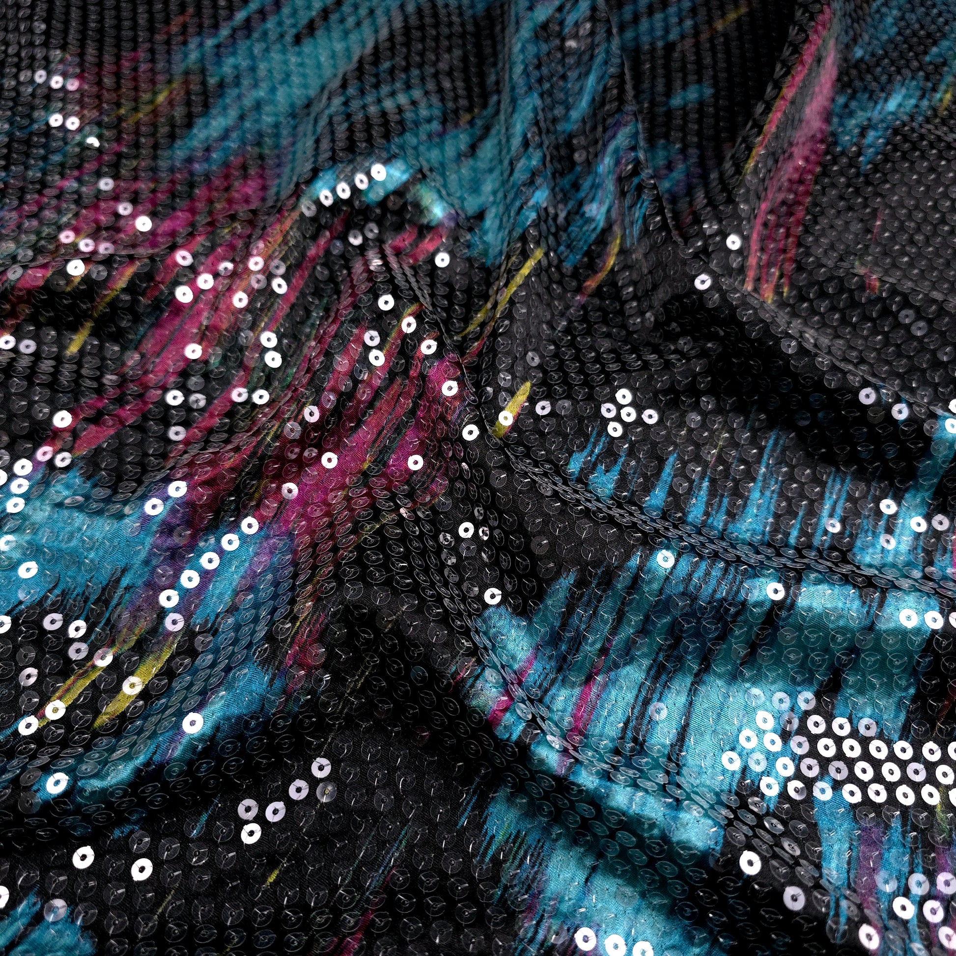 This unique fabric features thousands of clear sequins sewn onto a vibrant printed satin backing. The backing print evokes an 80s/90s pop motif, with abstract brushstrokes of turquoise blue, fuchsia pink, and yellow on a black background. A key detail is the construction: the clear sequins are sewn in square panel sections with a clear thread, and they overlap to create subtle, textured vertical stripes within the design. Please note the specific dimensions for your projects: the fabric has a total width of 56 inches, with the sequined area covering approximately 52 inches, leaving an exposed satin selvage on each side for easy handling. This no-stretch fabric is cut new from the roll and sold by the yard.