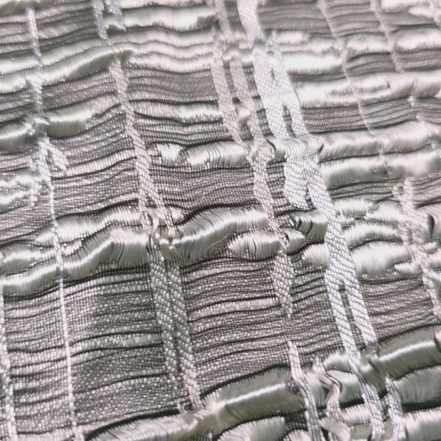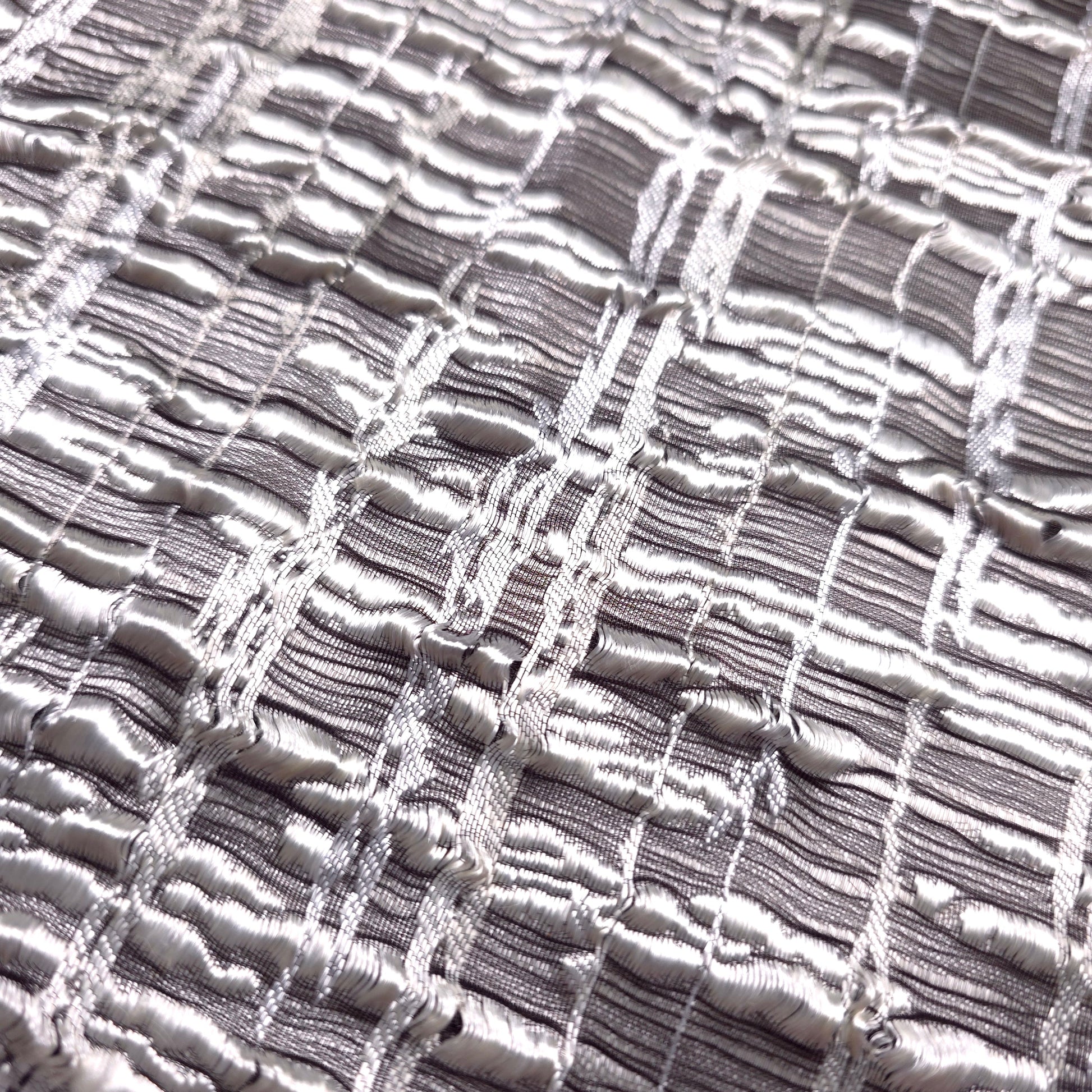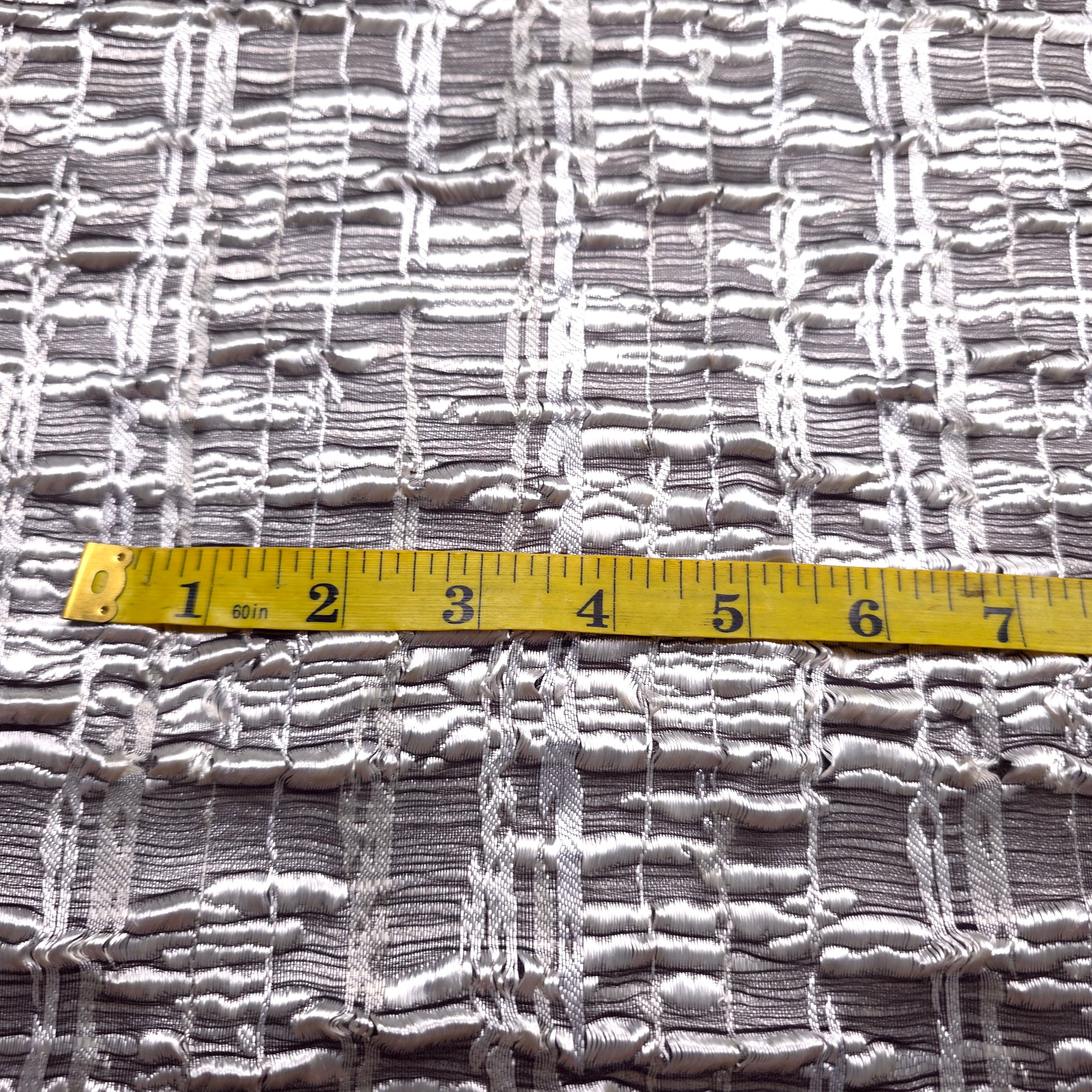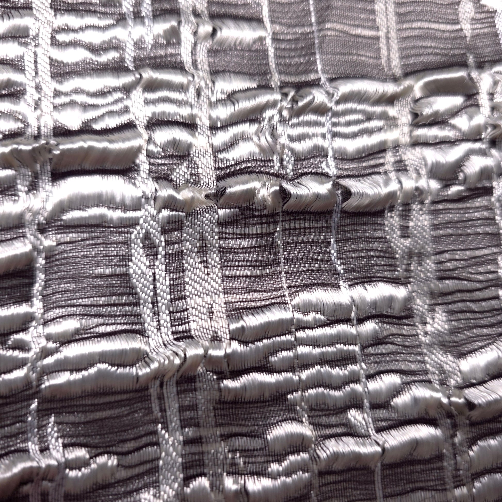 Elevate your interior with our spectacular extra-wide drapery fabric. This material features a sophisticated, three-dimensional texture composed of embossed lines in a shimmering cool-toned palette of silver and taupe. Specifically designed for high-impact applications, its 118-inch width allows for the creation of stunning, seamless drapes that exude contemporary elegance. The medium-weight polyester construction ensures the fabric drapes beautifully, making it a premier choice for designers and homeowners alike.