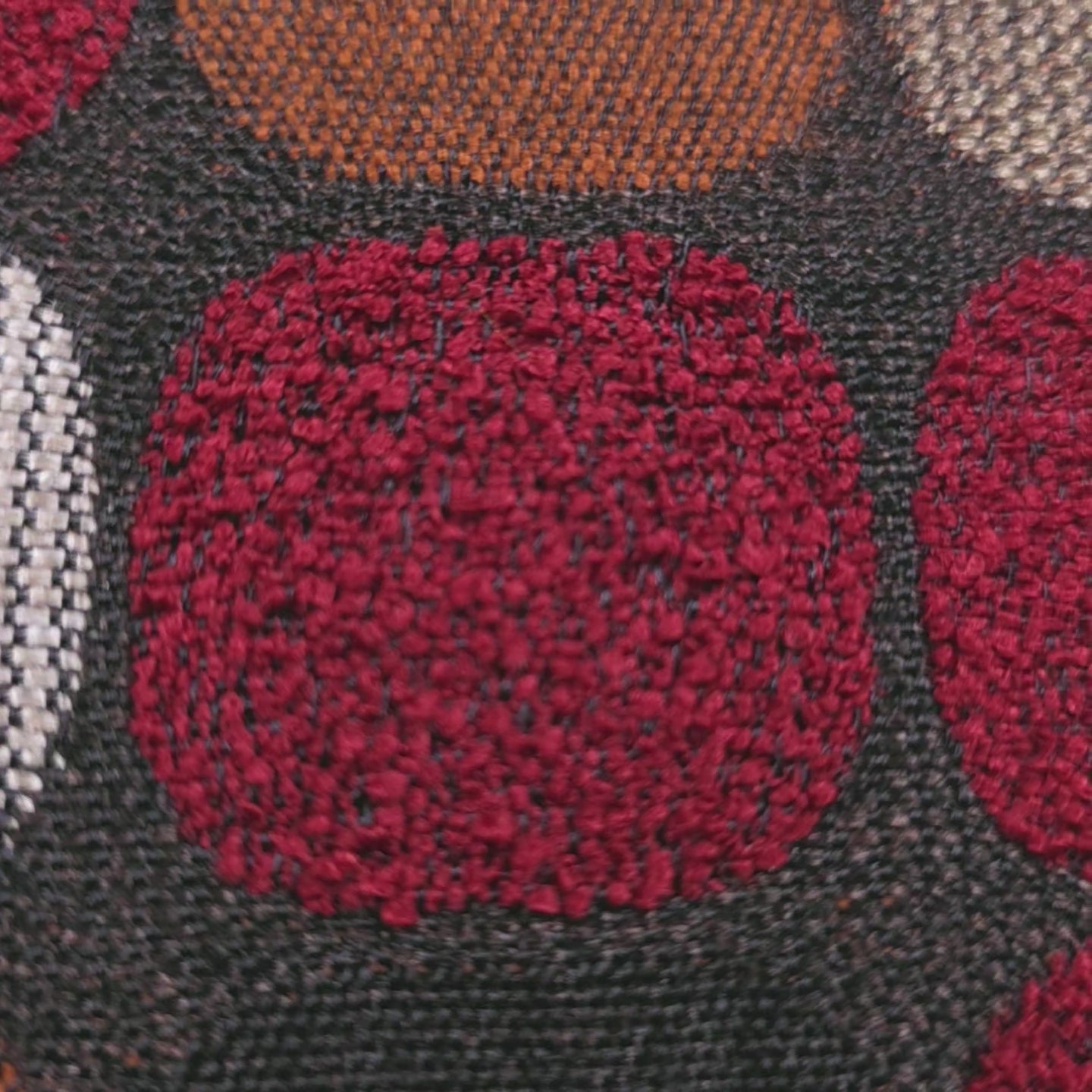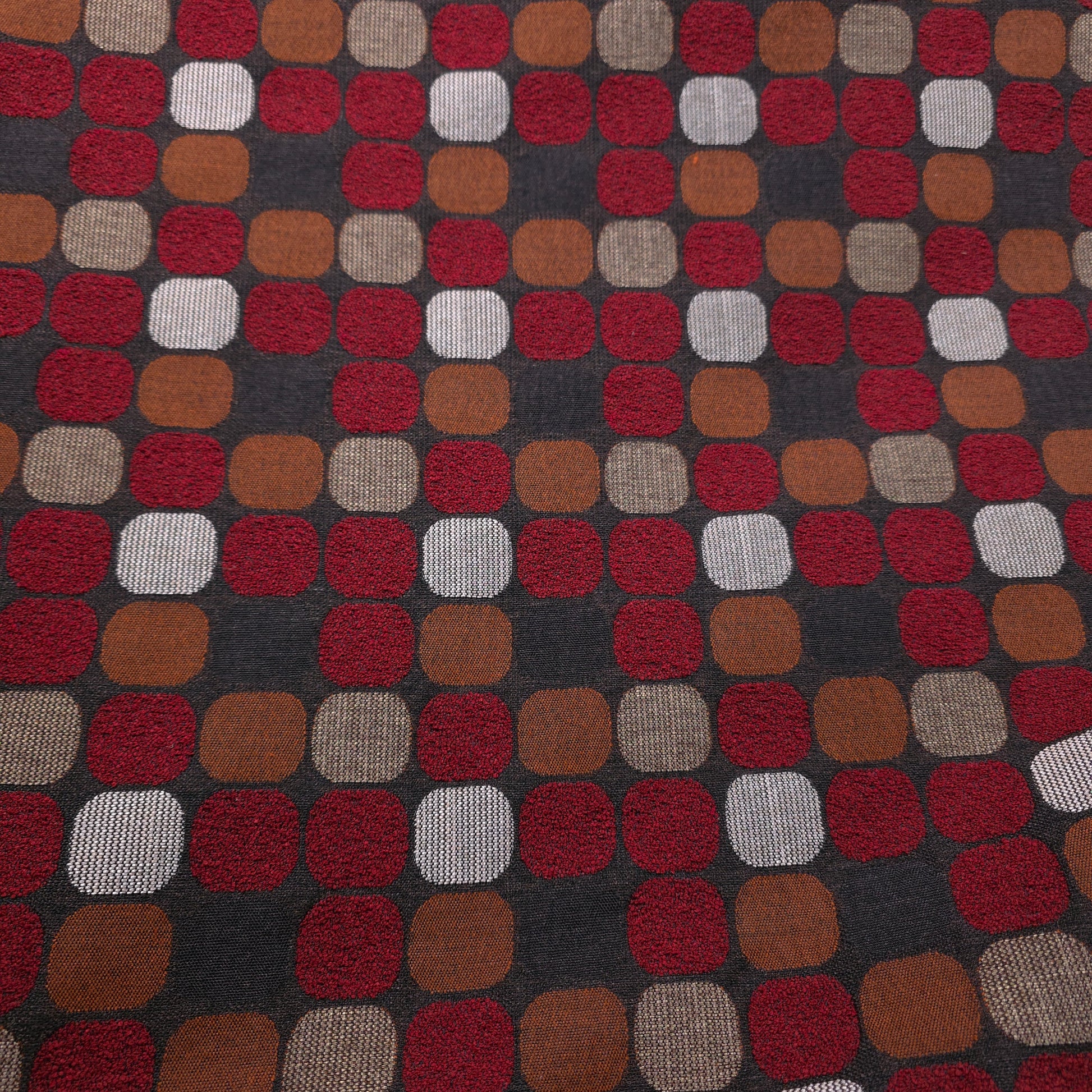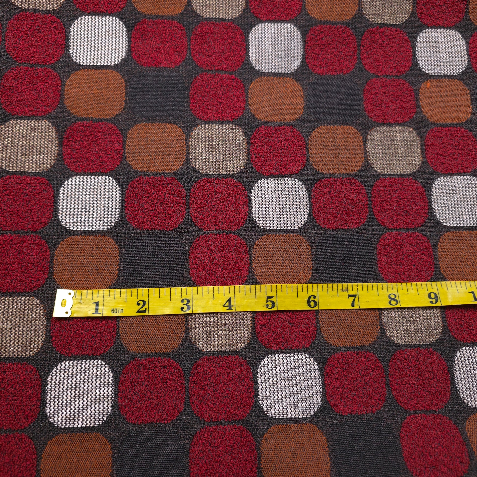 This very heavyweight, durable textile features a woven jacquard pattern of rounded squares in a classic retro color palette of red, orange, and taupe on a charcoal base. The textured, high-quality polyester construction makes it the ideal choice for statement furniture pieces and high-traffic areas, perfectly capturing the spirit of vintage 1950s and 60s style.