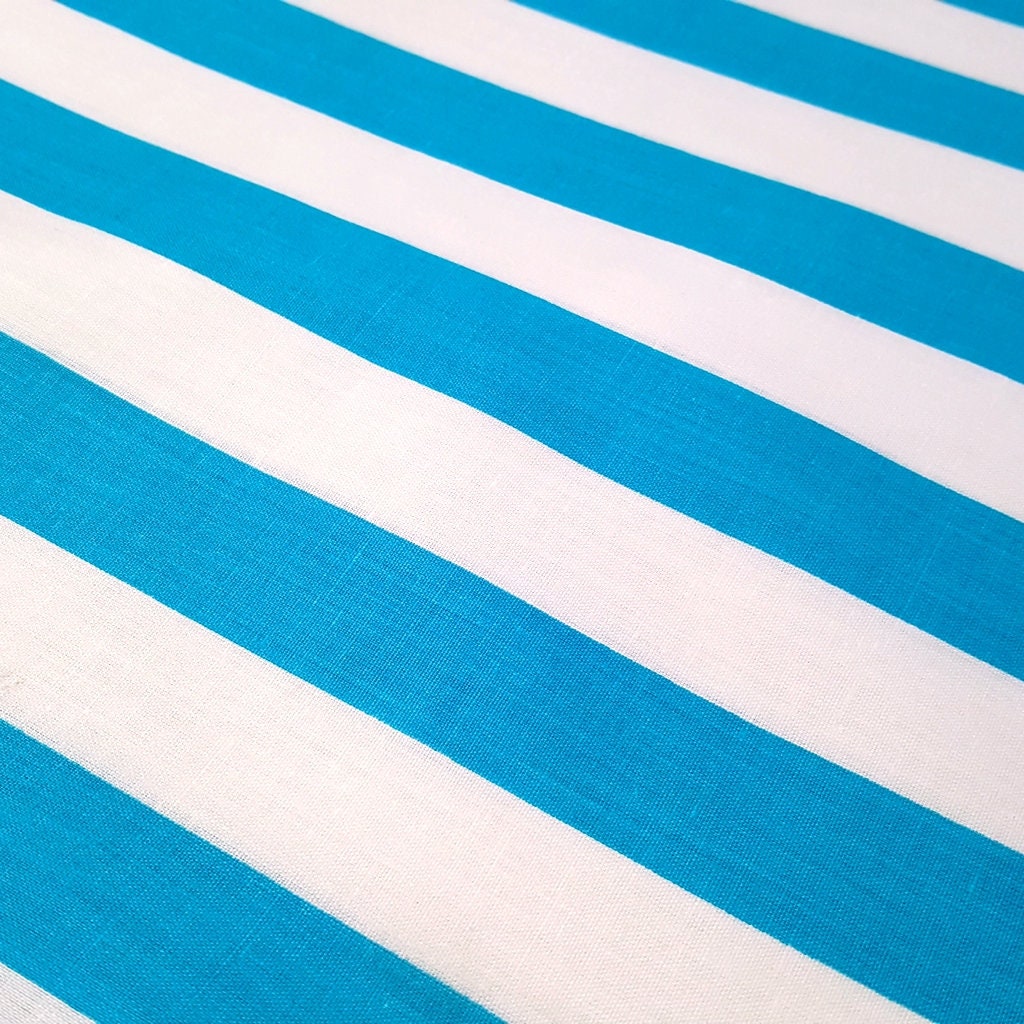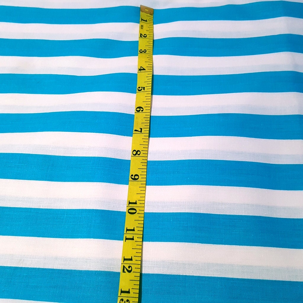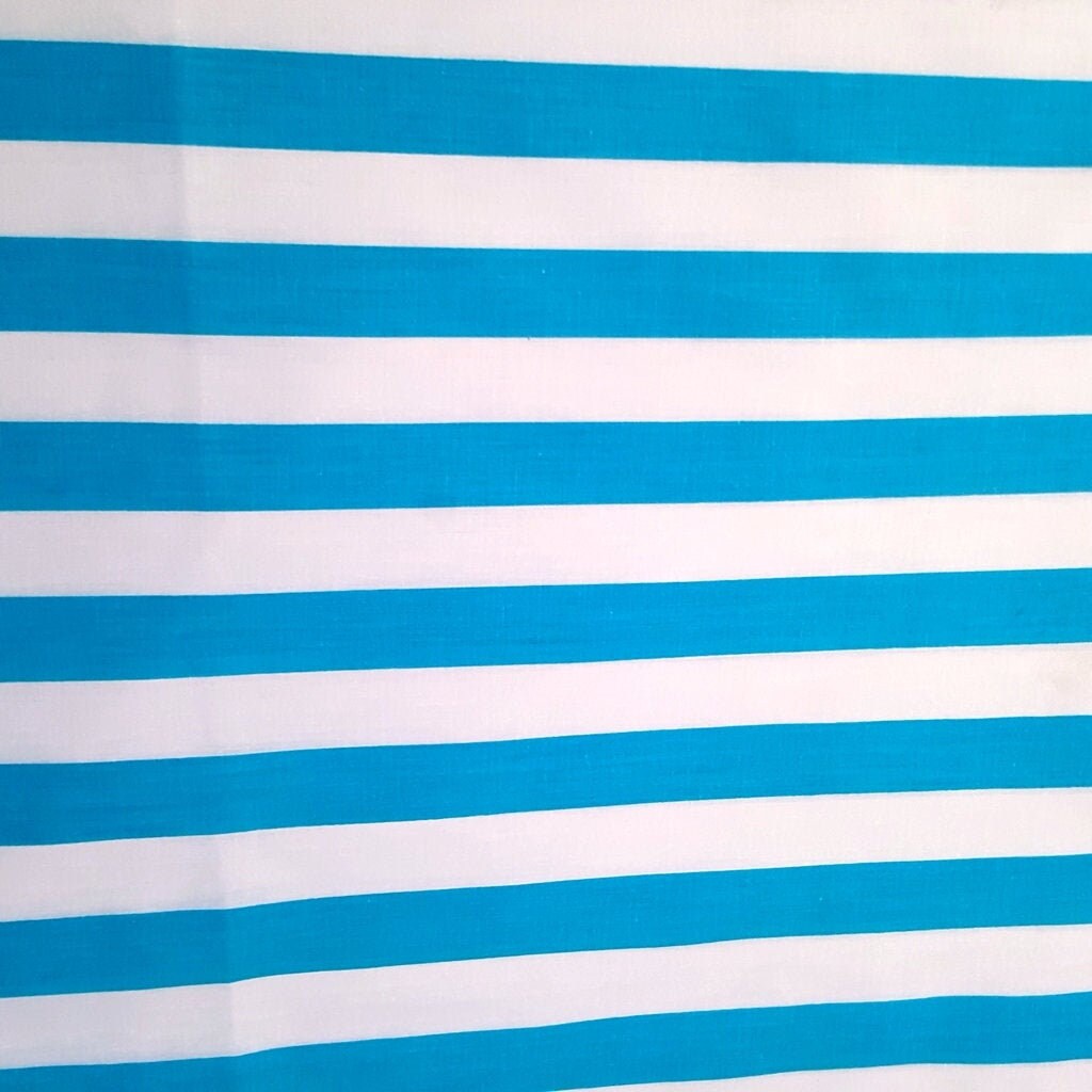 The fabric showcases a one-inch turquoise and white stripe running lengthwise. Made from a lightweight cotton blend, it provides excellent drape and breathability, ideal for various sewing projects.