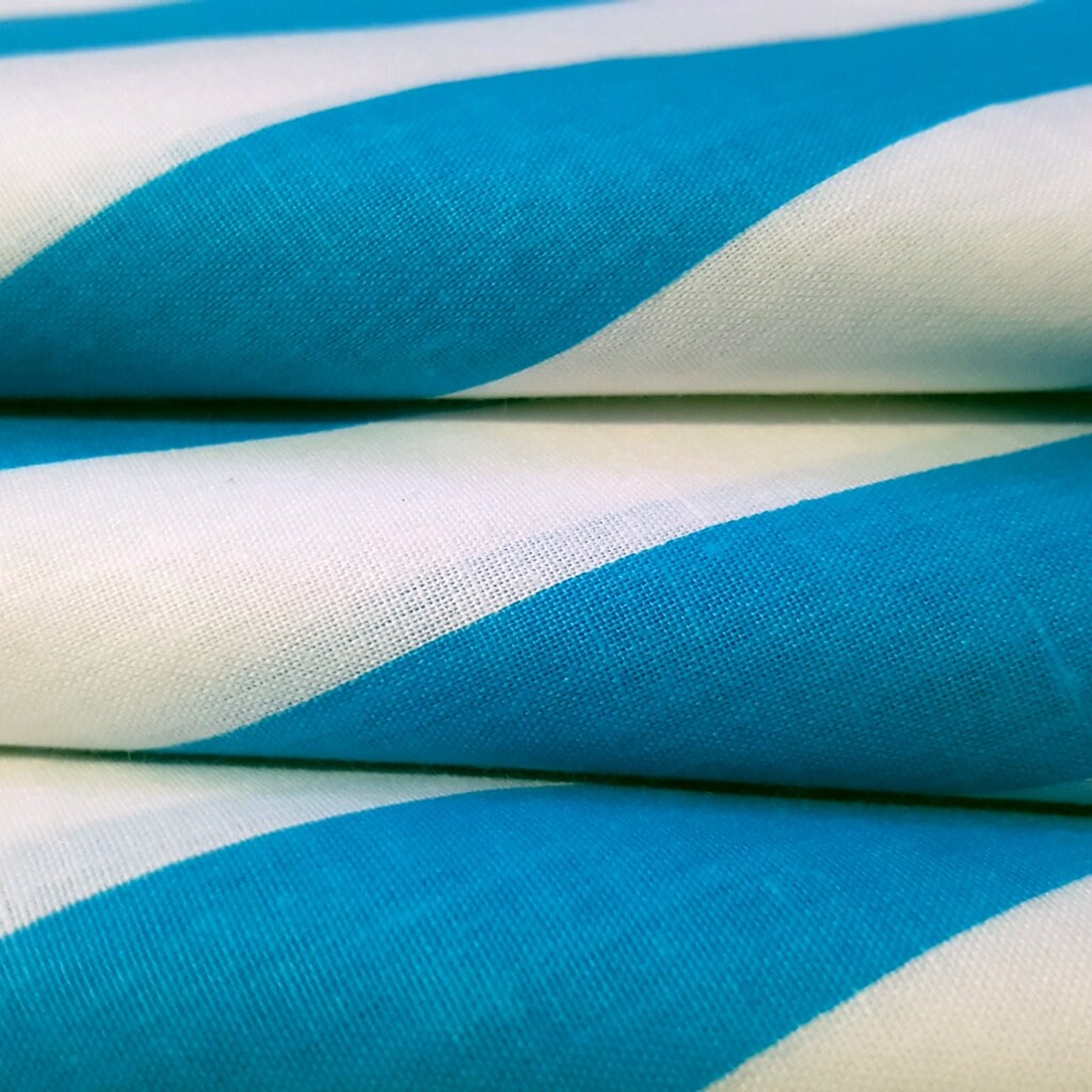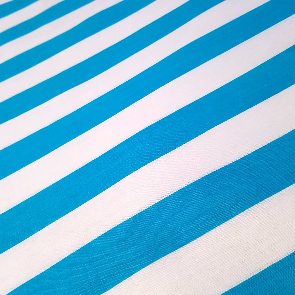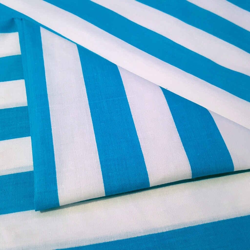 The fabric showcases a one-inch turquoise and white stripe running lengthwise. Made from a lightweight cotton blend, it provides excellent drape and breathability, ideal for various sewing projects.