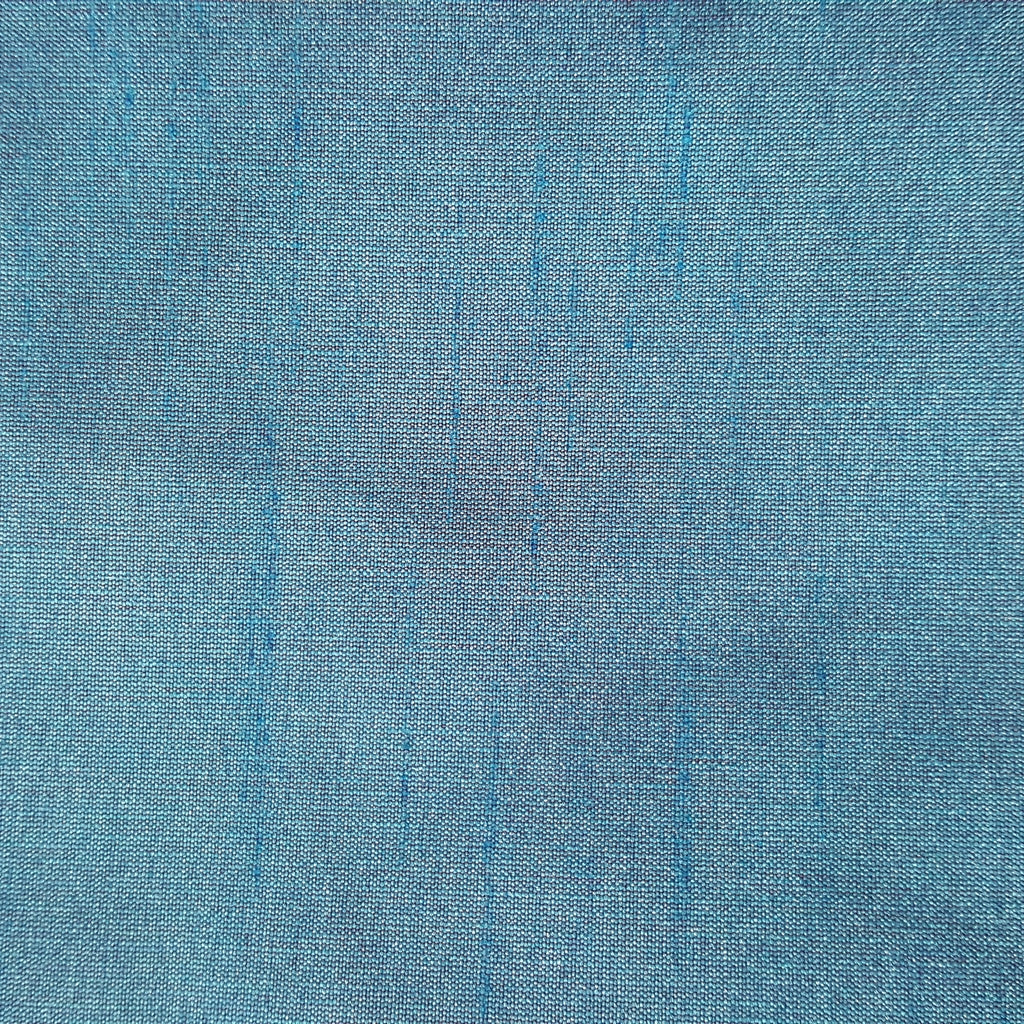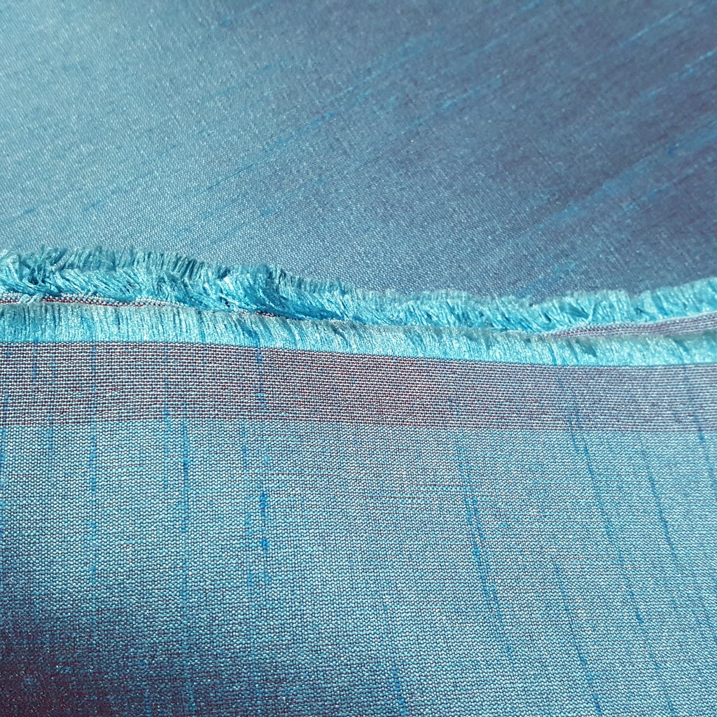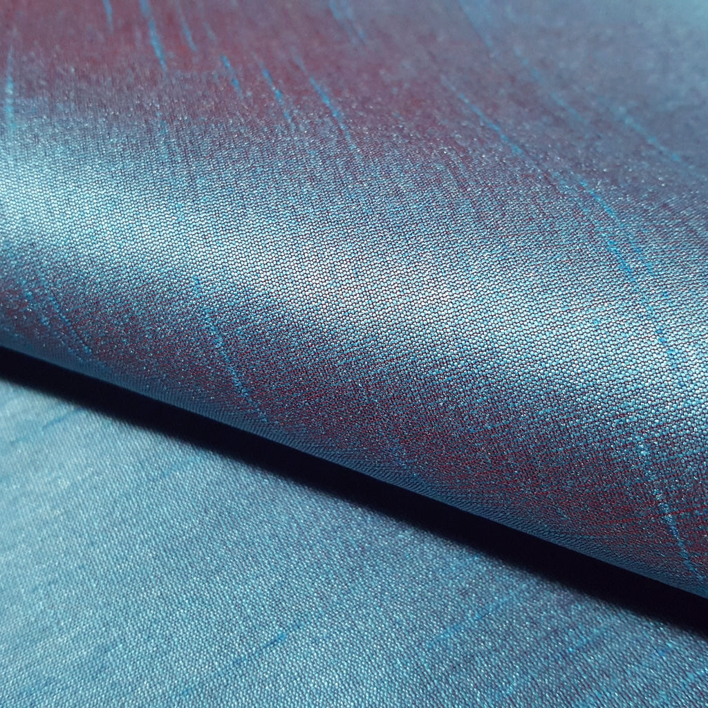 Dupioni fabric is a plain-woven fabric. Using a fine yard on the warp and an uneven yarn on the weft. This creates visual and textural raised thin stripes in the fabric. The thread used here has a subtle sheen to it. giving it a subtle color refracting iridescence.