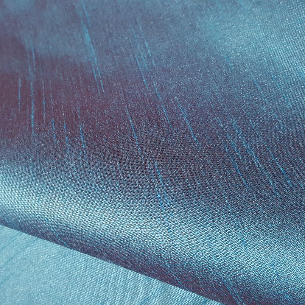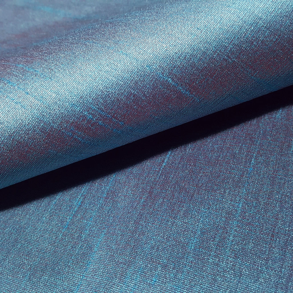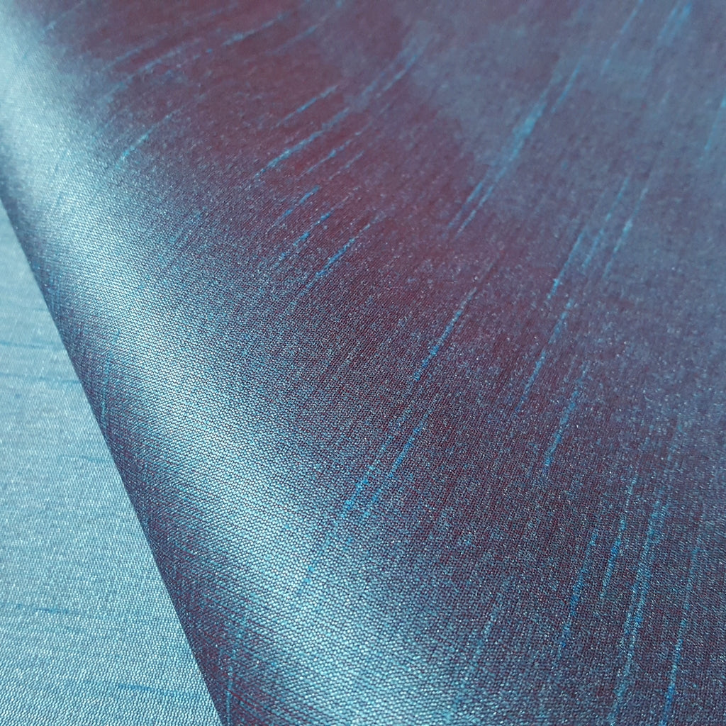 Dupioni fabric is a plain-woven fabric. Using a fine yard on the warp and an uneven yarn on the weft. This creates visual and textural raised thin stripes in the fabric. The thread used here has a subtle sheen to it. giving it a subtle color refracting iridescence.