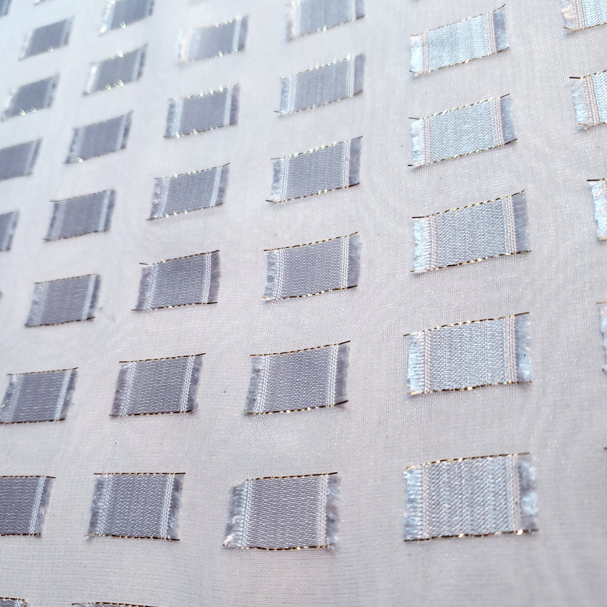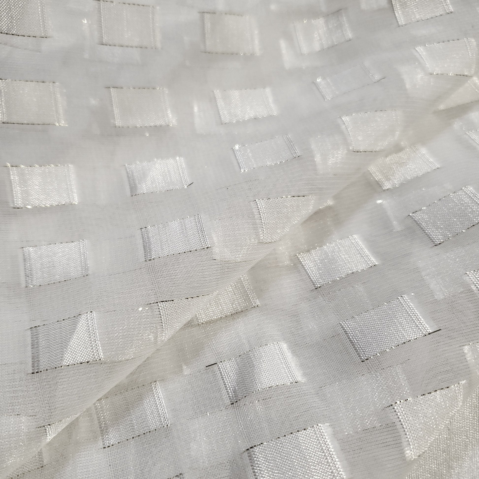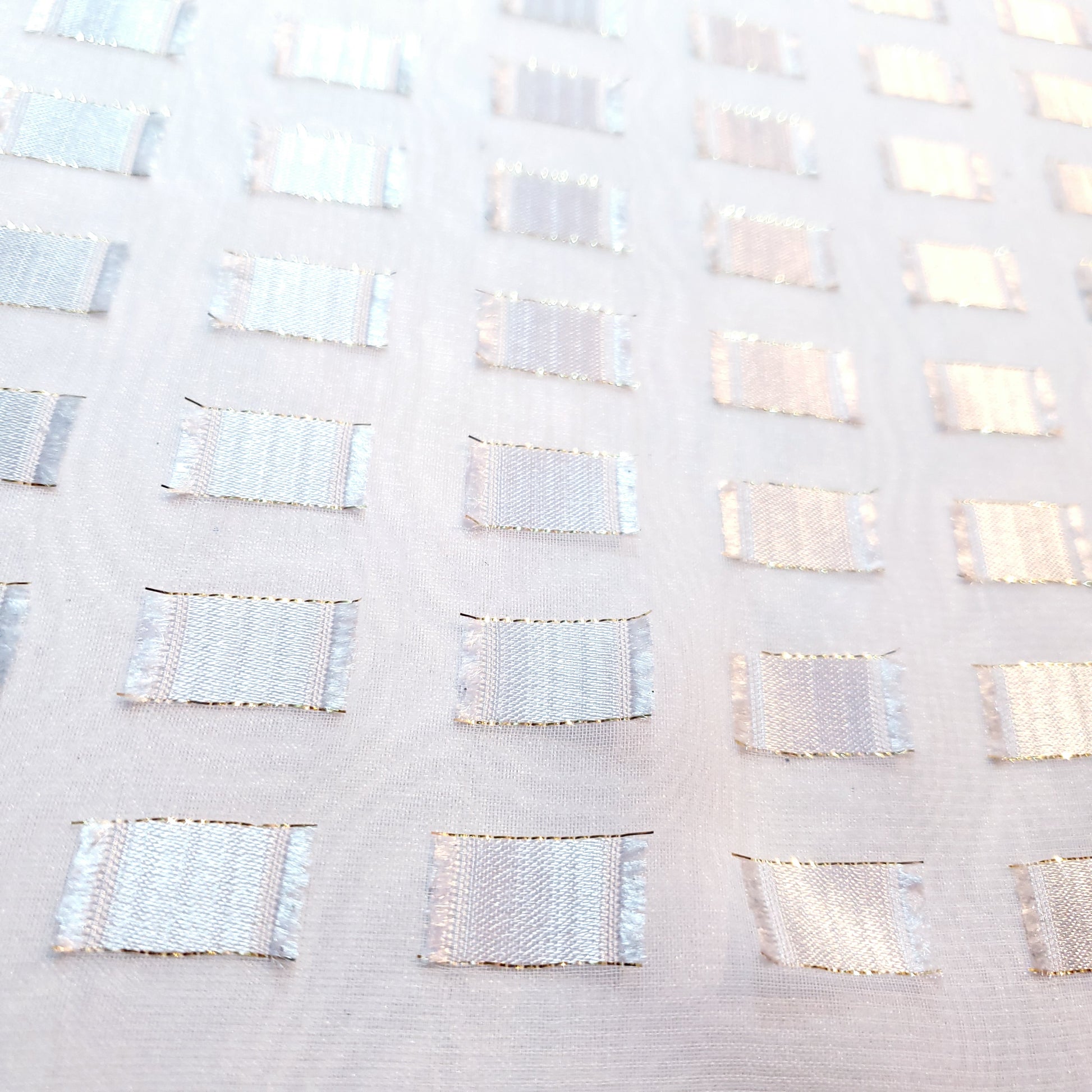 This lightweight sheer voile fabric features a stripe design composed of solid ribbon rectangles on a sheer voile backing. Each rectangle measures approximately 1/2" x 5/8". The longer side has a thin gold metallic stripe on each end and the shorter sides have a slightly frayed edge for added texture.