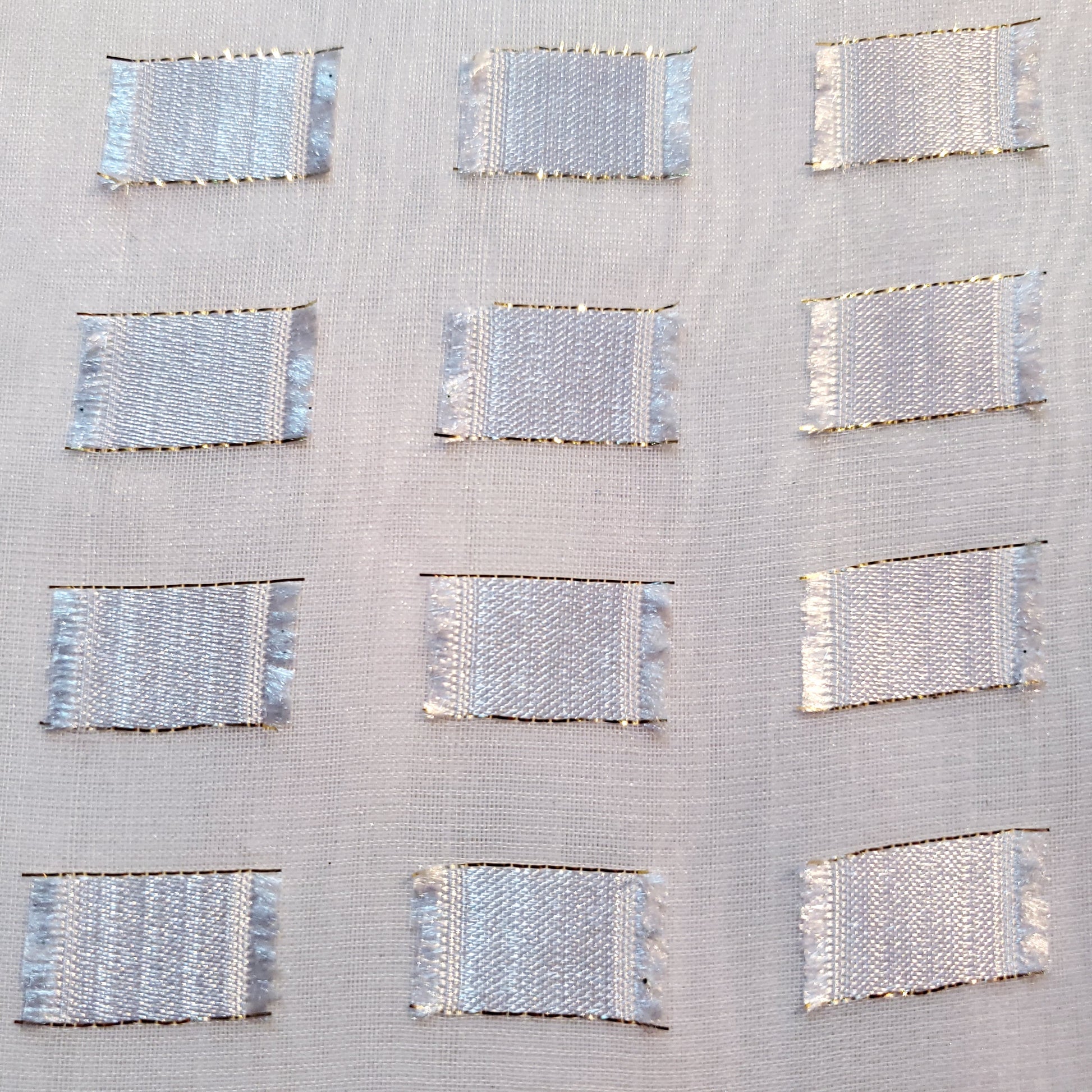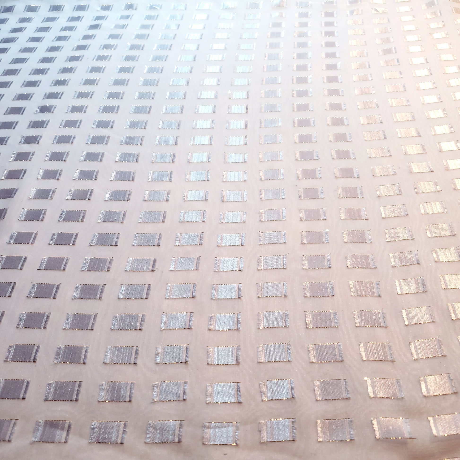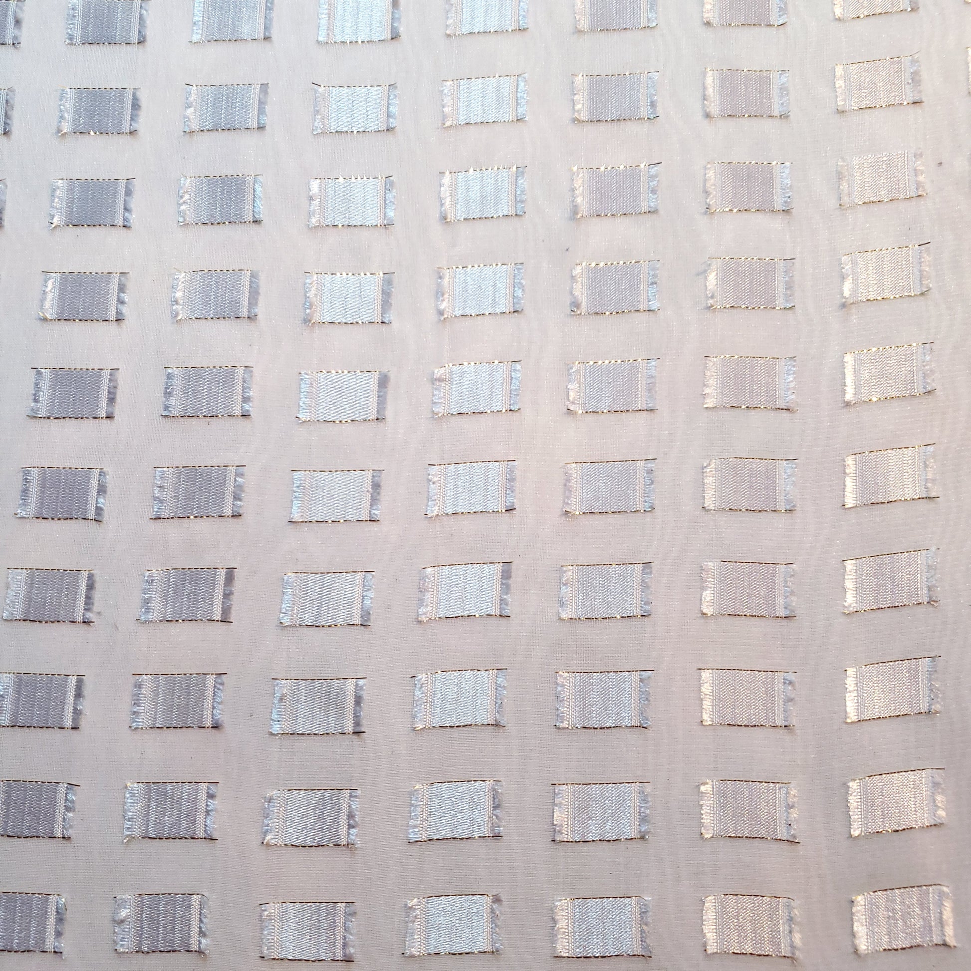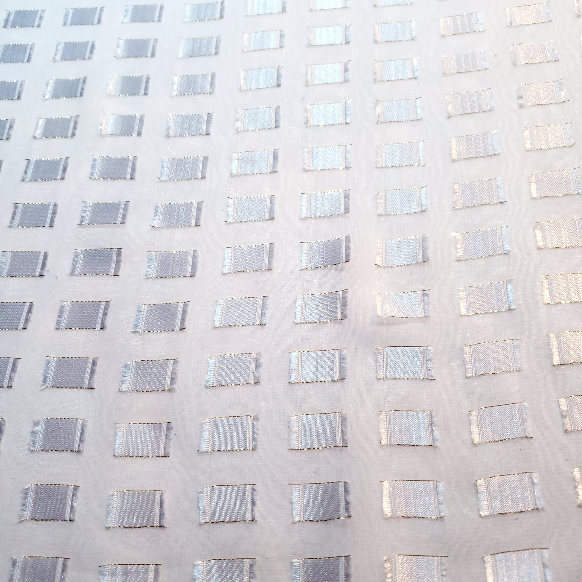 This lightweight sheer voile fabric features a stripe design composed of solid ribbon rectangles on a sheer voile backing. Each rectangle measures approximately 1/2" x 5/8". The longer side has a thin gold metallic stripe on each end and the shorter sides have a slightly frayed edge for added texture.